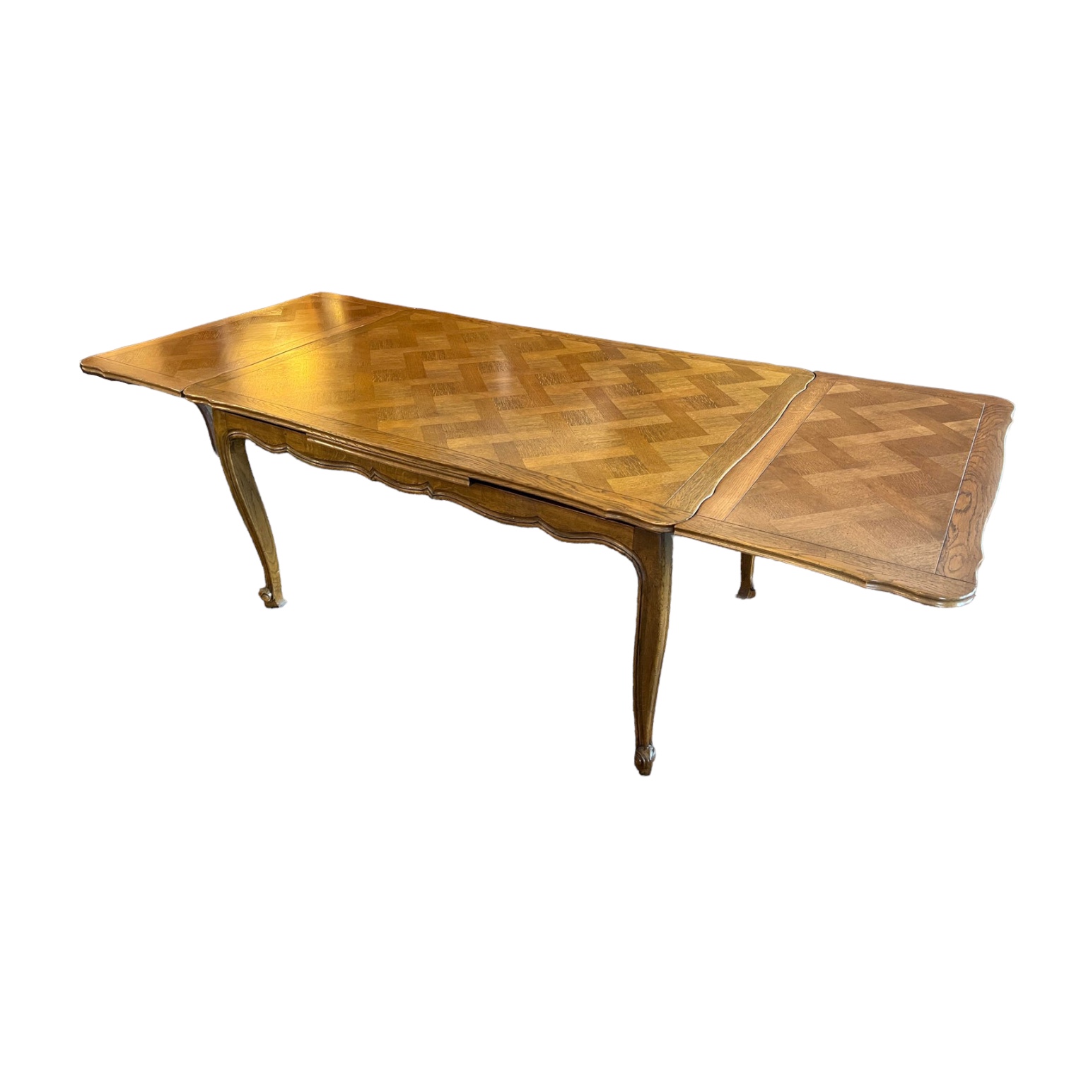 Design Plus Gallery presents a Vintage French Country Extension Dining Table. Boasting a gorgeous parquetry top and four cabriole legs, this table exudes elegance and sophistication. With two hideaway extensions tucked away under the top table surface, this table can easily be extended to accommodate additional guests and is perfect for entertaining. A timeless piece of furniture, this French Country Table will be the focal point of any dining room. Good condition with some minor wear consistent with age and use.