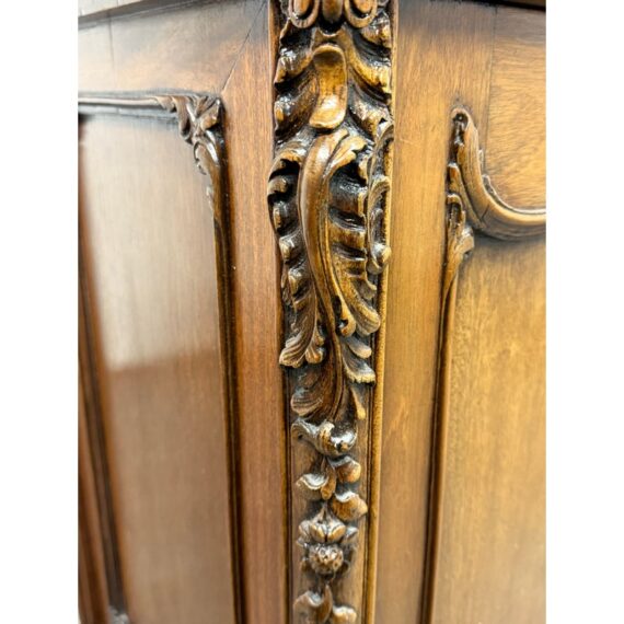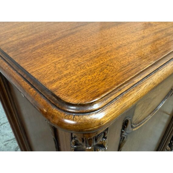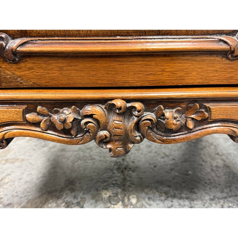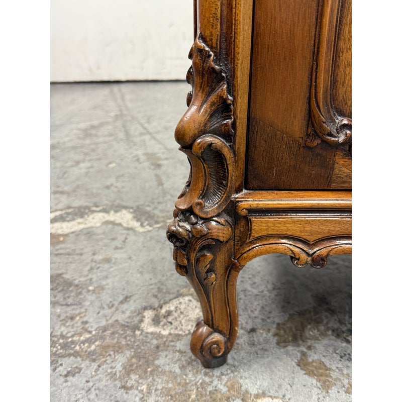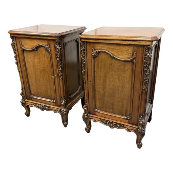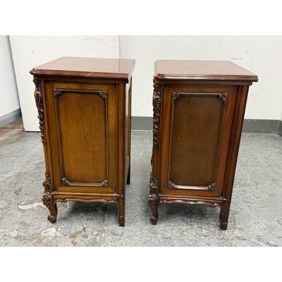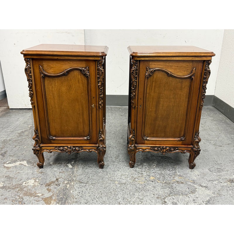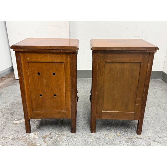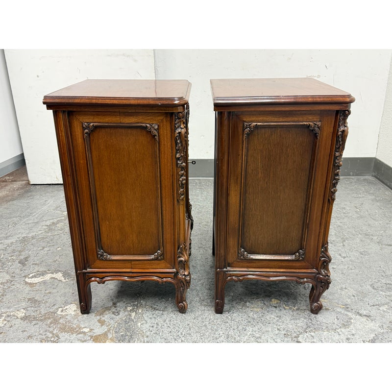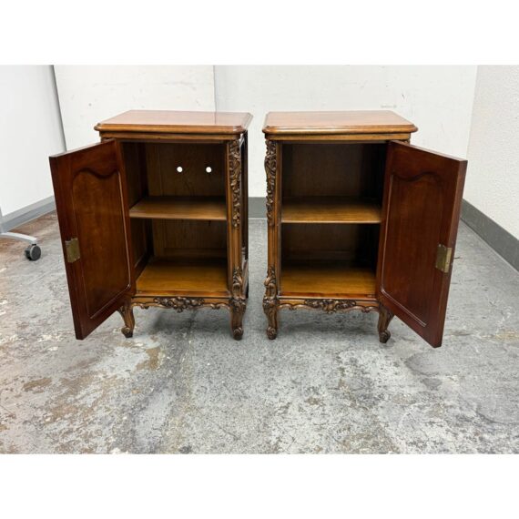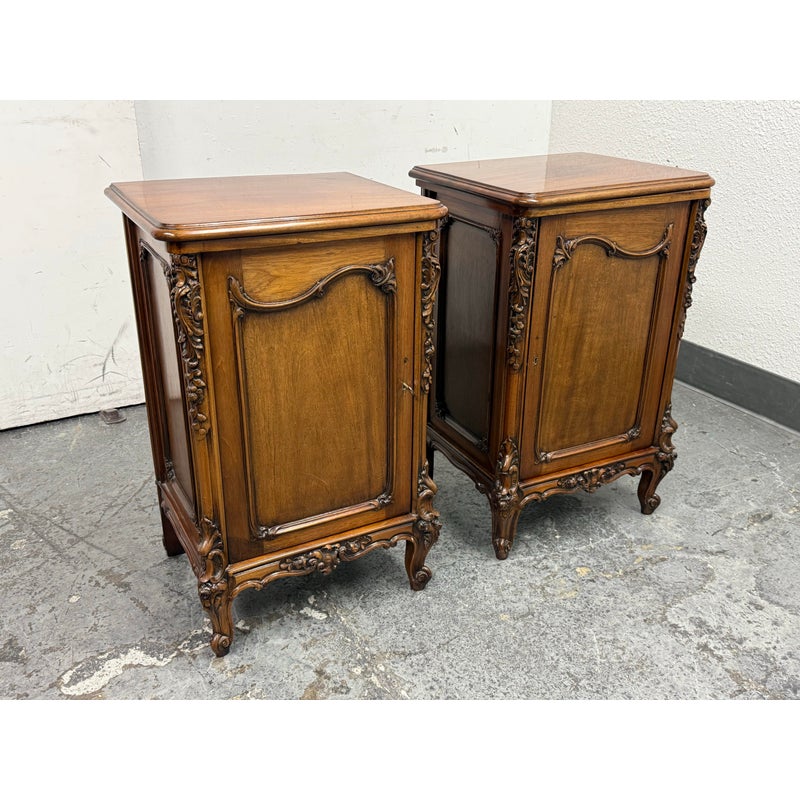 Design Plus Gallery presents a Pair of Nightstands of Unknown Make with French Country Appeal. They are carved from wood solids throughout and give a look of casual regality. They are in functioning condition with two cupboard doors that open to reveal inner shelving. There are multiple minor areas of disrepair that would make great refinishing project. To note; broken wood carved detail work, a loose top surface on one stand and holes for cord management on the other nightstand.