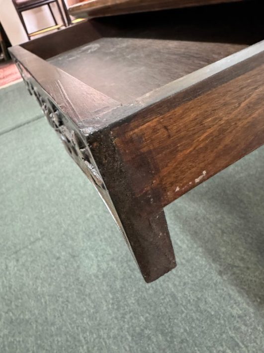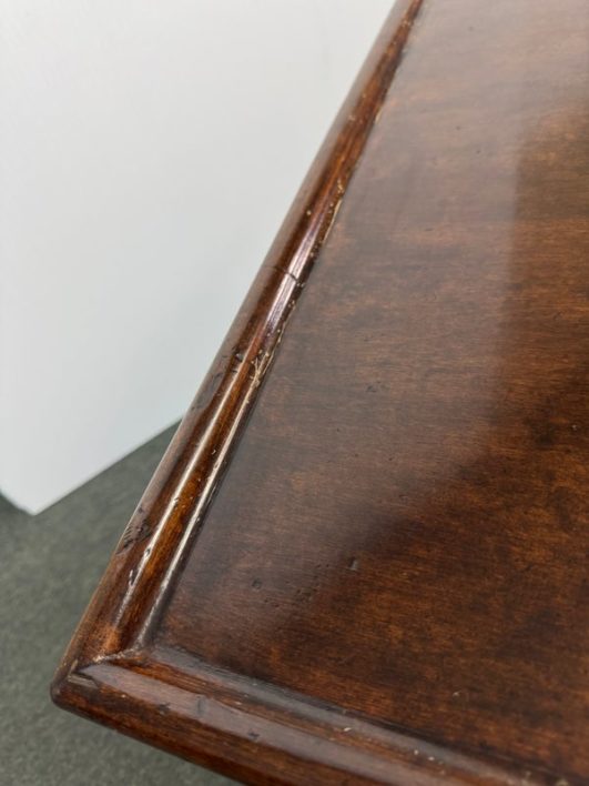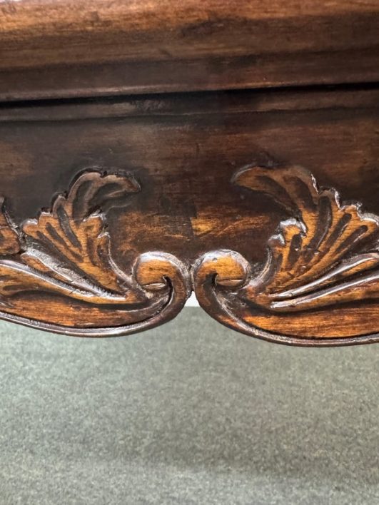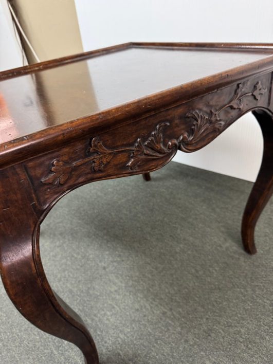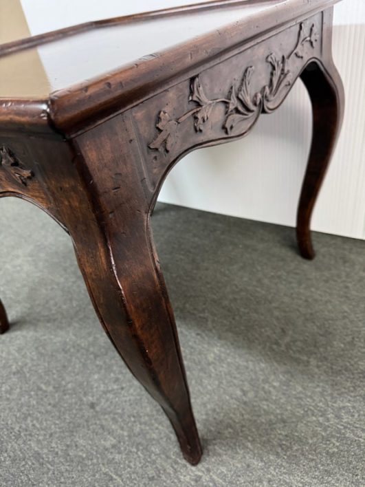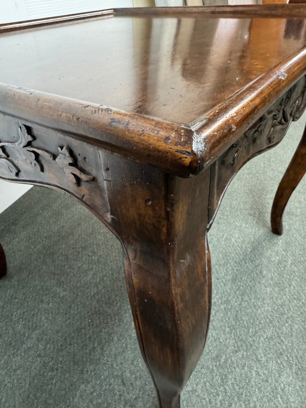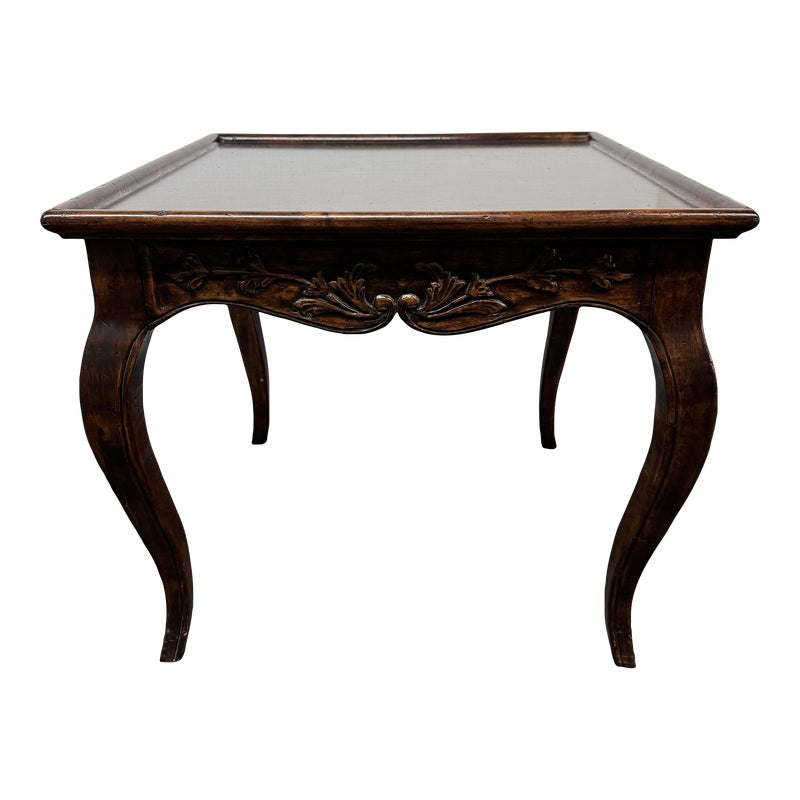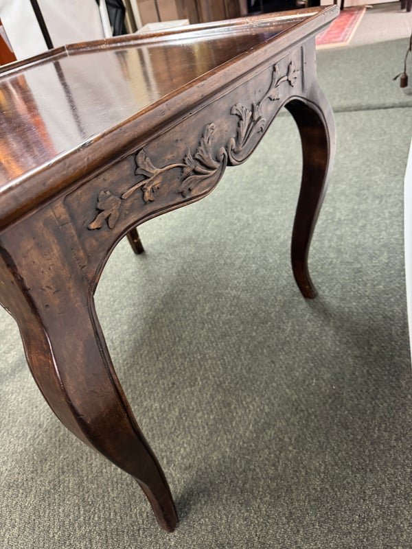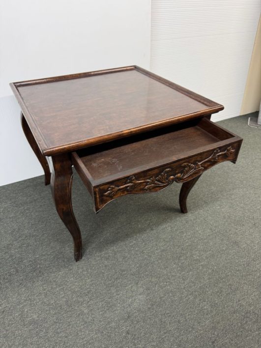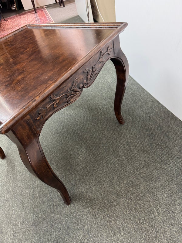 Design Plus Gallery presents a Vintage French Country Side Table. Beautifully grained fruitwood surface truly sets the stage with this classic and elegant end table.The apron is embellished with carved flourishes and vines, the softly curving legs add style. Hidden drawer in apron. Visible and minimal surface wear; condition is good for age and use.