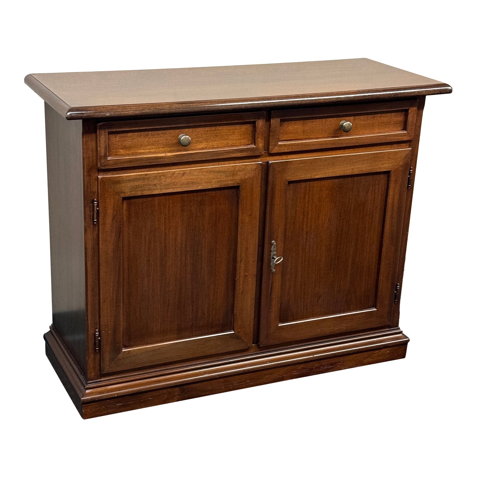 Design Plus Gallery presents a Vintage French Country style Sideboard. The compact scale and unobtrusive panel embellishment allow the simple cabinet to work in many settings and used for many storage functions. A pair of shallow drawers and a shelved compartment offer efficient storage and serving space. Light surface wear; condition is good for age and use.
