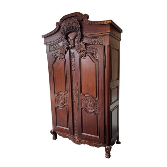 Design Plus Gallery presents a French Louis XV Wood Armoire. A stunning piece of furniture crafted from solid woods with intricate details that showcase its elegant design. The armoire features two large doors with a canopy adorned with beautifully carved roses. Modified with access for cord passage, making it ideal for use as an entertainment center or component storage. The interior provides two removable shelves for linens, or other items. The inside of doors have mirror panels with silk cord trimming, giving it a touch of glamour. While there is a crack in the join of the right leg, this does not affect the function. This armoire is a timeless piece that will bring usefulness, charm and elegance to any room. Surface wear evident; condition is fair for age and use.