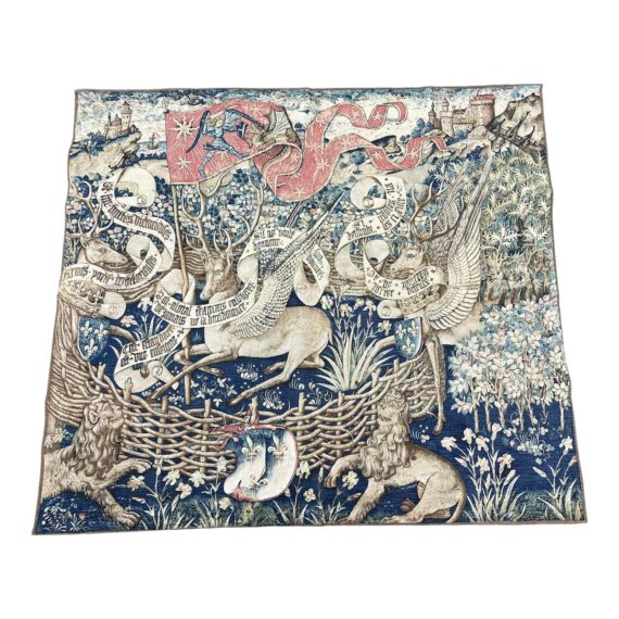 Design Plus Gallery presents a Vintage French Medieval Tapestry Reproduction. Printed cotton face is backed and ready for hanging with rings on the top side. Historic setting has been re-produced and printed in a deep blue and neutral palette. Minor wear through out, tapestry is in good condition. Made in France.