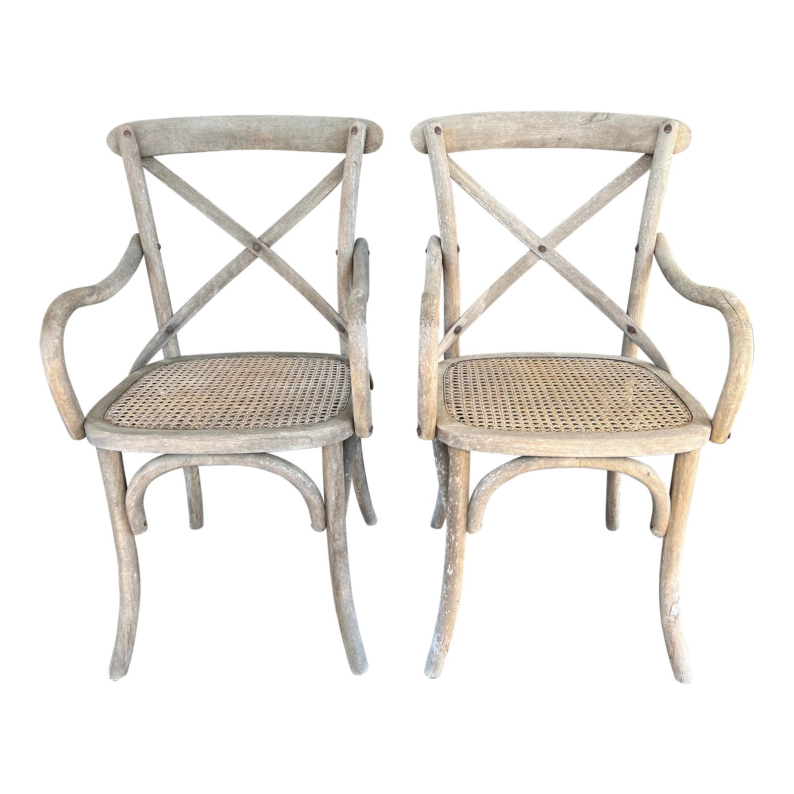 Design Plus Gallery presents a Vintage Pair of French Provincial Chairs. Packed with history and charm, the pair feature classic cross back, sanded seat and bentwood arms. The chairs have been used outside and have a weathered appearance. Vintage condition is consistent with age and use.