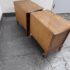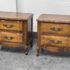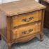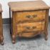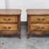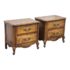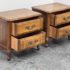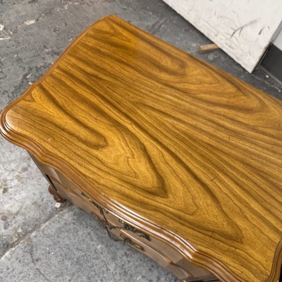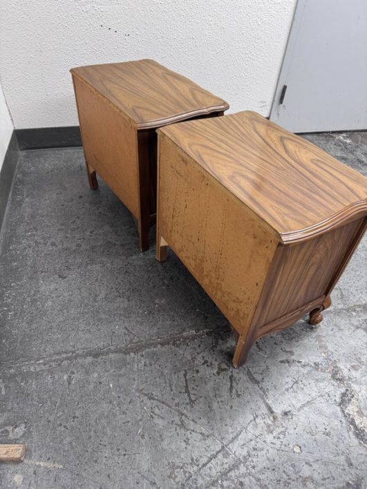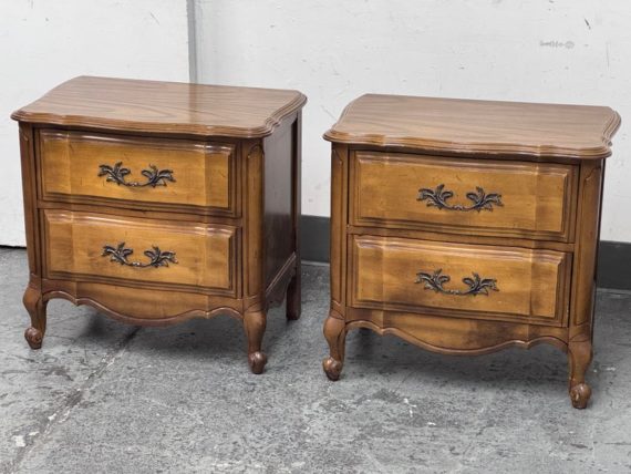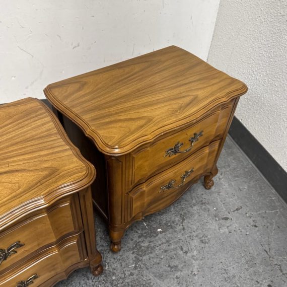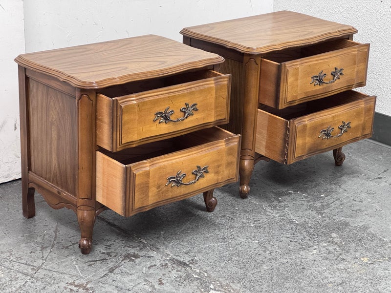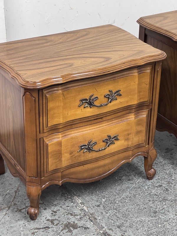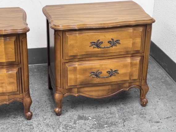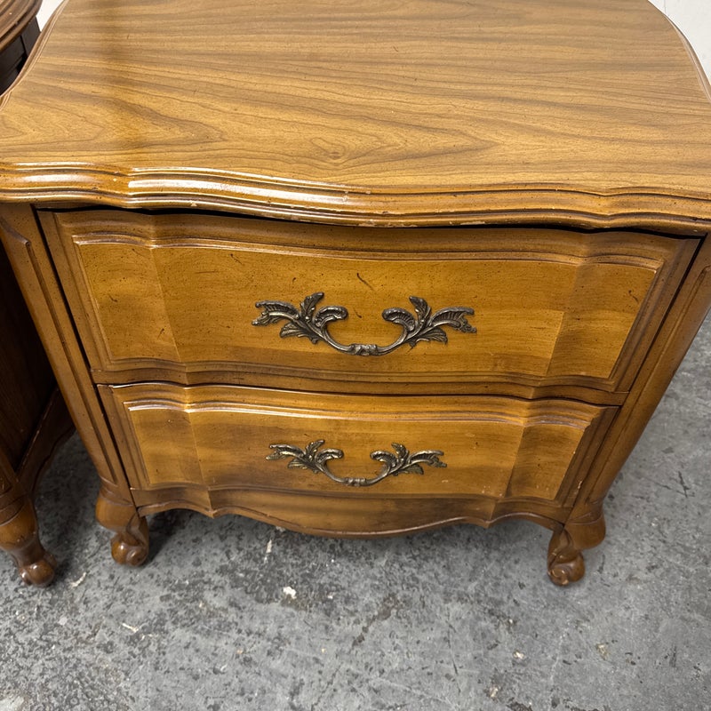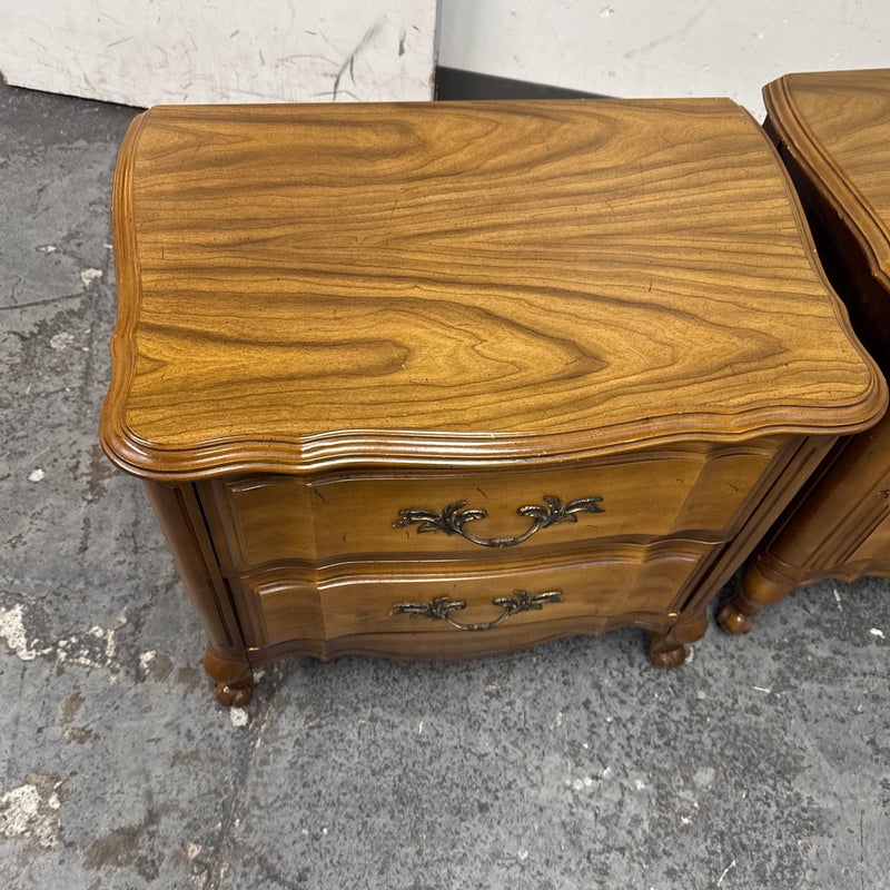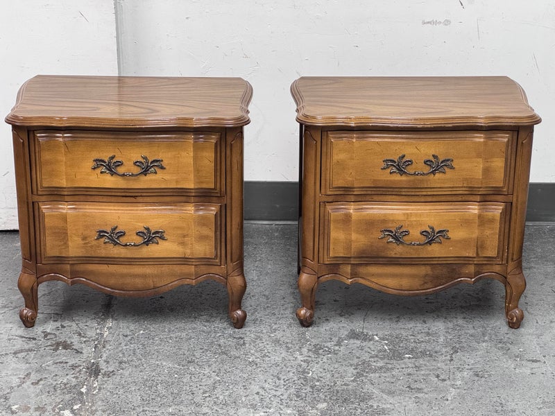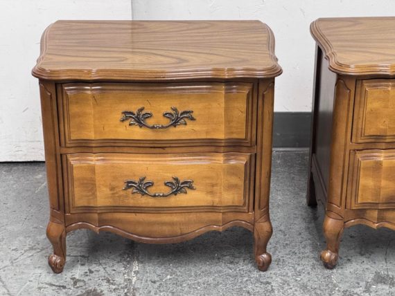 Design Plus Gallery presents a Pair of French Provincial Serpentine Night Stands of a Vintage Age. The facade is made of solid Oak wood veneer with original brass hardware. There are two wide drawers and they are identical in appearance. The rest upon cabriole legs. Sun damage is present but overall is in good condition. Visible and minimal wear from usage + age.