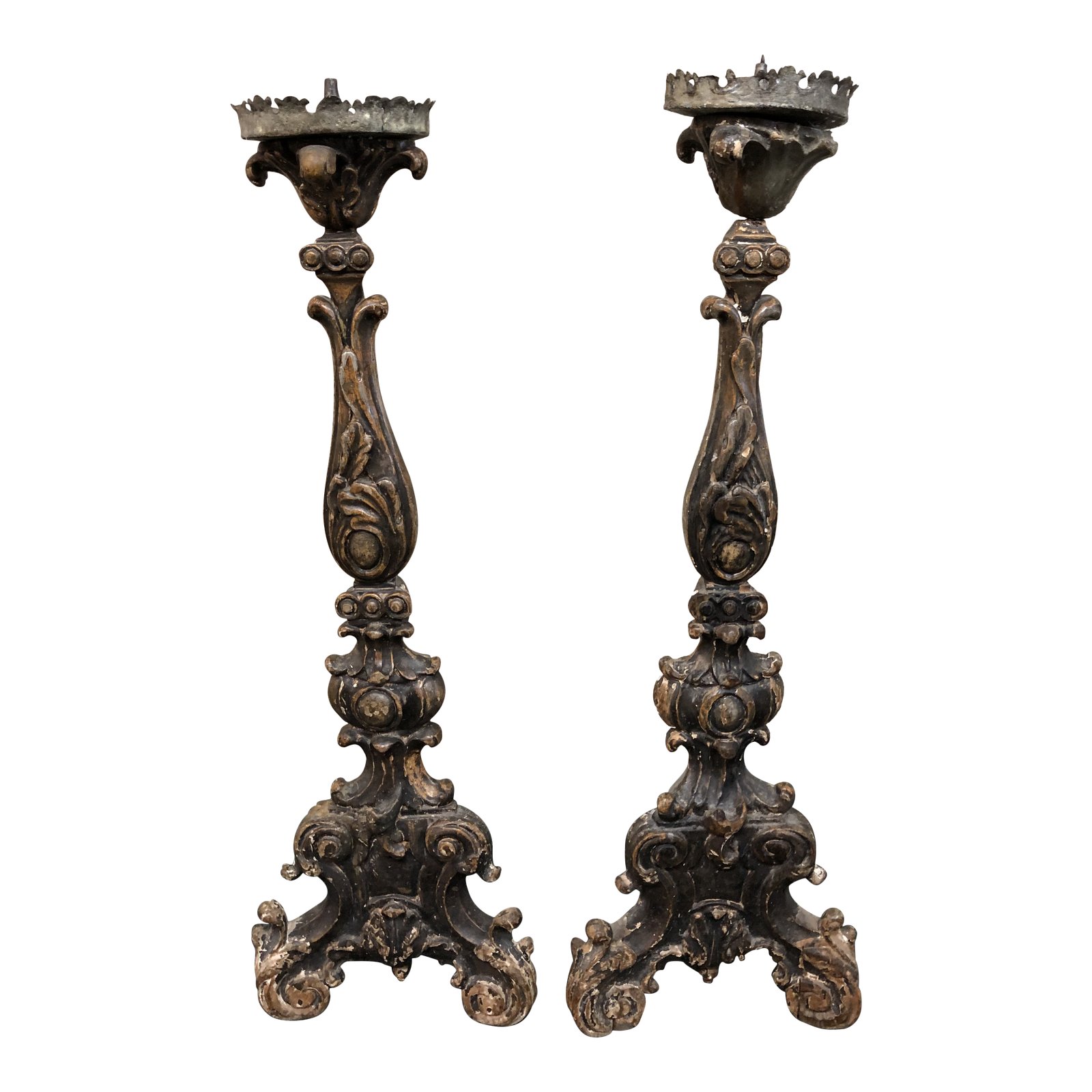 Design Plus Gallery presents a pair of Vintage French Candle Holders. An old world gem for modern day. Hand carved frames with intricate carvings with three legs. Natural distressing with age. On top are metal plates with cut trimming with spikes holds the candle.