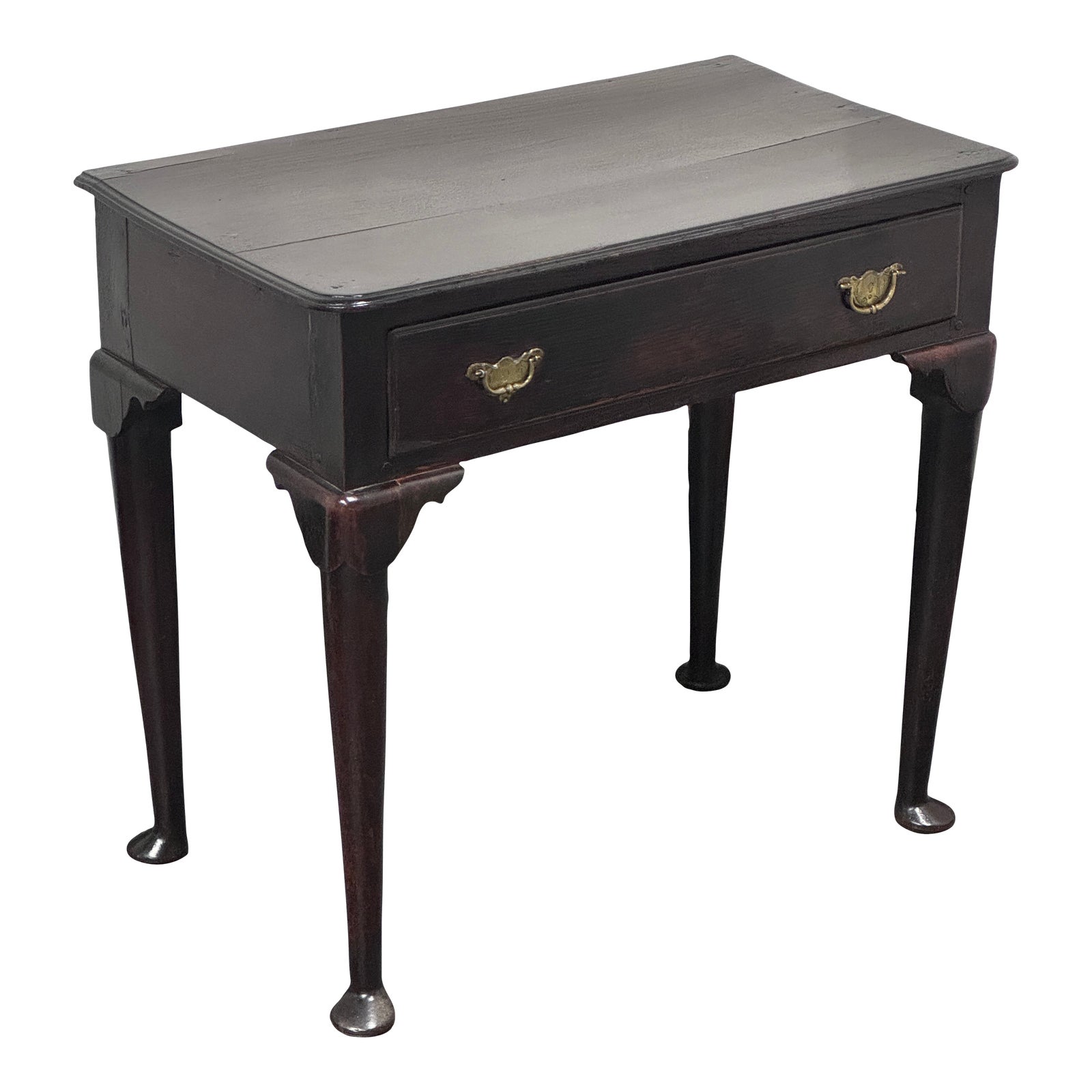 Design Plus Gallery presents a Mahogany Side Table of the Georgian Style. Simple claw feet that are turned out slightly where it joins the table surface. Two antiqued brass pull tabs are another indicator of the Georgian style. The table has surface conditions that are consistent with its vintage age but overall is in good condition.