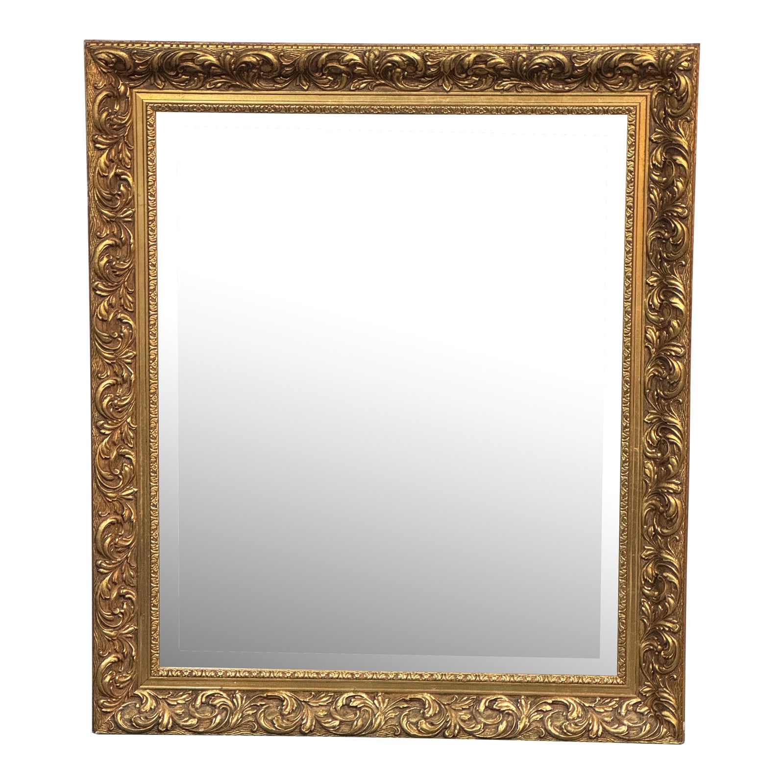 Design Plus Gallery presents a Large Gilt Wall Mirror. The intricate carved floral details are enrobed in layers of gilt and good taste. Deeply embellished, the beveled mirror is a reflection of your traditional style. Light surface wear; paper backing loose; condition is consistent with age and use.