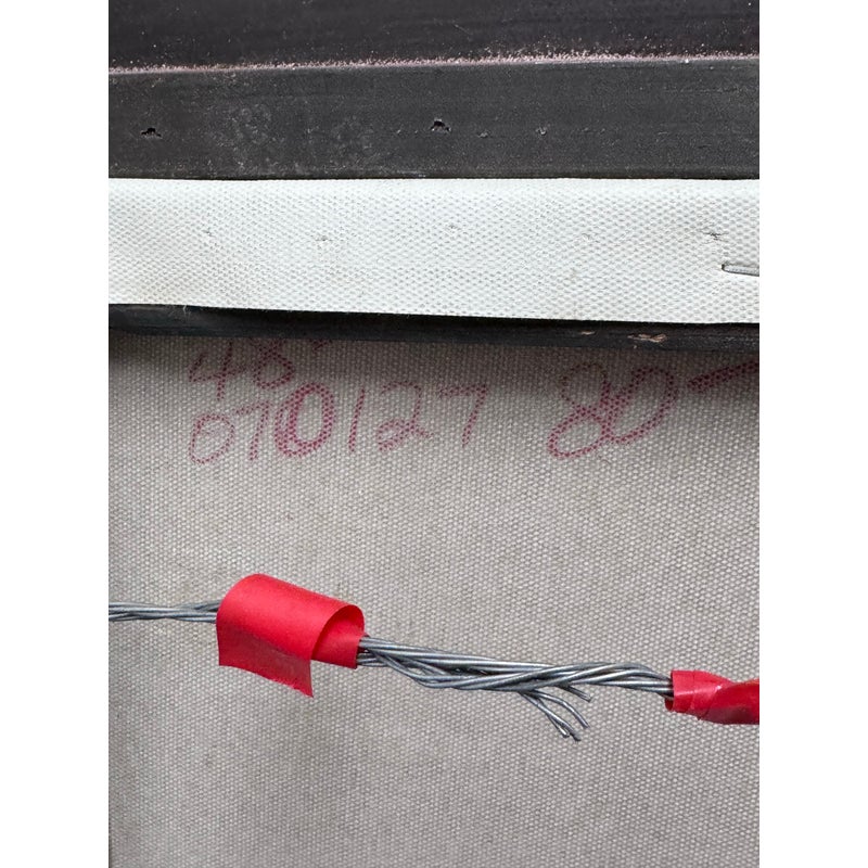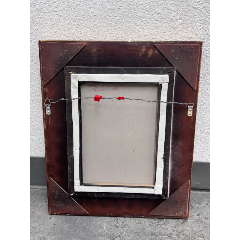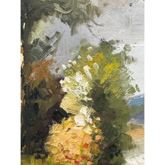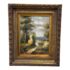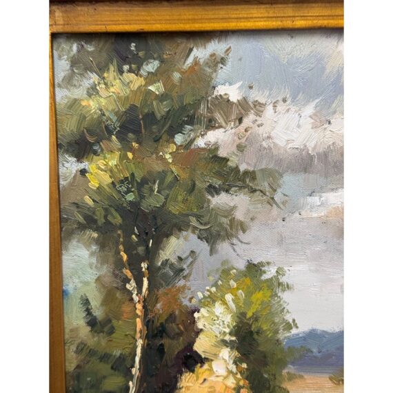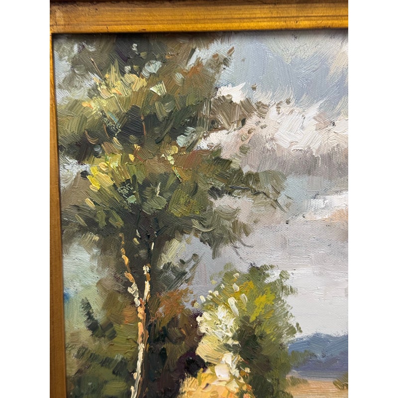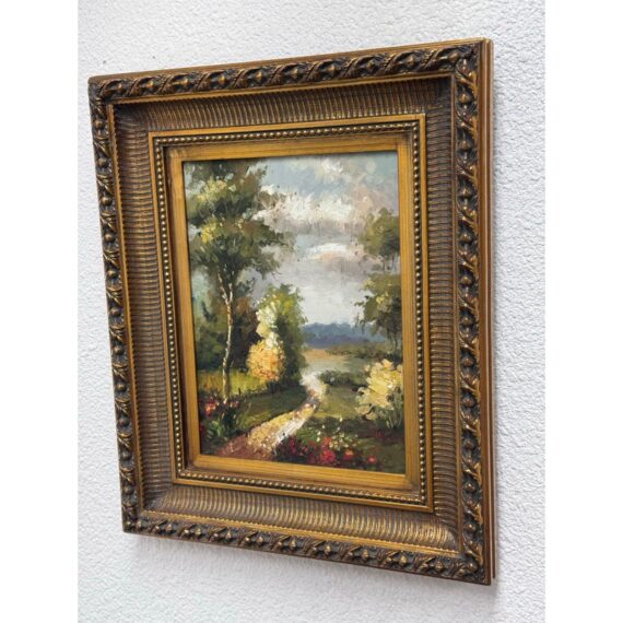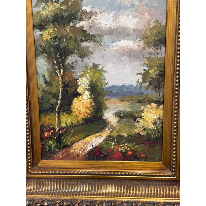 Design Plus Gallery presents a Signed Painting on Canvas in a Giltwood Frame. The frame is thick with intricate details. The oil painting on canvas has a winding road through a wooden area with a blue skies. The piece is sweet and idyllic look at a serene life. The art and frame have a distressed vintage look and are considered to be in good condition for their usage.