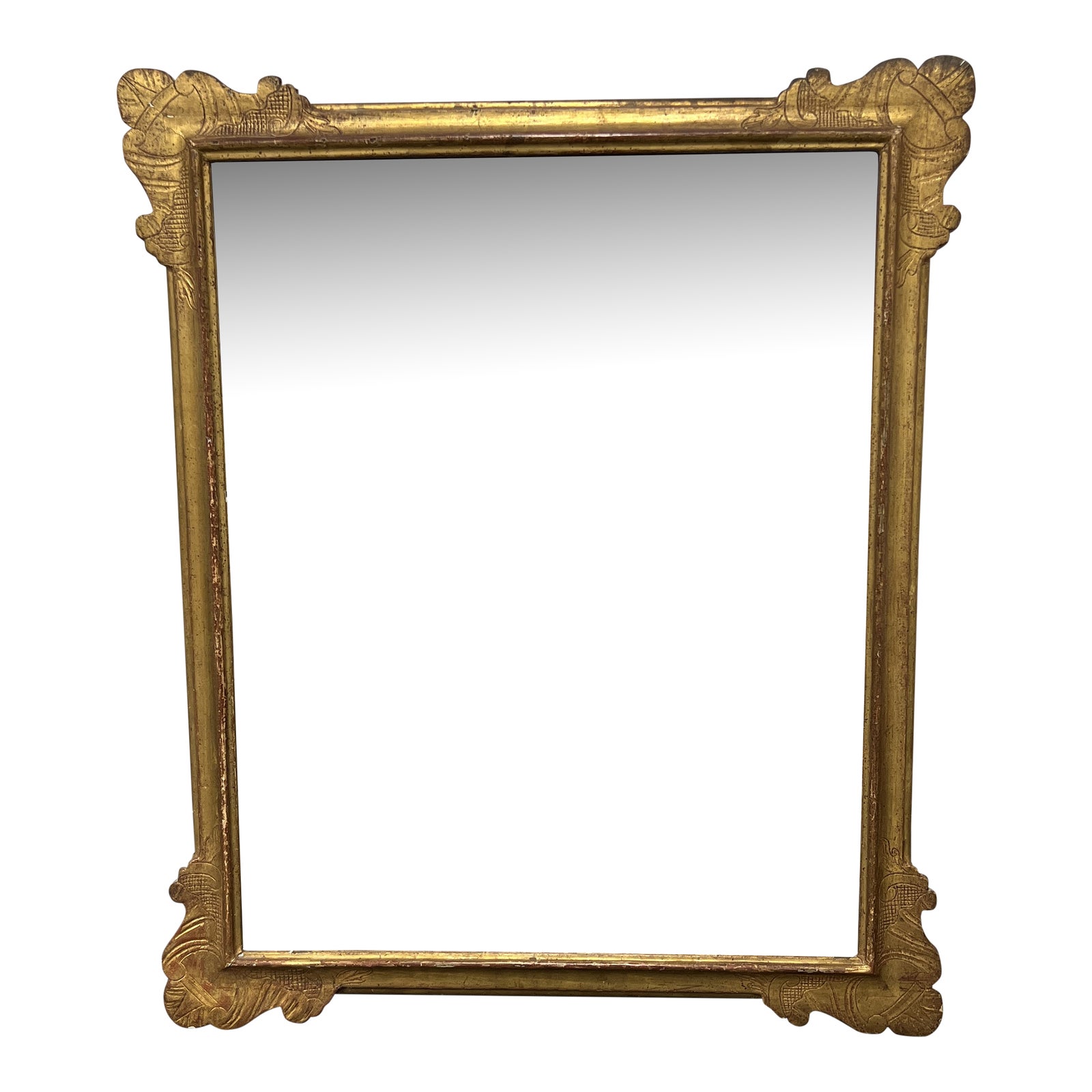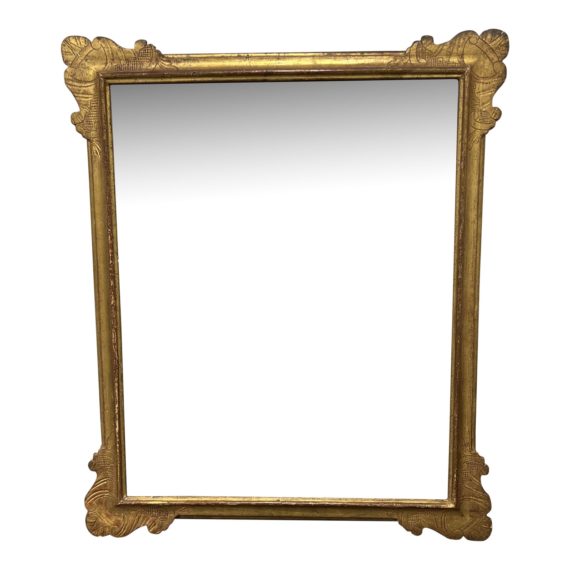 Design Plus Gallery presents a Vintage Gold Framed Wall Mirror. The edges have an identical etched design that is wonderful and architectural. The mirror finish has an aged, vintage appeal and would be considered in good condition based on that aesthetic.