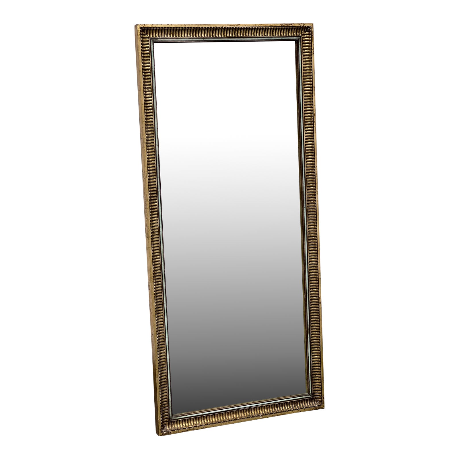Design Plus Gallery presents a Vintage Wall Mirror. This vintage piece features a wood frame in a stunning gold finish, with a thin silver inner lining. The frame has a unique rippled design, adding a touch of texture and visual interest to any space. This wall mirror would make a statement in a living room, bedroom, or entryway, adding both functionality and style. With its elegant design and timeless appeal, this mirror is sure to enhance the aesthetics of any room. Visible and minor wear from usage + age. Read to hang Vertical.