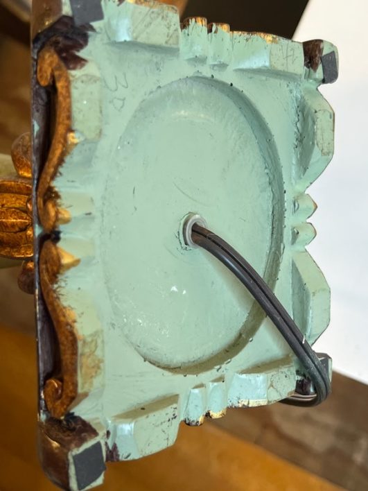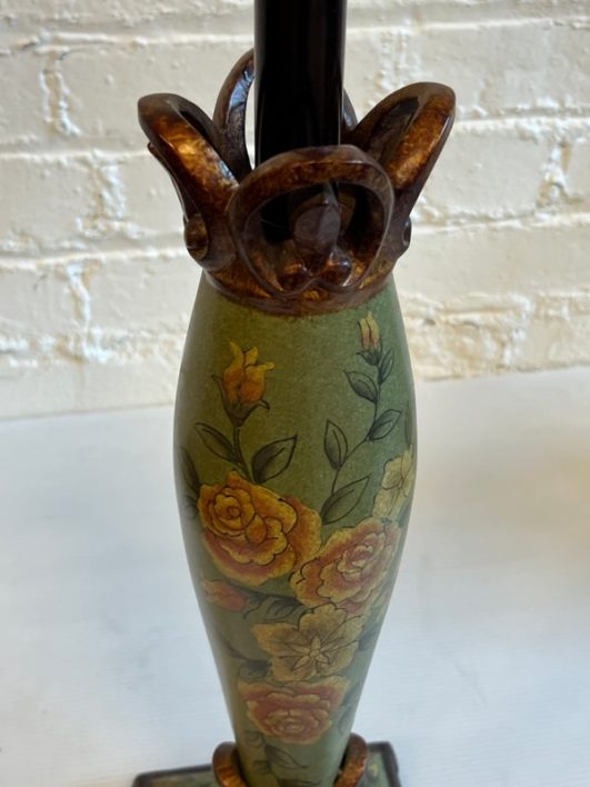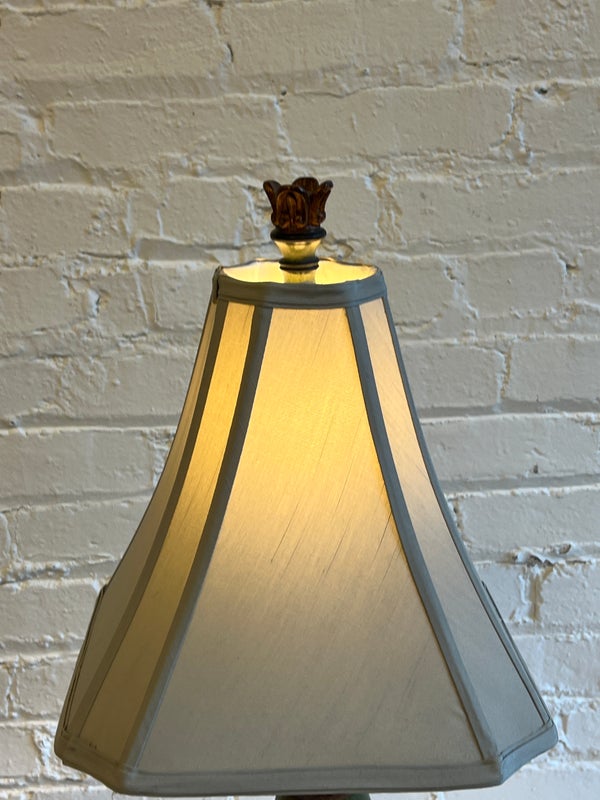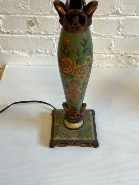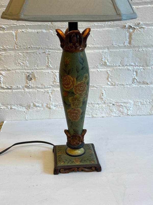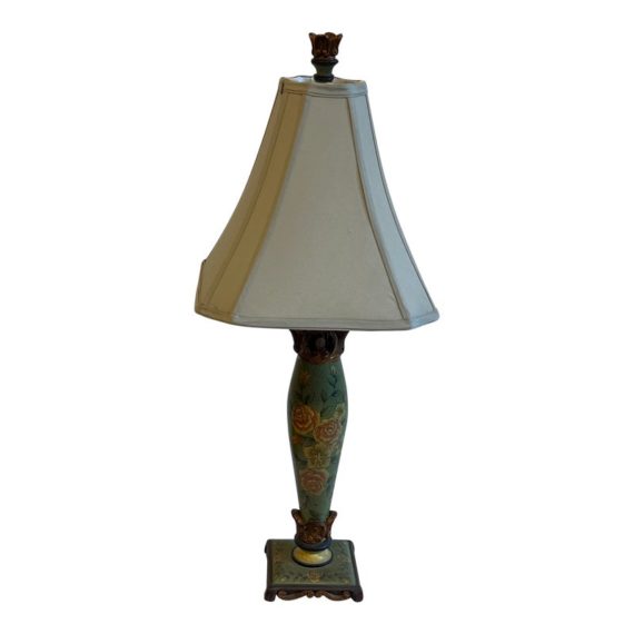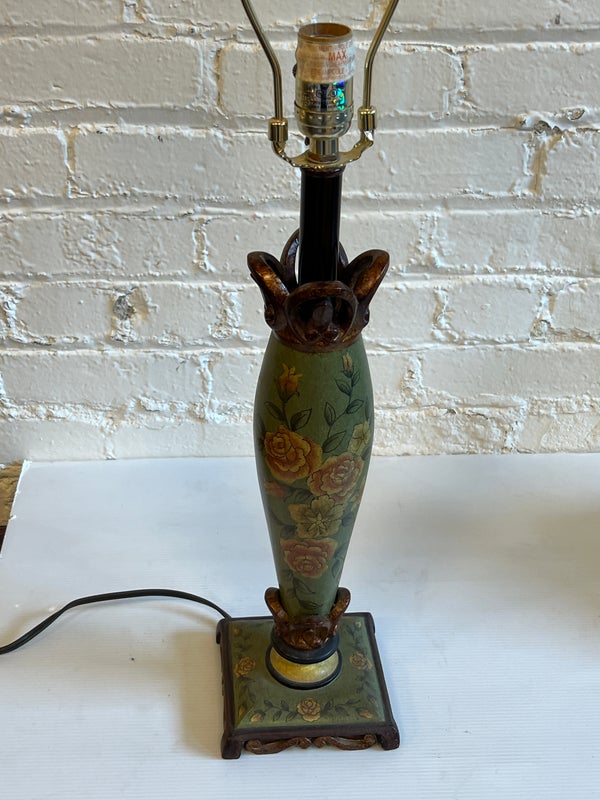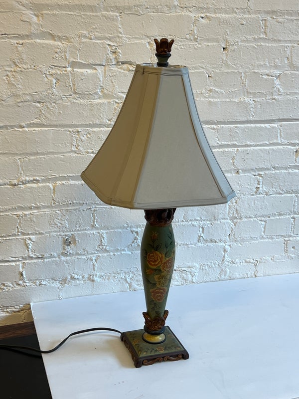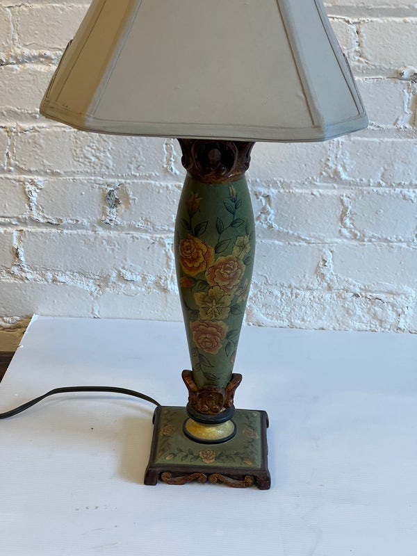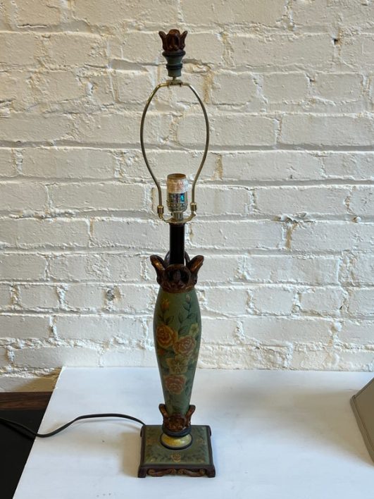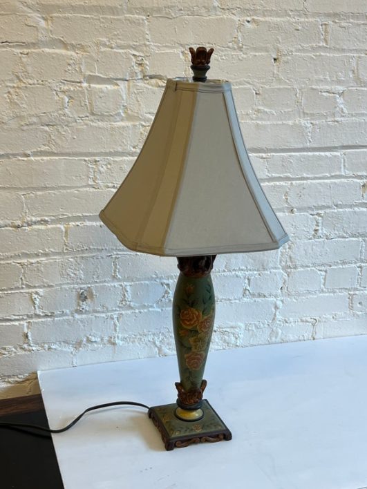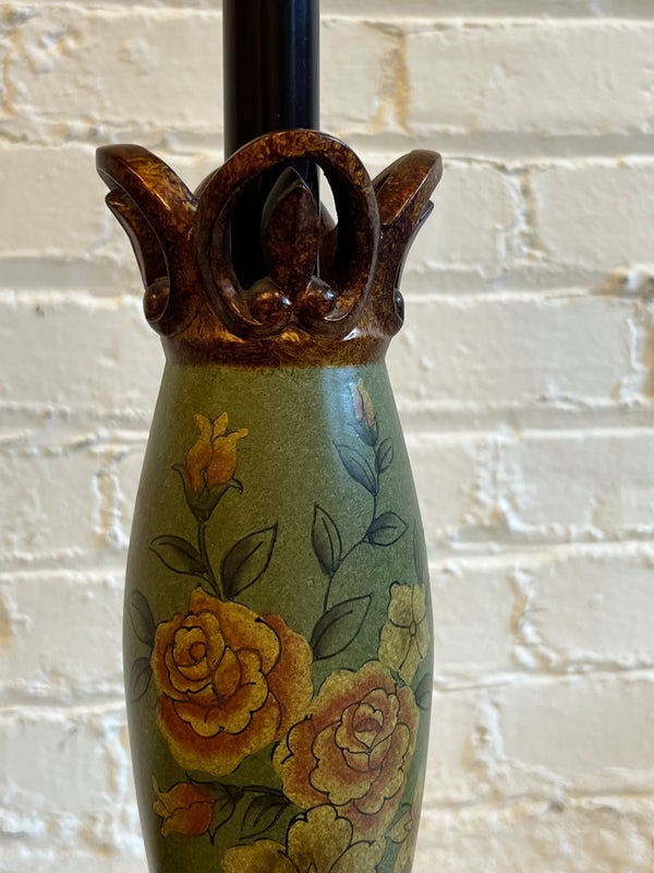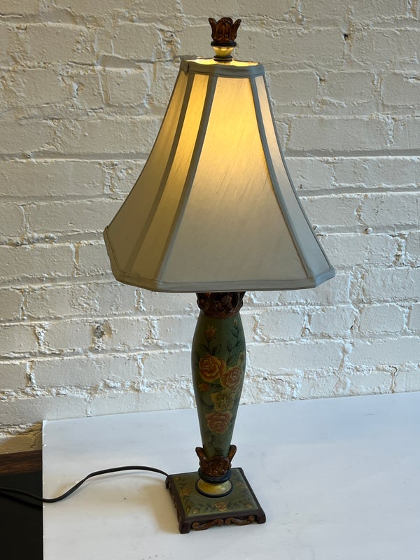 Design Plus Gallery presents a Clay Fired Table Lamp. This heavy + ornate lamp is extraordinary in its loveliness. With a mint green background and details of roses you see the definition of shabby chic. This unique vintage piece does show signs of wear that are consistent with its age and use.