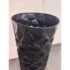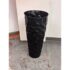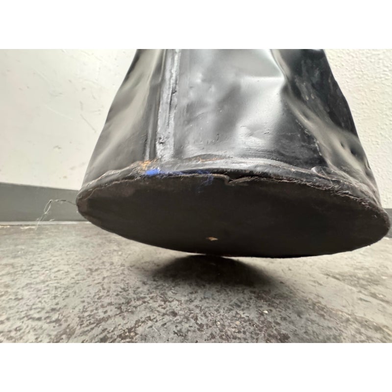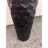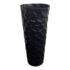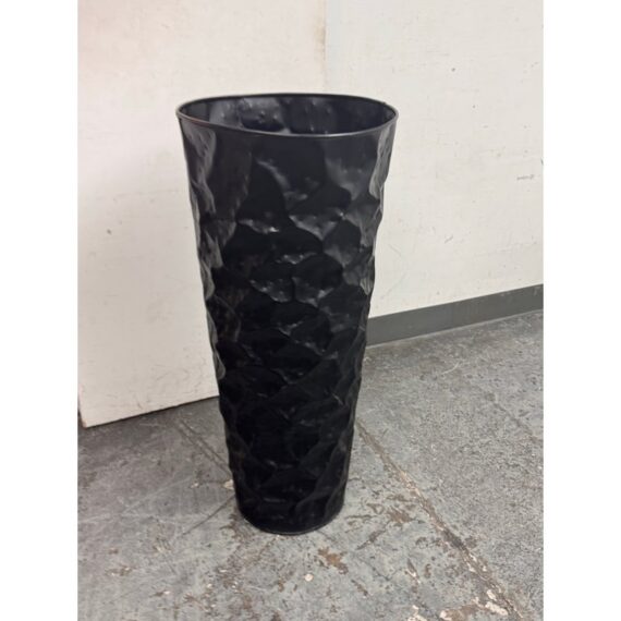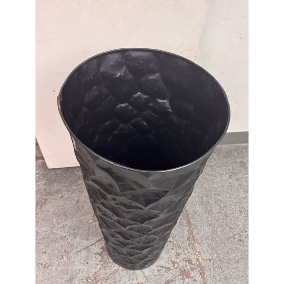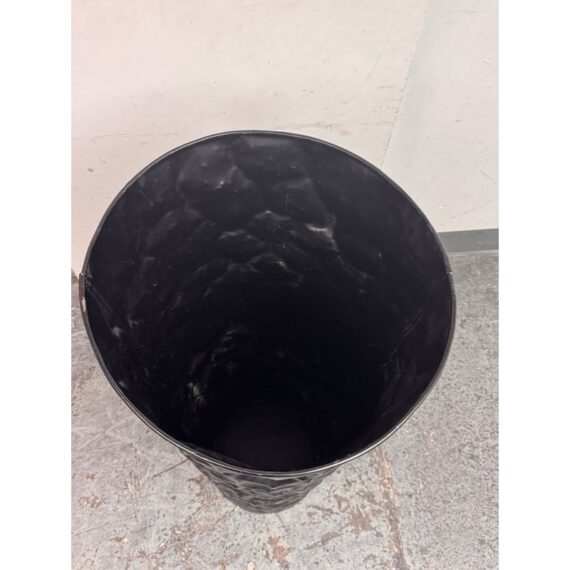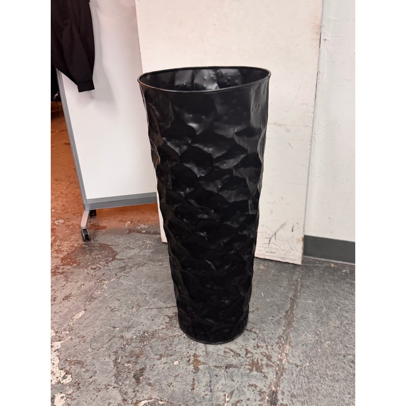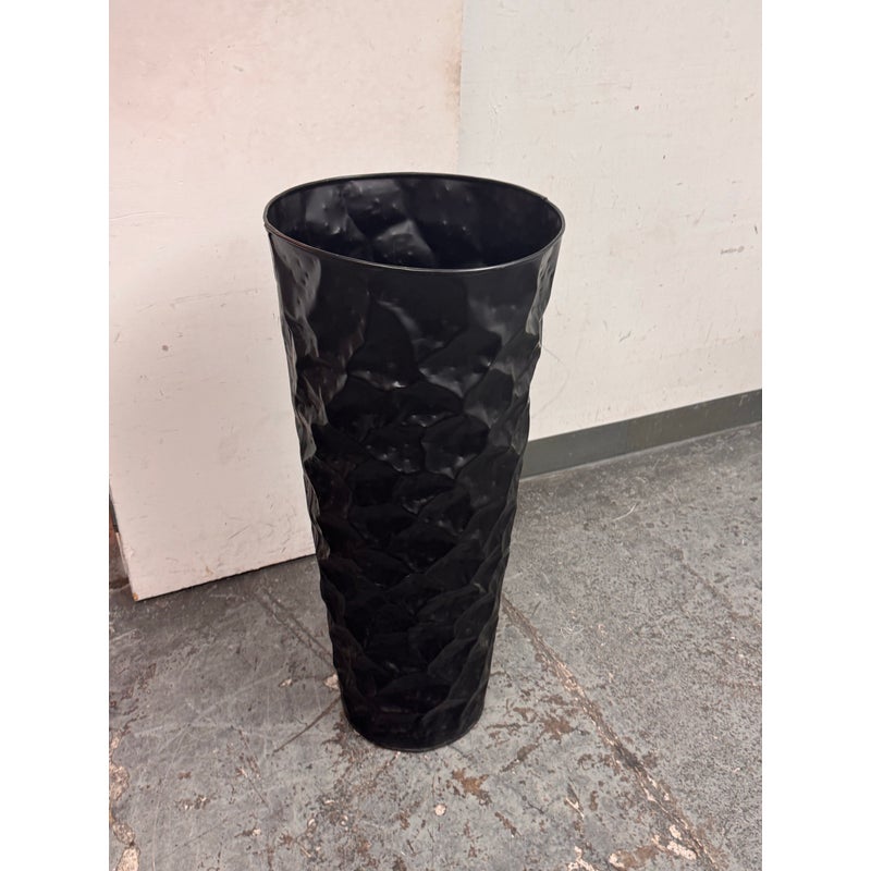 Design Plus Gallery presents a Black Hammered Planter. This planter has a tall, tapered silhouette with an allover faceted surface that gives the form depth and shadow. The matte black tone and sculptural texture create a bold, modern profile with clean lines from rim to base. It is in good condition with visible and minimal wear from usage. Made in the USA.
