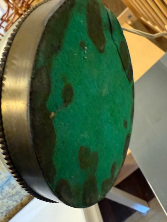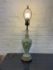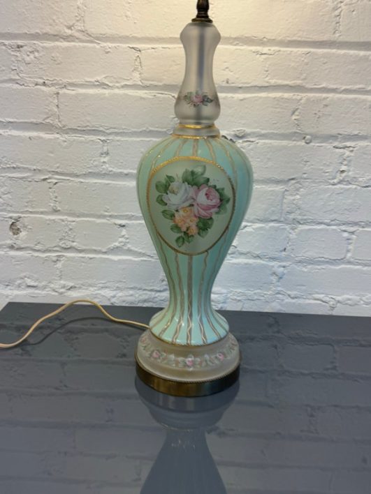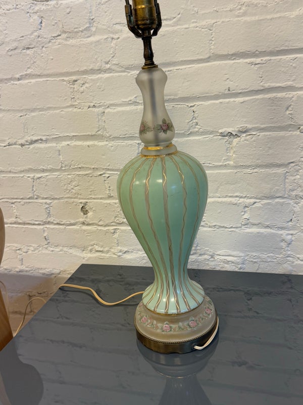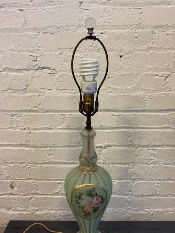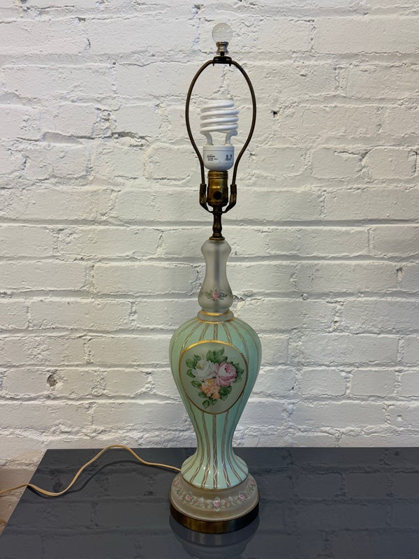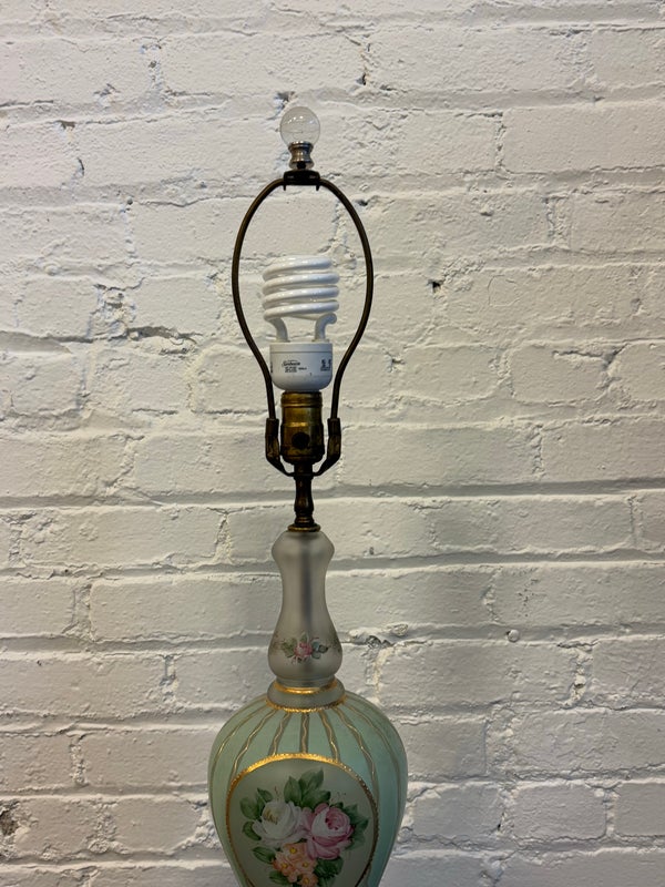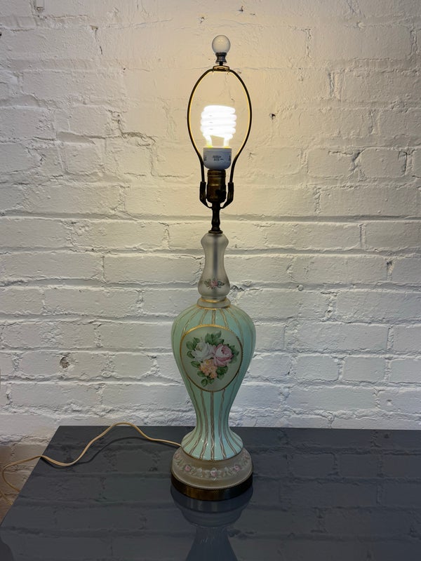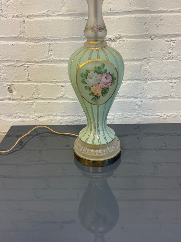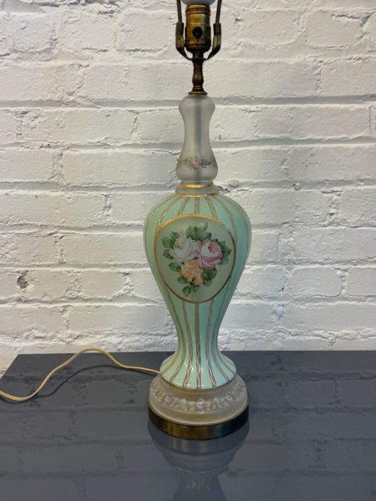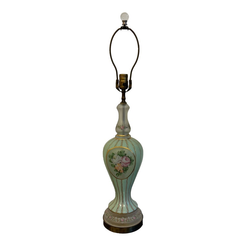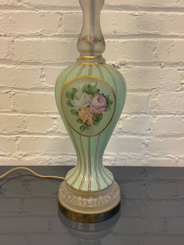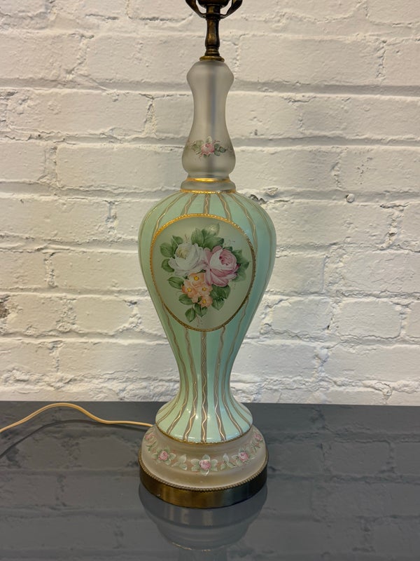 Design Plus Gallery presents a Hand Painted Table Lamp with Floral Bouquet. The pretty lamp is fresh and clean looking with golden stripes surrounding its curvaceous body with a central flower bouquet. Is in good condition for its near antique age. Visible wear.