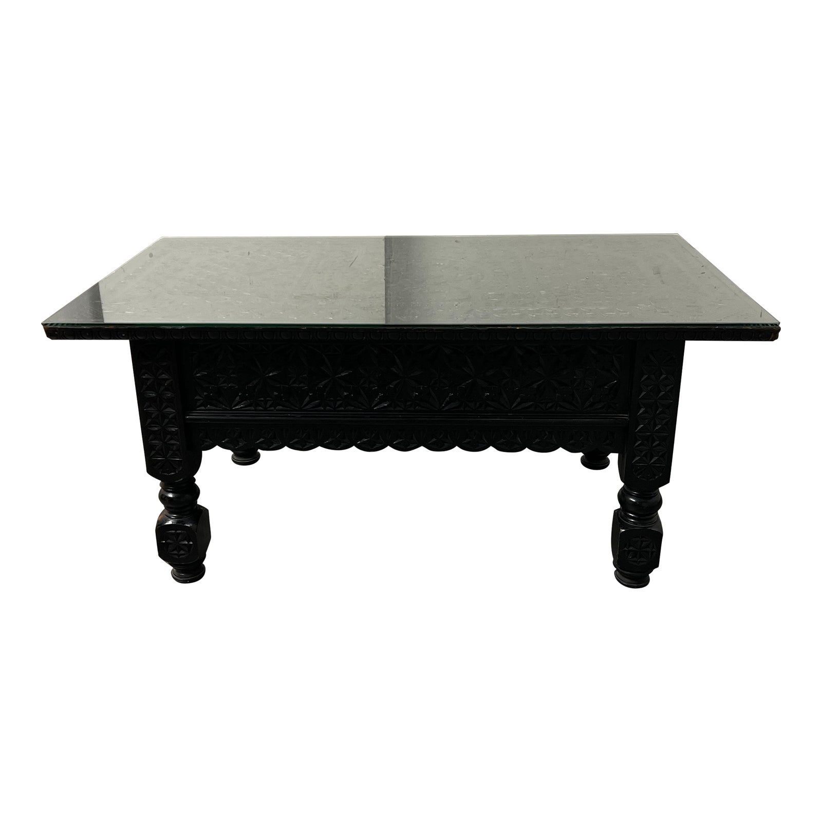 Design Plus Gallery presents a Vintage Carved Coffee Table. Crafted from solid woods, this table showcases impeccable craftsmanship and attention to detail. The hand carved details add a touch of elegance and sophistication to the overall design. Finished in a sleek and stylish black finish, this coffee table exudes a sense of timeless beauty. Accompanied with a removable glass top. With its sturdy construction and thoughtful design, this coffee table is not just a stylish piece of furniture but also a functional one. It offers ample space for you to place your coffee cups, magazines, and other living room essentials. Its black finish makes it easy to match with existing furniture and decor, while the hand carved details add a touch of uniqueness and charm. There is visible and minor wear from usage + age.