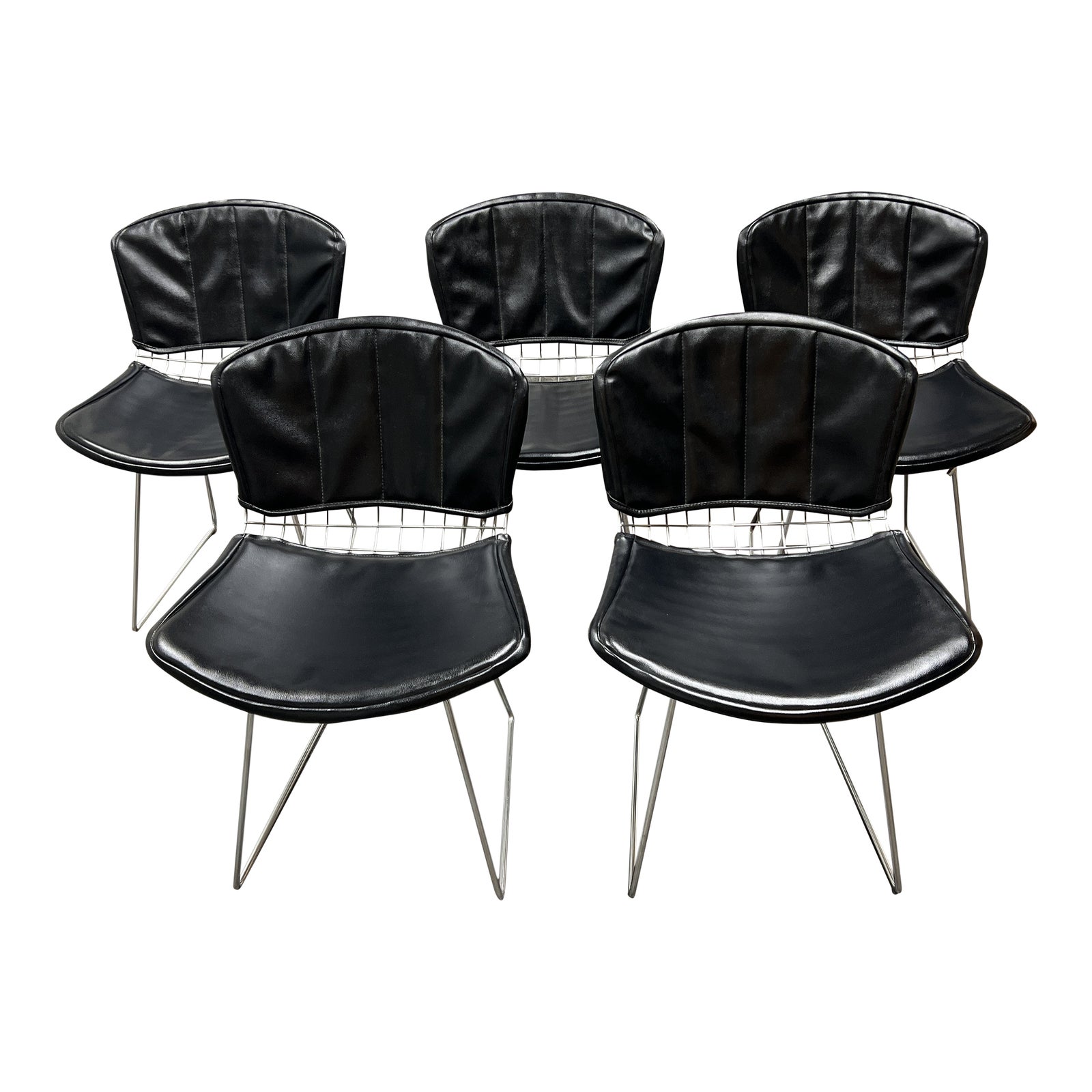 Design Plus Gallery presents a Set of Five Harry Bertoia Chrome Steel Dining Chairs that are Vintage from Knoll International. Hans and Florence Knoll invited Italian-American artist Harry Bertoia in 1950 to work with their new design firm, Knoll International. Through an open-ended experimentation the 1952 Bertoia Side chair was created. Bertoia considered his collection of chairs created for Knoll to be “mainly made of air, like sculpture,” as he bent steel wire into striking lightweight forms while also earning a progressive approach to the ergonomics of seating. They all come with original black leather seat cushion padding for the seat and back. The chairs maintain a good condition, with many years of use ahead of them.