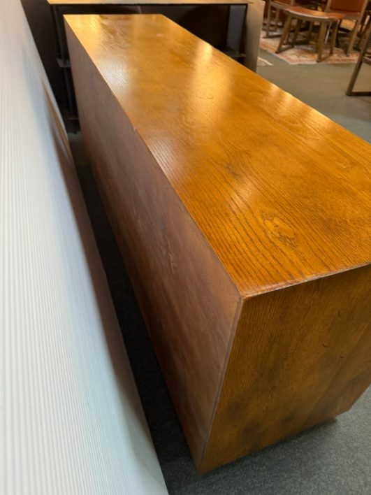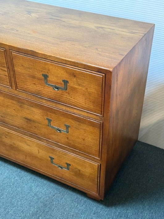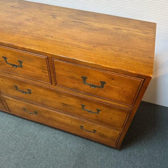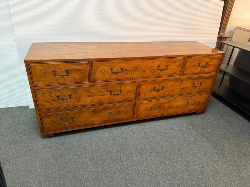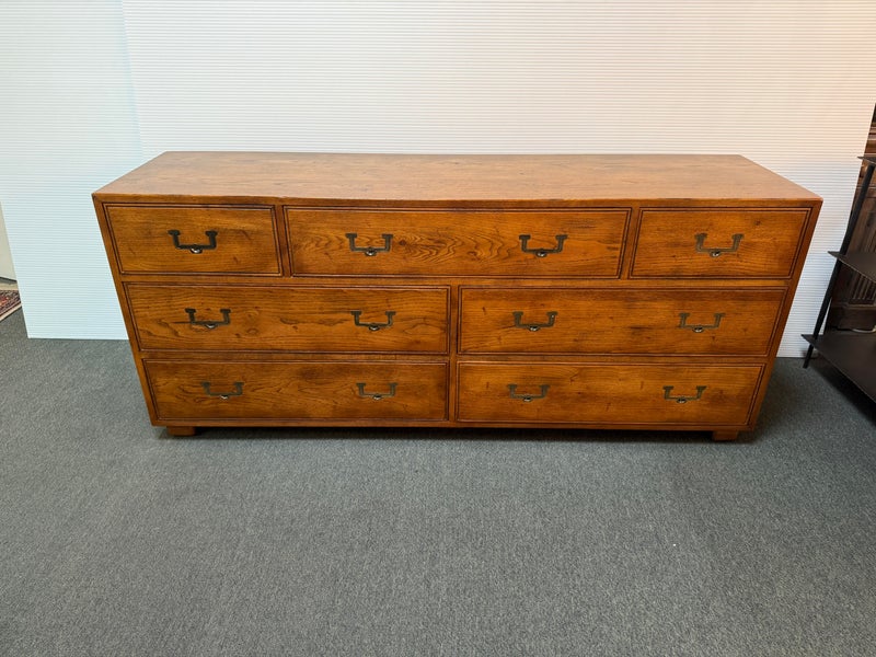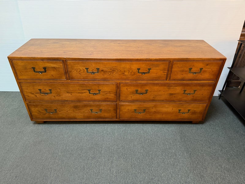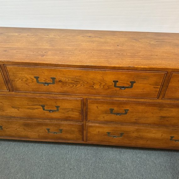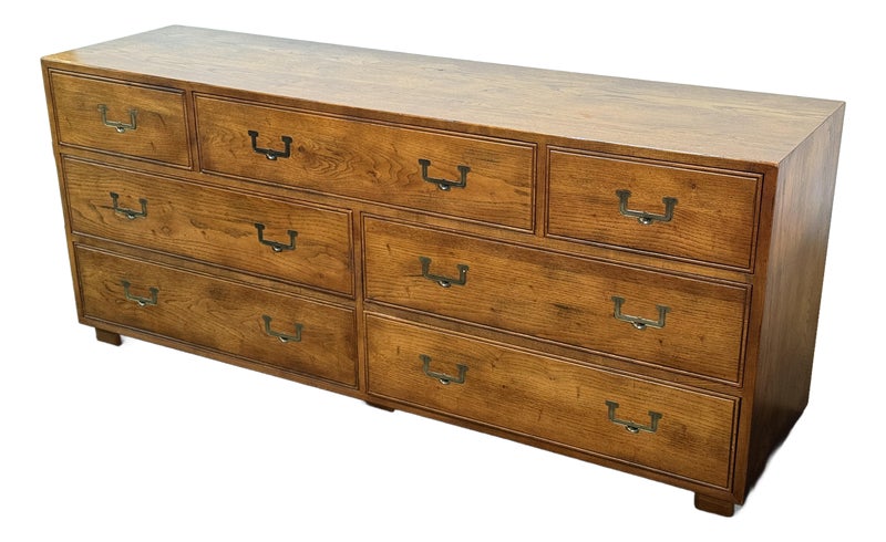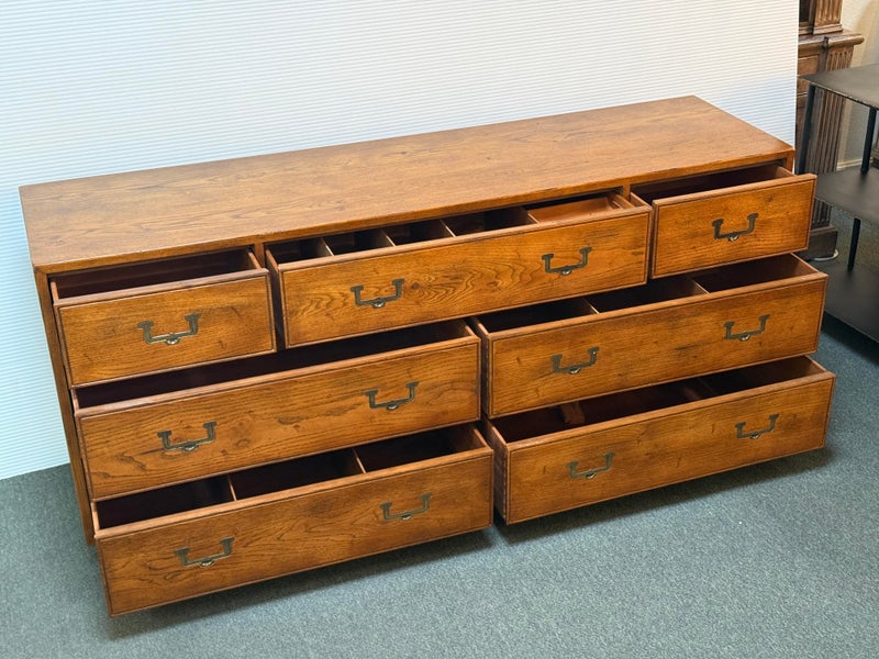 Design Plus Gallery presents a Vintage Artefacts 8 Drawer Dresser by Henredon Furniture. Solid oak craftsmanship and Campaign style, the simple paneled dresser offers expansive storage. Finished with flush brass drawer pulls. Light surface wear; condition is goodfor age and use.