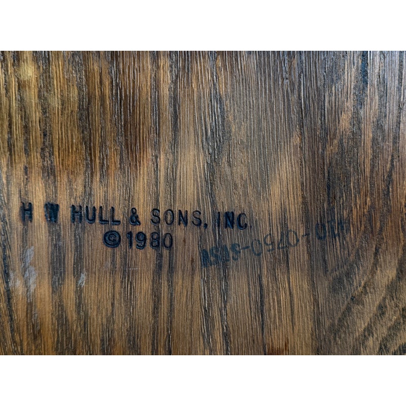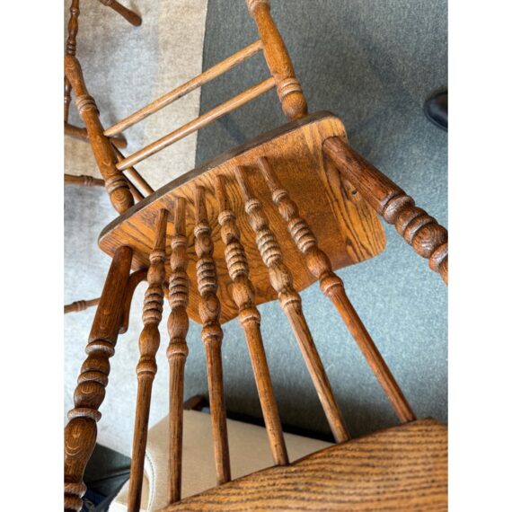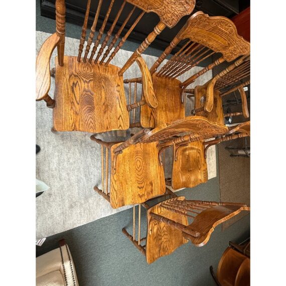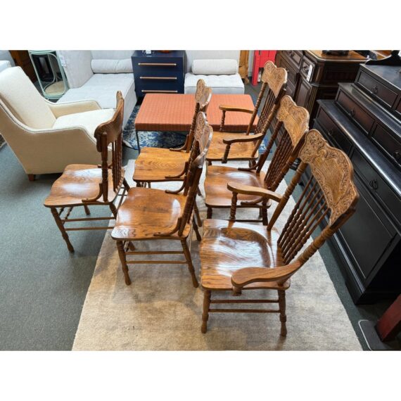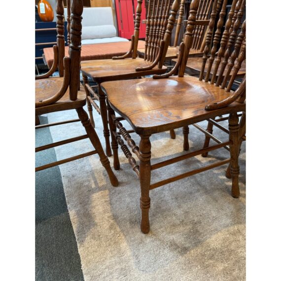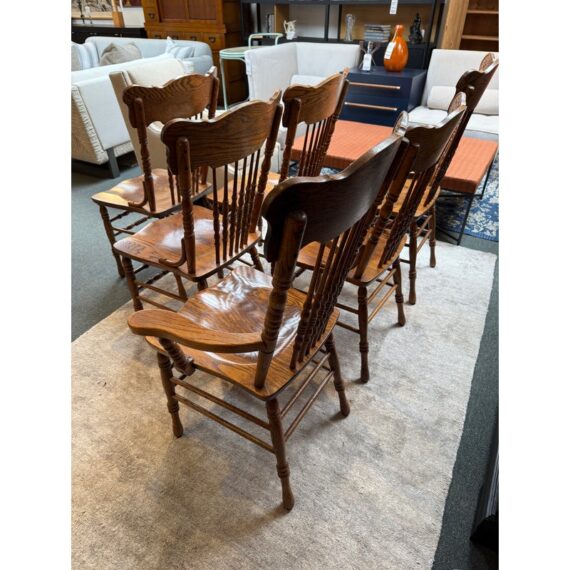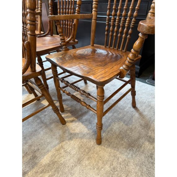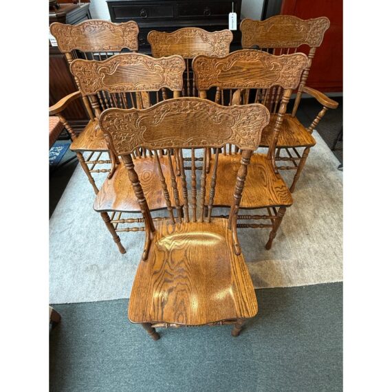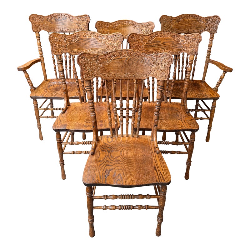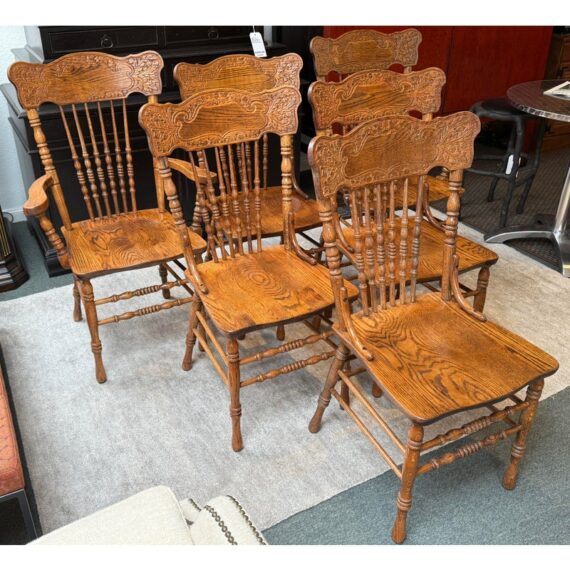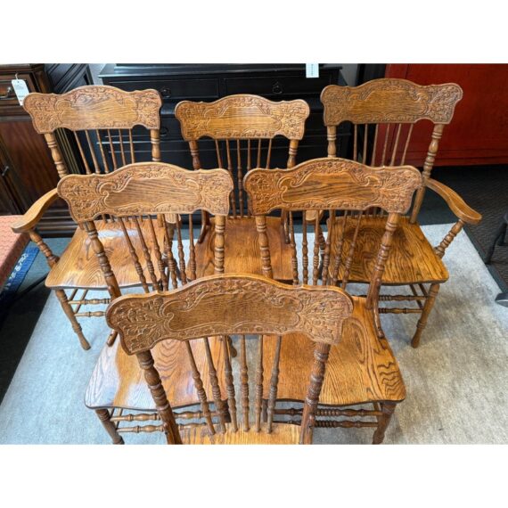 Design Plus Gallery presents a Vintage Set of Six Dining Chairs by Hill & Sons. Solid Oak, with traditionally pressed designs, creates an heirloom set of chairs for your home. Delicate turned spindles add whimsy. Light surface wear; condition is consistent with age and use.