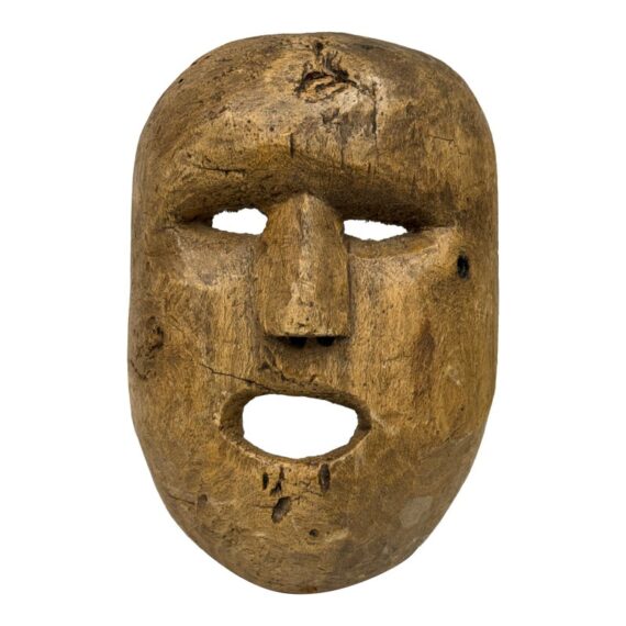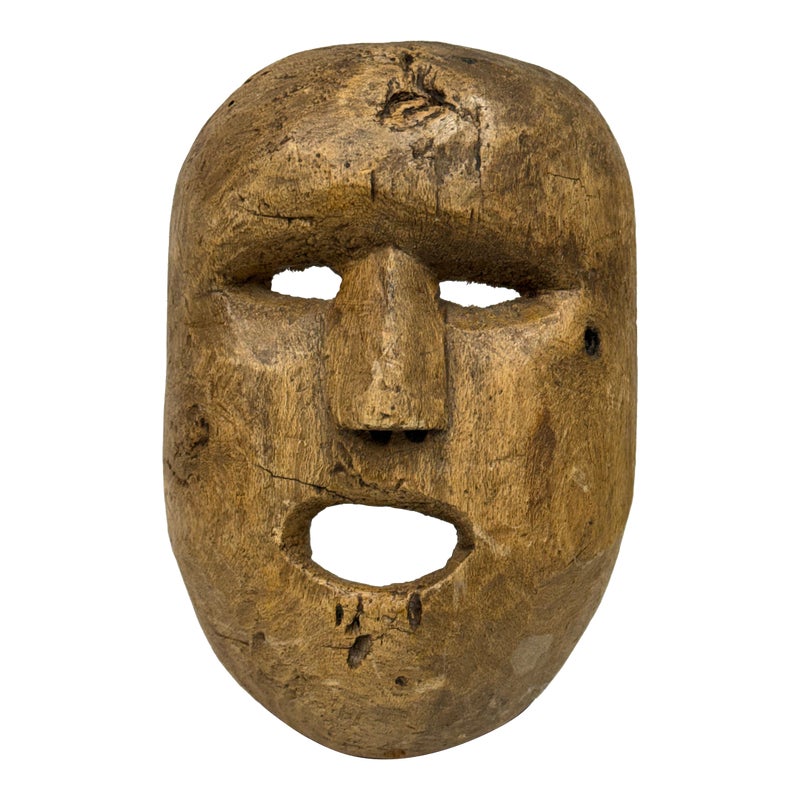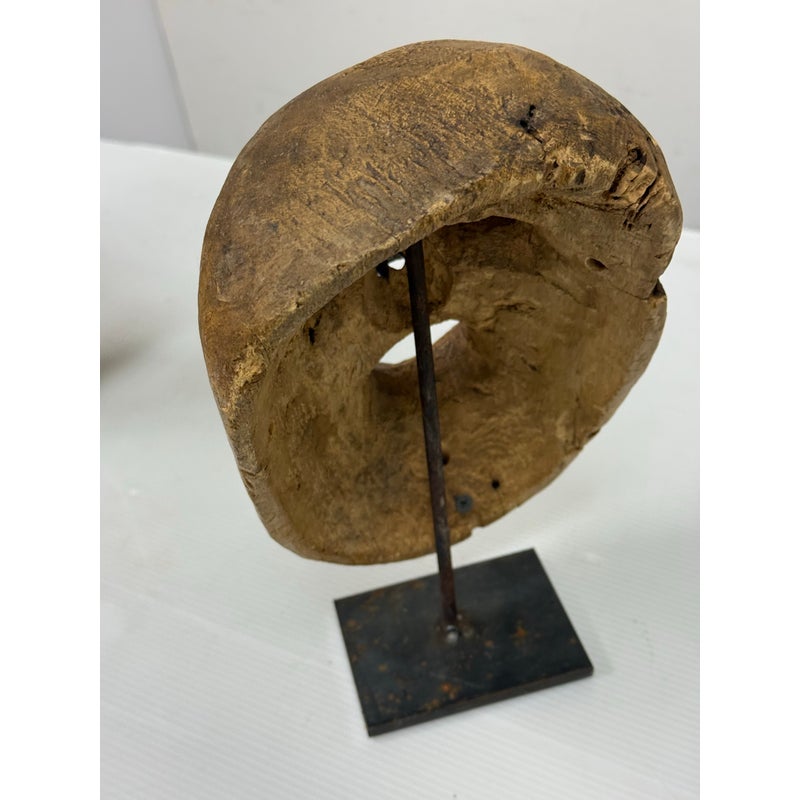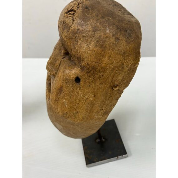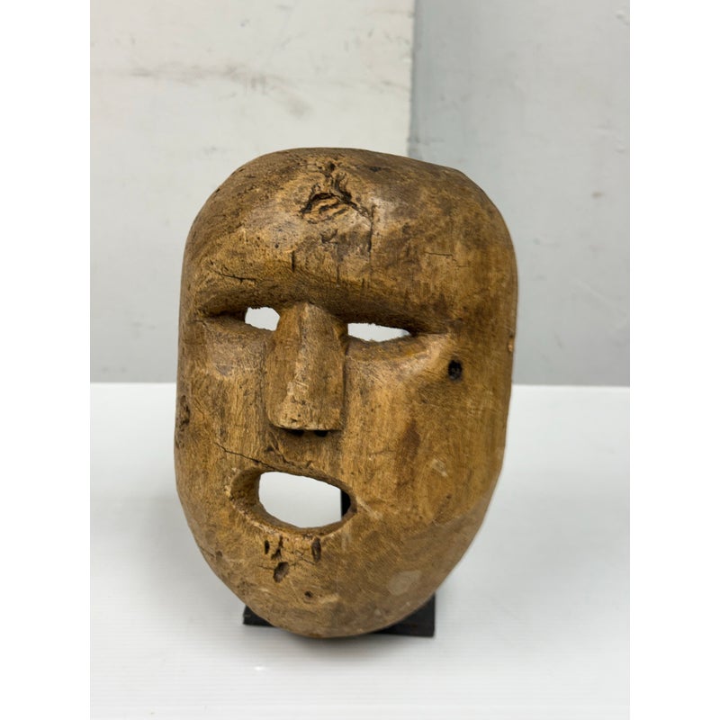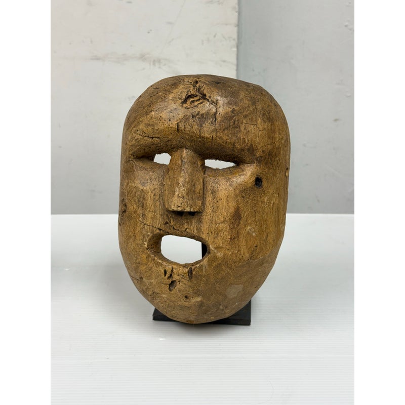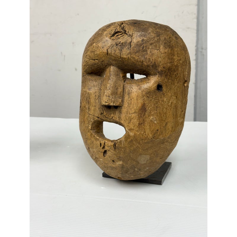 Design Plus Gallery presents a Vintage Himalayan Festival Wood Mask. Hand-carved from solid wood. Each groove tells a story, bearing the patina of years, and making this mask not just a decorative object, but a tangible piece of history. The mask rests securely on a custom, minimalist black iron stand. The stand both elevates the mask and provides stability, allowing it to be displayed as a dramatic focal point on a shelf, table, or mantle. Perfect for adding a touch of vintage, world-inspired charm to your space. In good condition.