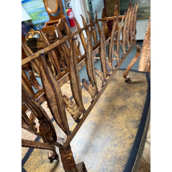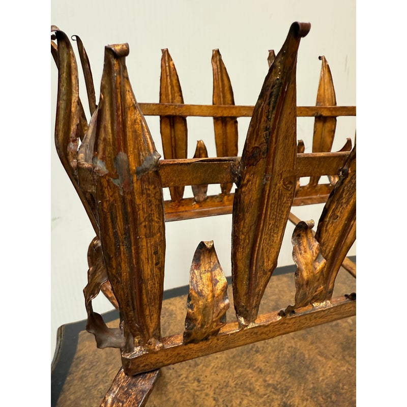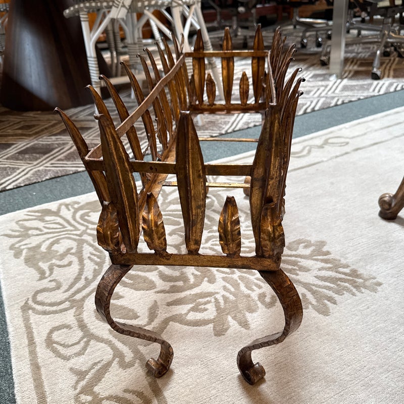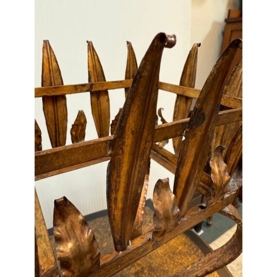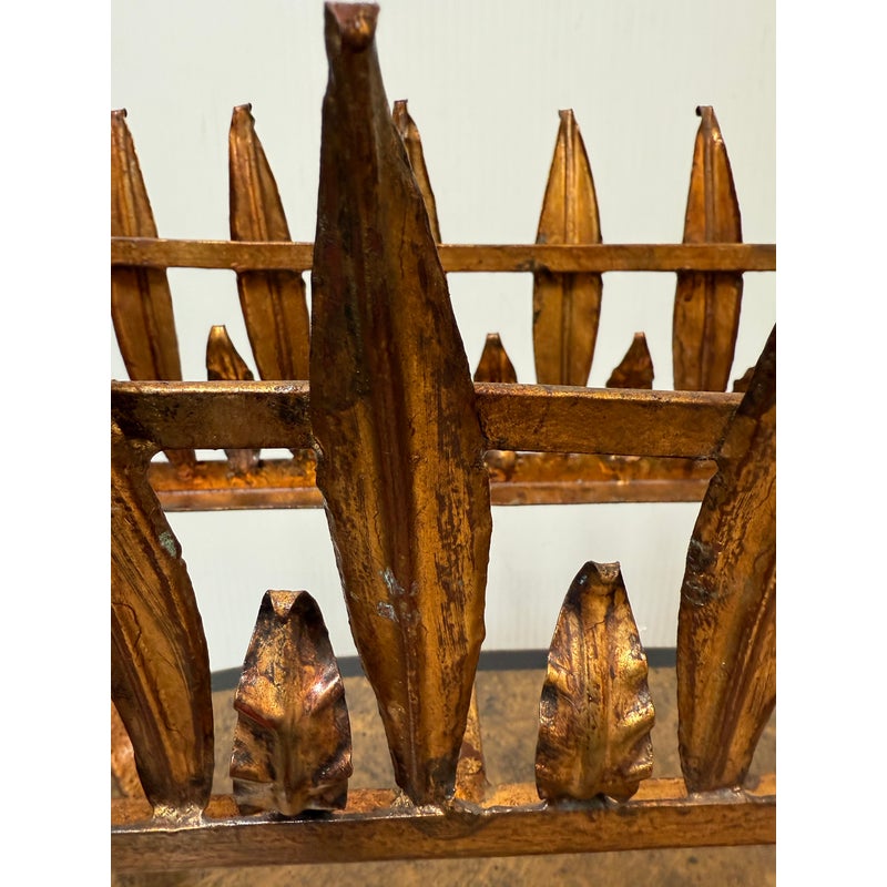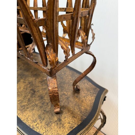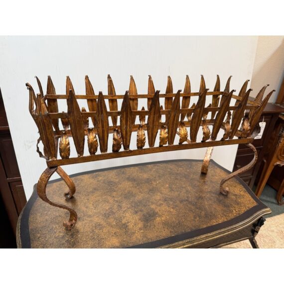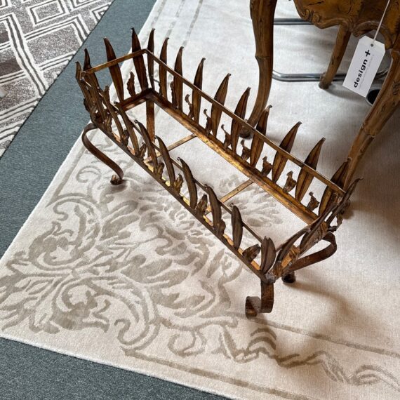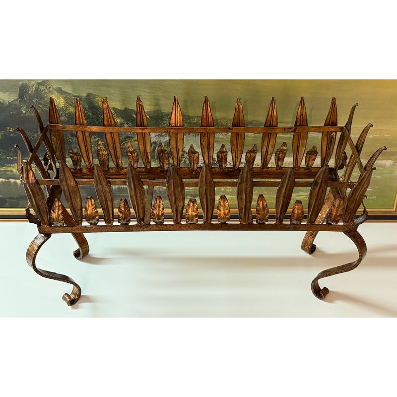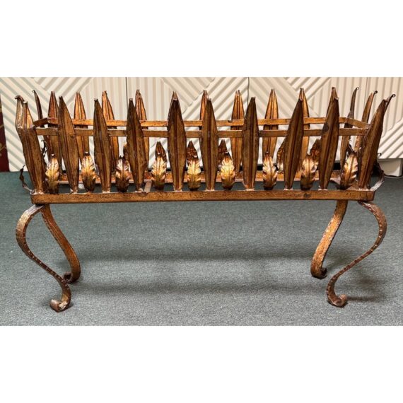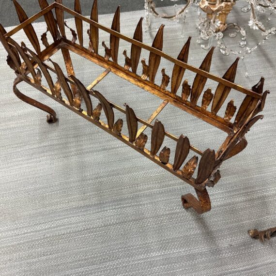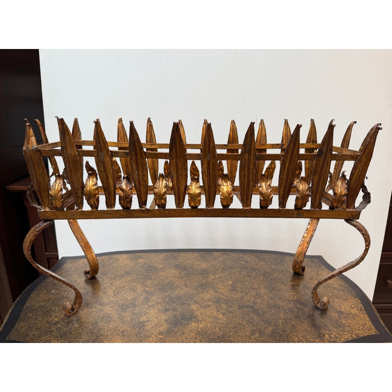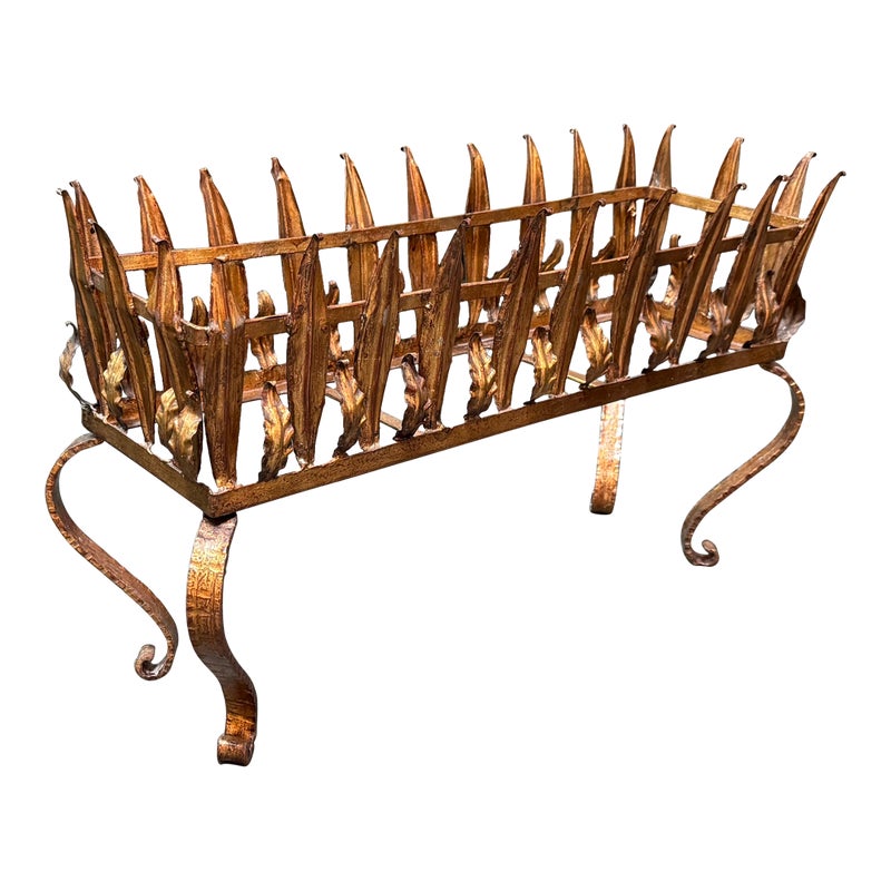 Design Plus Gallery presents a Regency French Gilt Planter Box or Log Rack from a Time Gone By. Crafted with metal, wrapped gilt metal foliage on the frame. The base panel is missing. You can showcase logs for the fireplace or your potted plants. The frame sits on four scrolled legs. In good condition, visible and minimal wear from usage.