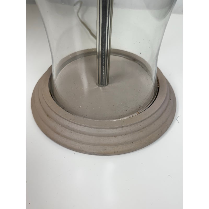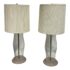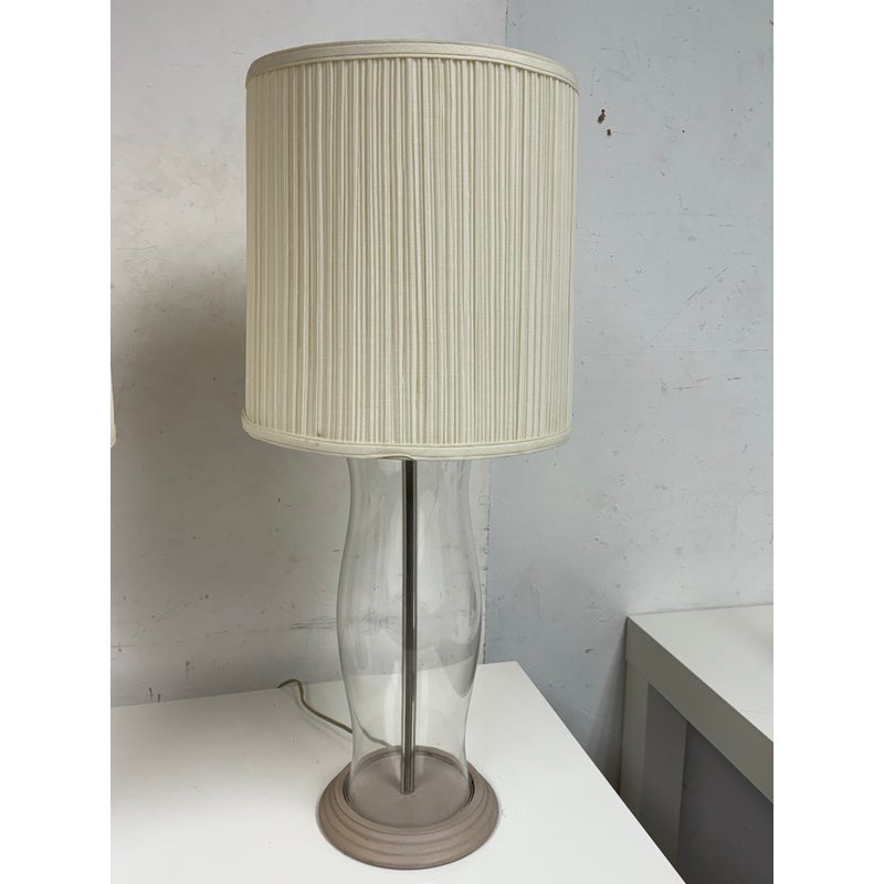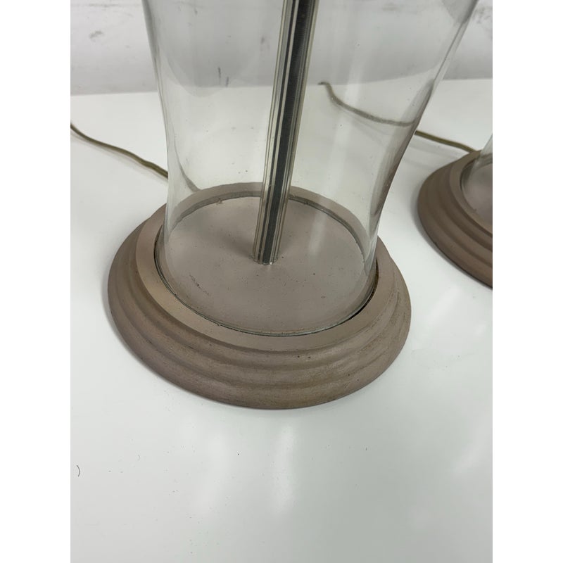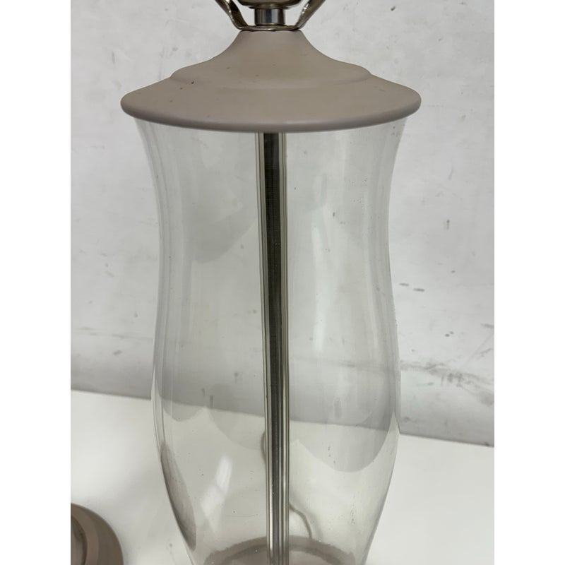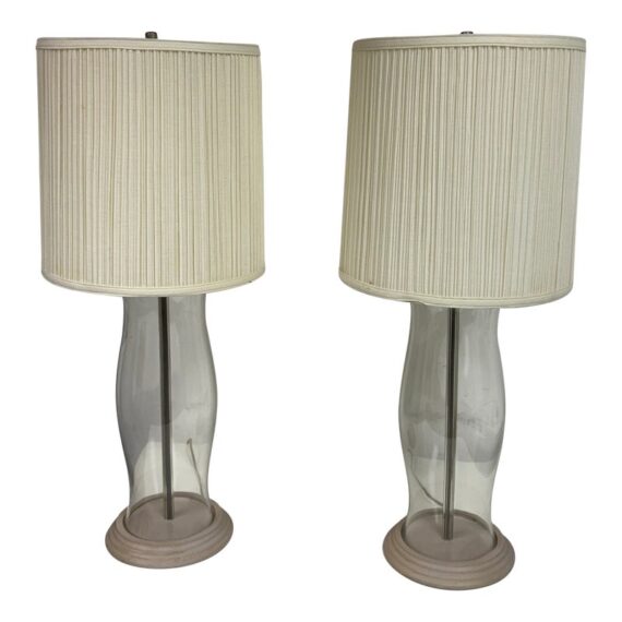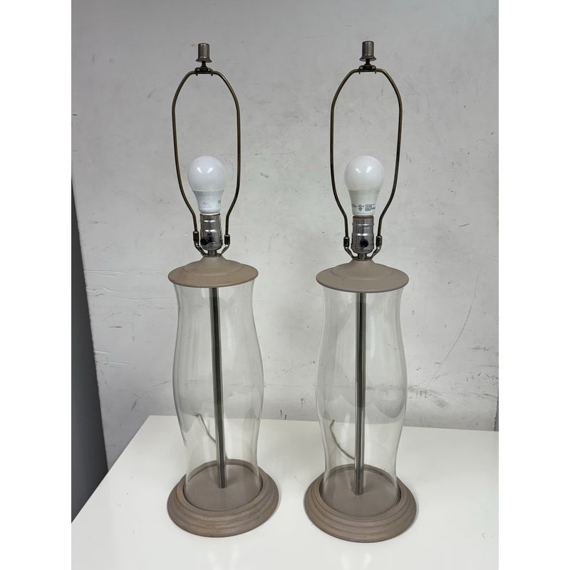 Design Plus Gallery presents a Pair of Vintage Table Lamps. Hurricane glass shape frames. The base and top is in a mud grey finish. Paired with linen drum shades that shows age and visible wear. Would benefit new lamp shades. In good condition.