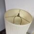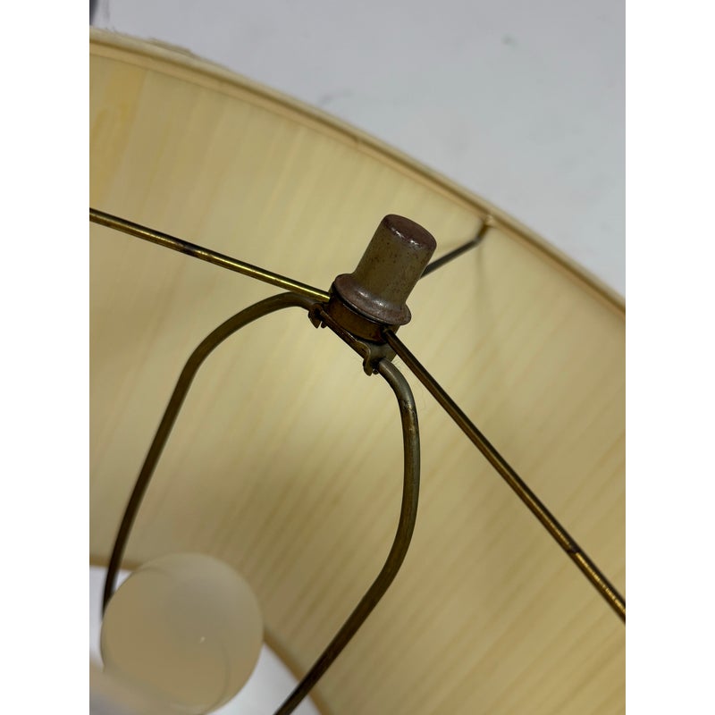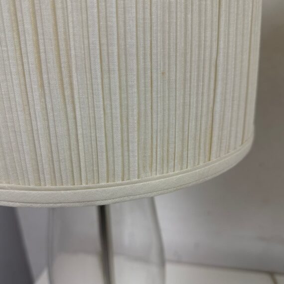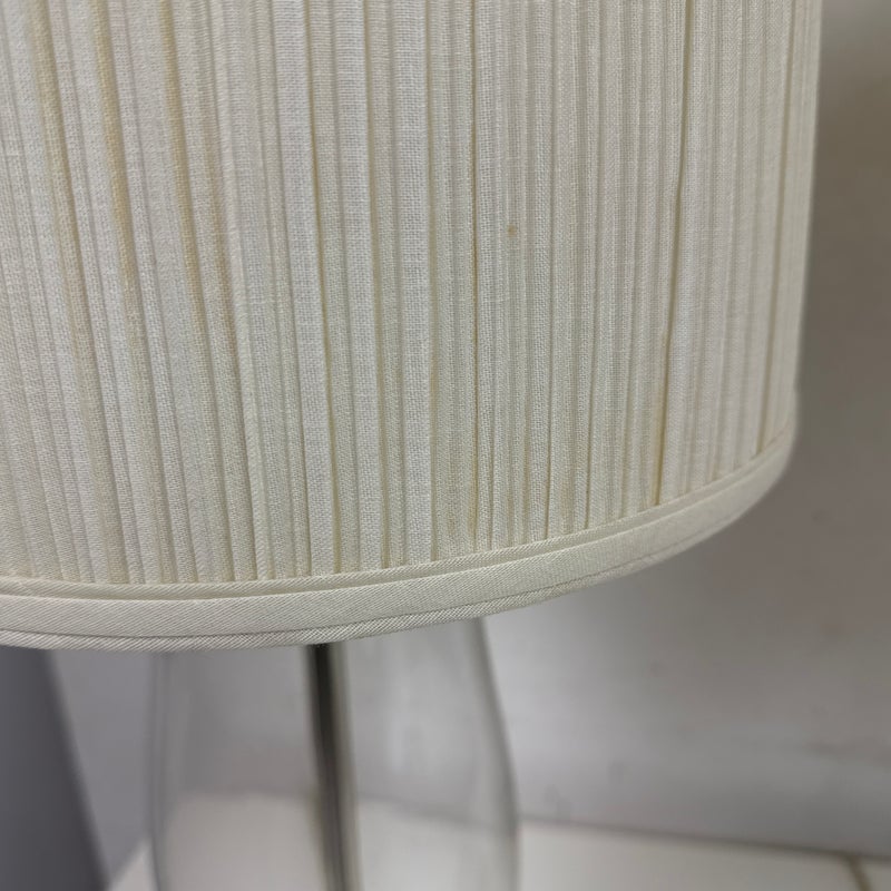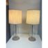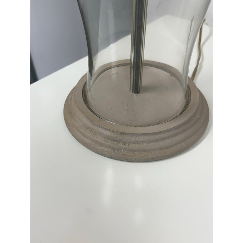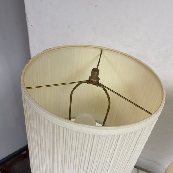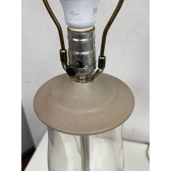 Design Plus Gallery presents a Pair of Vintage Table Lamps. Hurricane glass shape frames. The base and top is in a mud grey finish. Paired with linen drum shades that shows age and visible wear. Would benefit new lamp shades. In good condition.