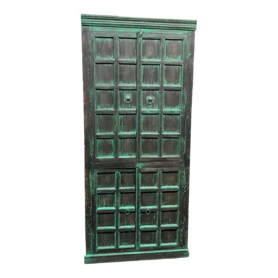 Design Plus Gallery presents a Vintage Indian Corner Cabinet. A stunning piece of furniture that exudes charm and character. Crafted from solid woods, this cabinet showcases the rich and timeless beauty of natural wood. The cabinet is painted with a verdi-gris finish, which gives it a weathered and antique look. This unique finish adds depth and dimension to the piece, creating a visually appealing appearance. With four swing open doors, this cabinet is not only beautiful but also functional. The doors open up to reveal fixed shelves, providing ample storage space for various items. Whether you have a modern or traditional interior design, this cabinet will effortlessly blend in and enhance the overall aesthetic of your space. Its craftsmanship, unique finish, and ample storage space make it a functional piece that is as beautiful as it is practical. Visible and minor wear from usage + age.
