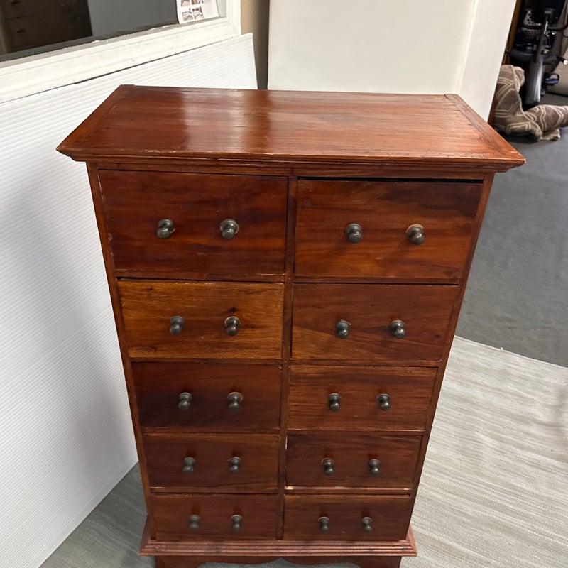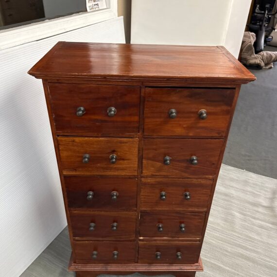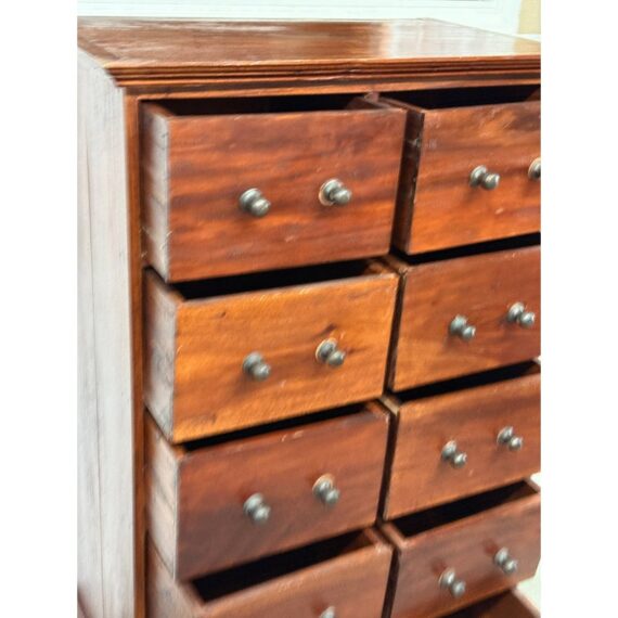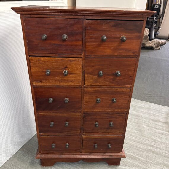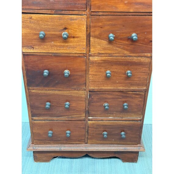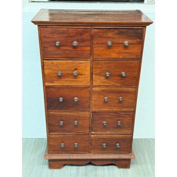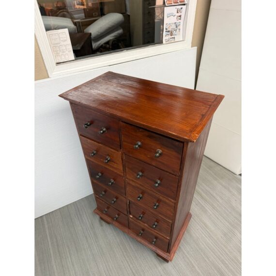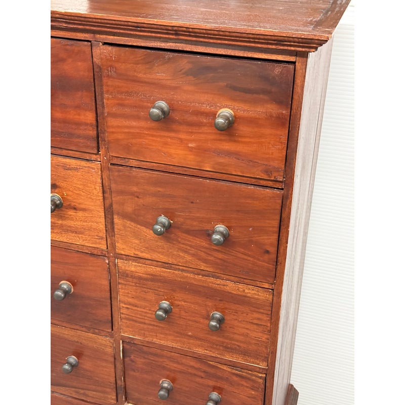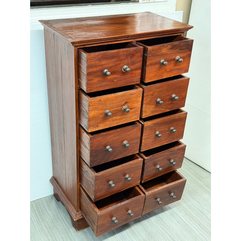 Design Plus Gallery presents a Chest of Drawers from Indonesia that is of Vintage Age. The wide panel hardwood planks let the woodgrain steal the show. Useful for displaying items on top and double rows of drawers with iron fittings for lots of vertical storage. Light surface wear; missing some original handle component; condition is consistent with age and use.