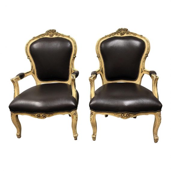 Design Plus Gallery presents a pair of Vintage Italian Arm Chairs. An classic ornate wood frame with a warm cream and gilt finish. The frame has aged and there is natural distressing on the finish. Upholstered in a Pebble Black Leather. Can be used as occasional side chairs or add them as the royal chairs at the dining table. Arm Height: 23 inches Seat Height: 18 inches.