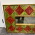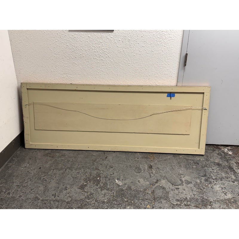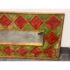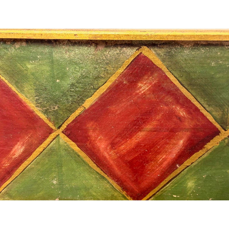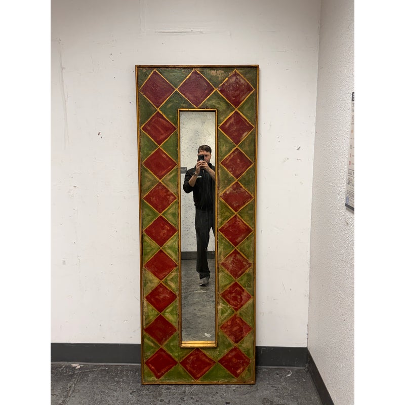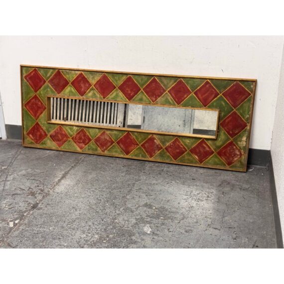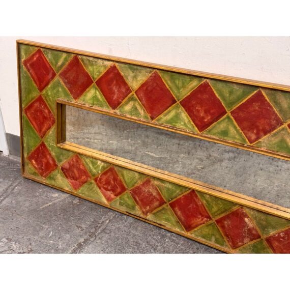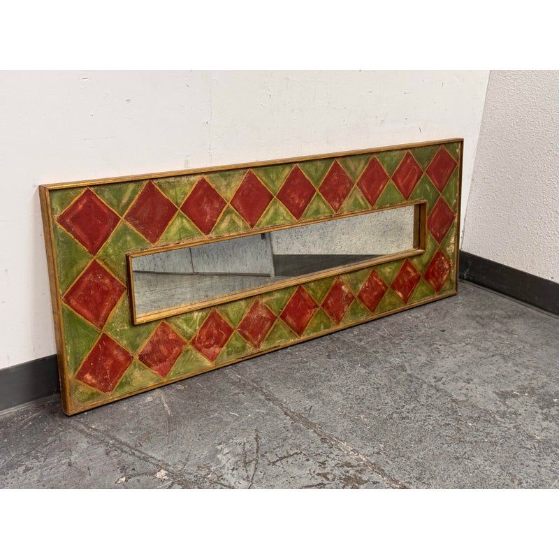 Design Plus Gallery presents an Italian Fresco Wall Mirror. The elongated wall mirror showcases a hand-painted frame inspired by traditional Italian fresco motifs. There is a repeating diamond pattern of earthy green and burgundy tones that are outlined with gilded accents. The rectangular mirror plate is set horizontally within the frame, offering both decorative appeal and functional reflection. Subtle texture variations and brushwork highlight its artisanal origins. It is in good condition with visible and minimal wear from usage. Made in Italy.