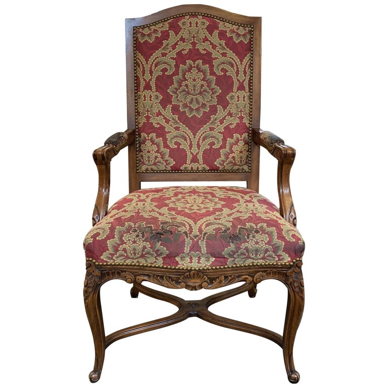 Design Plus Gallery presents a Vintage Arm Chair. Beautiful intricate jacquard fabric and antiqued brass nailheads compliment the elegant curve of the carved wood frame.