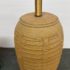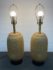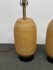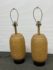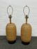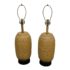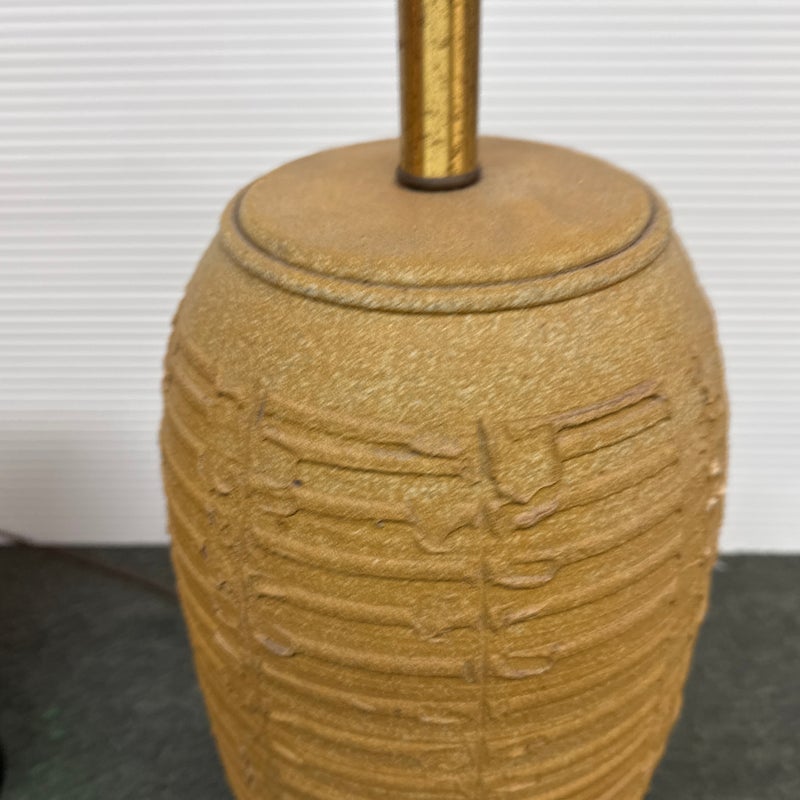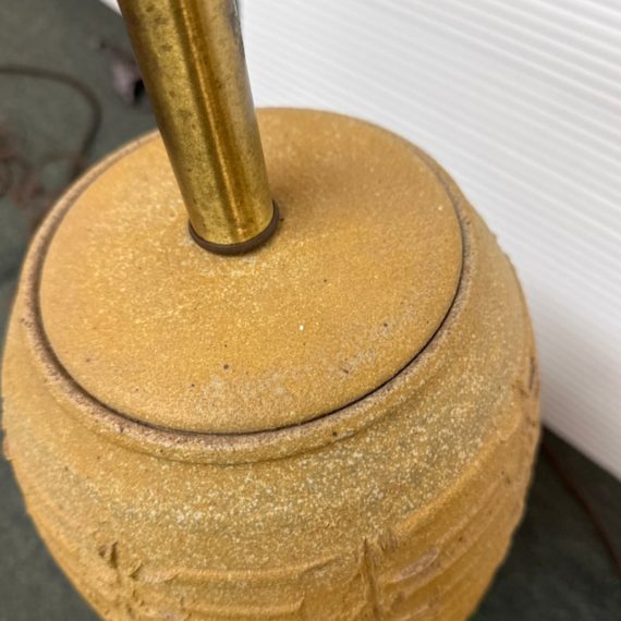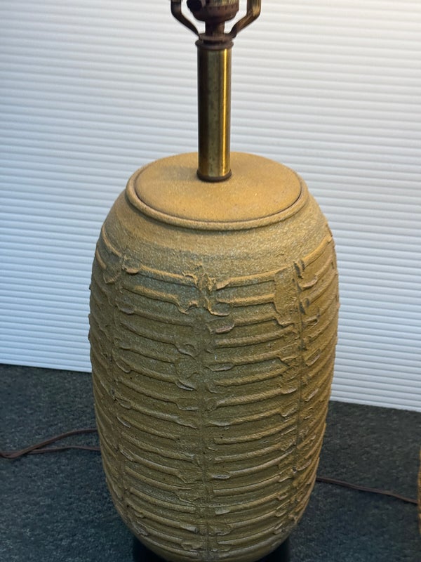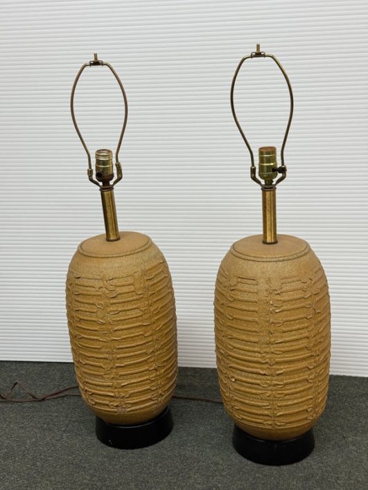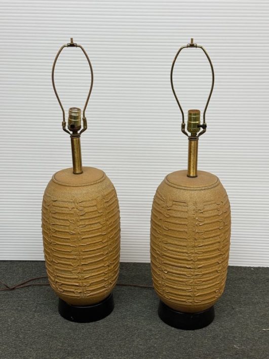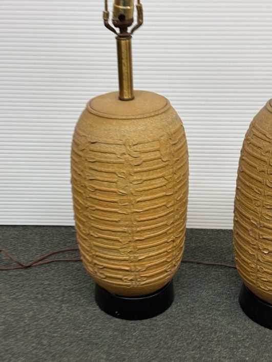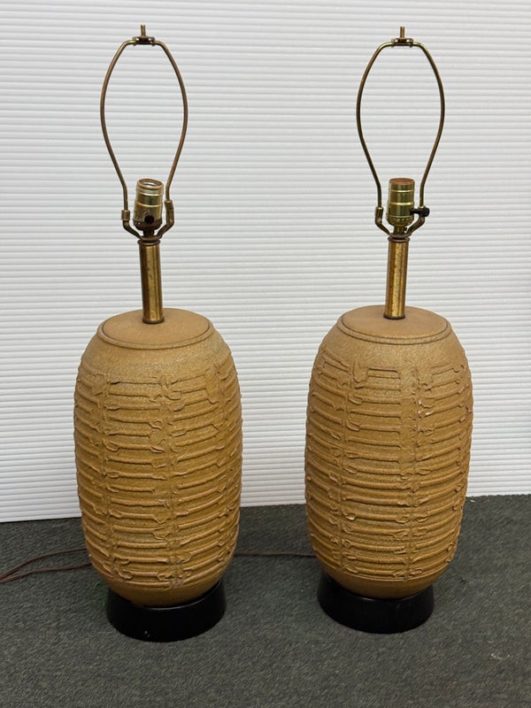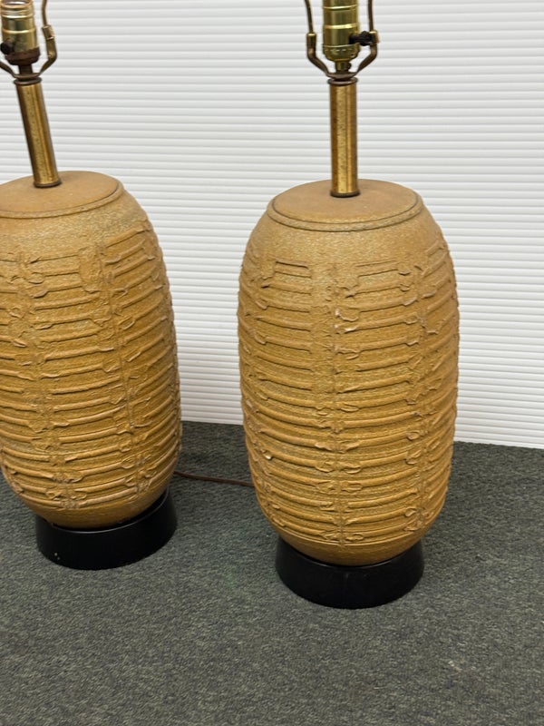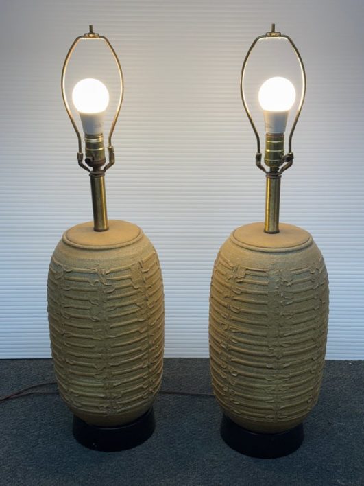Design Plus Gallery presents a Pair of Vintage Pottery Lamps. Japanese vessels, with hand applied striations, are simple, elegant and timelessly organic light fixtures. Raised slightly on turned wood bases, the pair have brass fittings. Finials missing, felt needs replacing, condition is consistent with age and use.