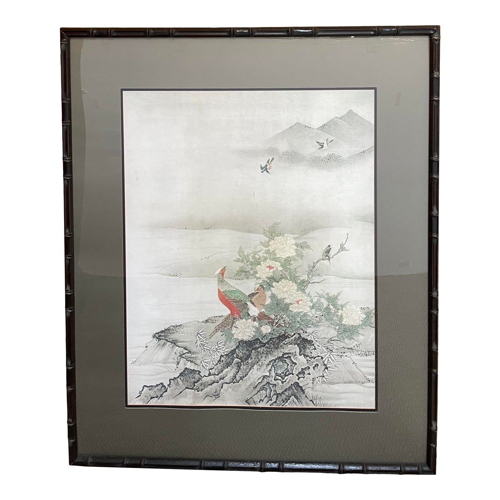 Design Plus Gallery presents a Vintage Japanese Print. An ethereal image that barely constains all the subtle action contained in the tableu. The flora against a beautiful landscape depicts a fierce scene played out in nature. Professionally matted and framed in black-finished faux bamboo.