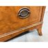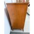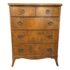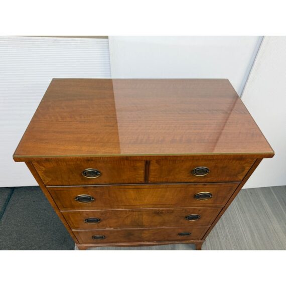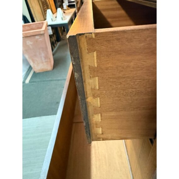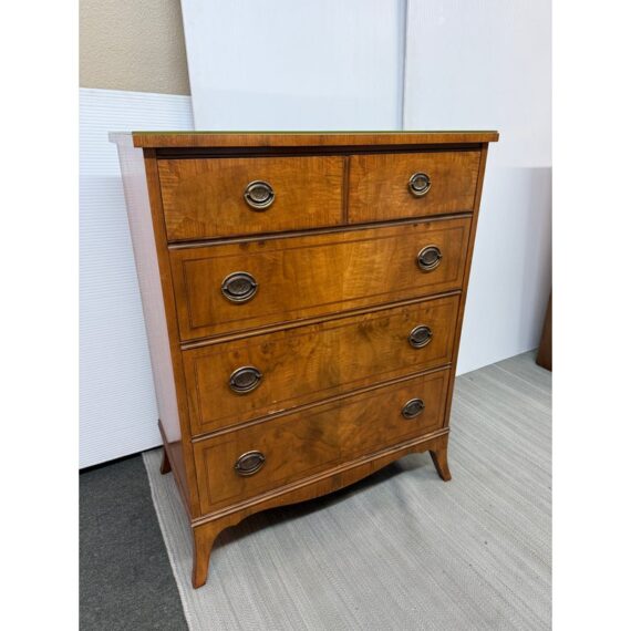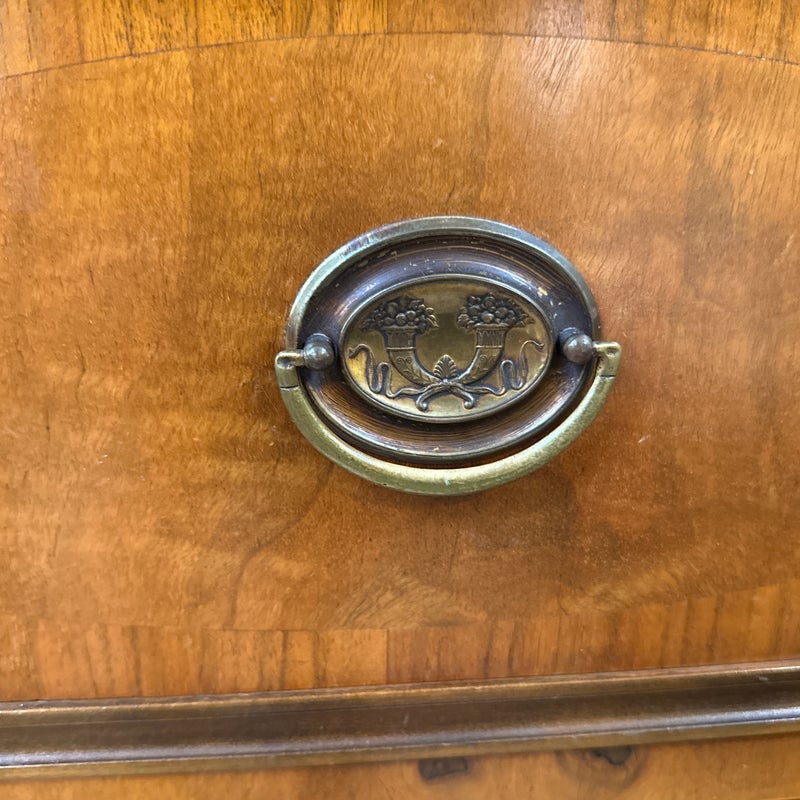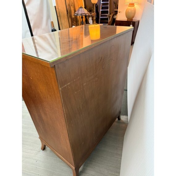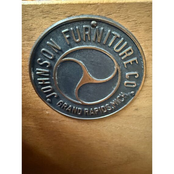 Design Plus Gallery presents a Vintage Four Drawer Dresser from Johnson Furniture Co. The dresser has a distinctive bowed front to give the piece a graceful contour to its sturdy silhouette. The drawers have Hepplewhite pulls in a bronze finish. There is a custom cut glass surface protector to preserve the wood’s beauty and as a low-maintenance solution for display or use. In good condition visible a minor wear. Made in Grand Rapids, Michigan, USA.