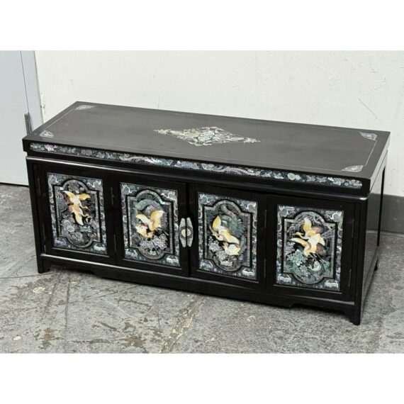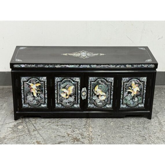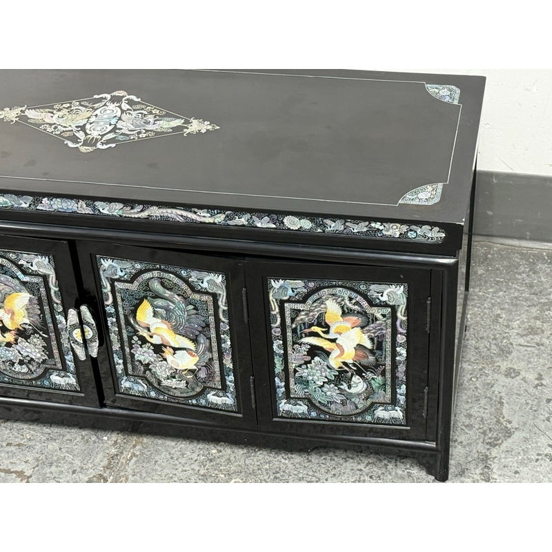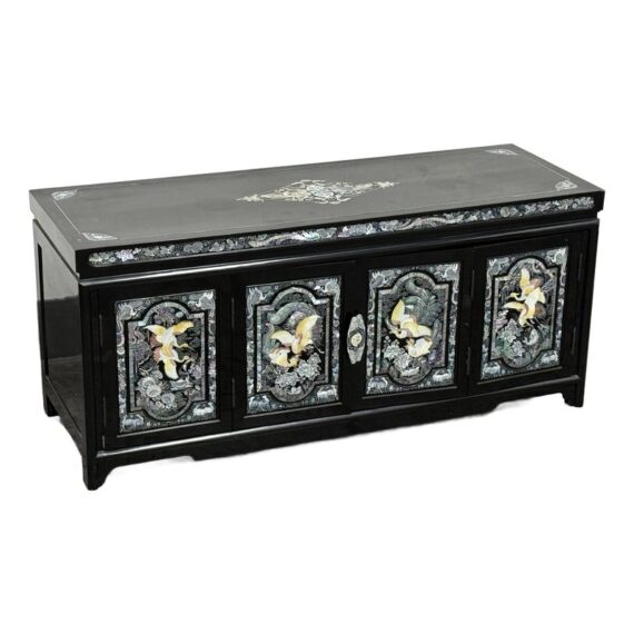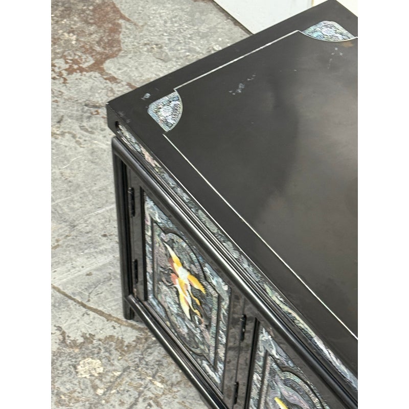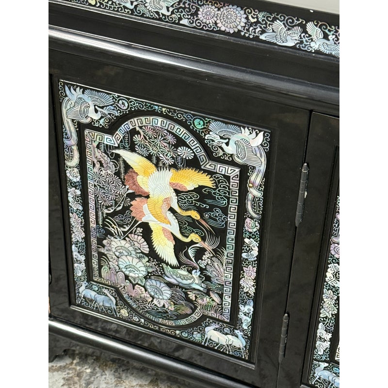 Design Plus Gallery presents a Black Lacquered with Mother of Pearl Detailed Inlaid Scholar Chest from 1970’s Korea. There are dual bi-foldable doors behind which is a spacious book storage area with four side by side drawers above. The drawers are decorated with florals and cranes, symbolizing marital harmony, longevity + wealth. Mother of Pearl over black lacquer create a micro-mosaic of inlay. The cabinet is in good condition for its vintage age + use.