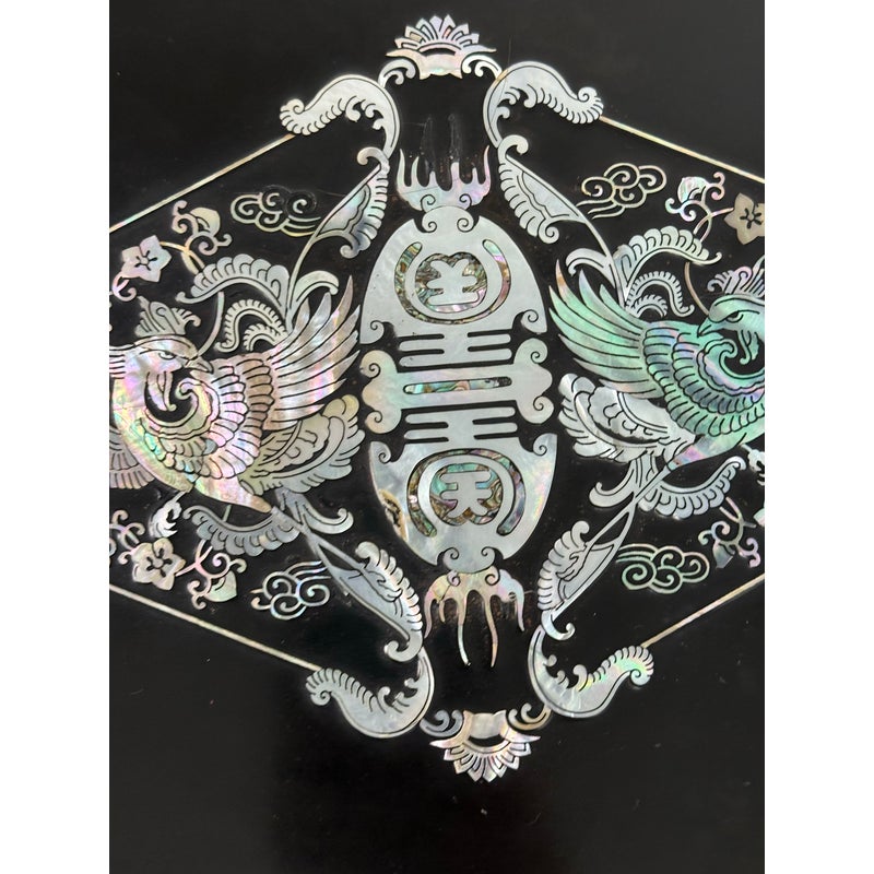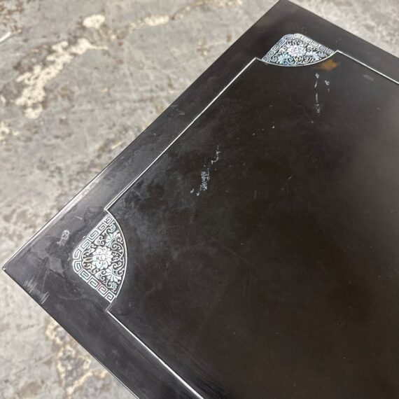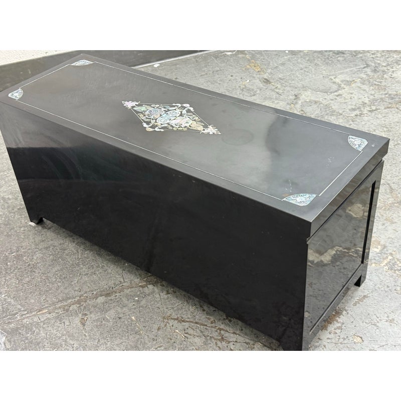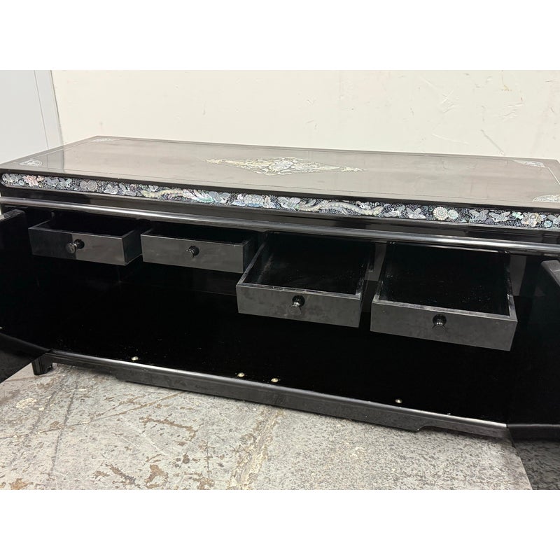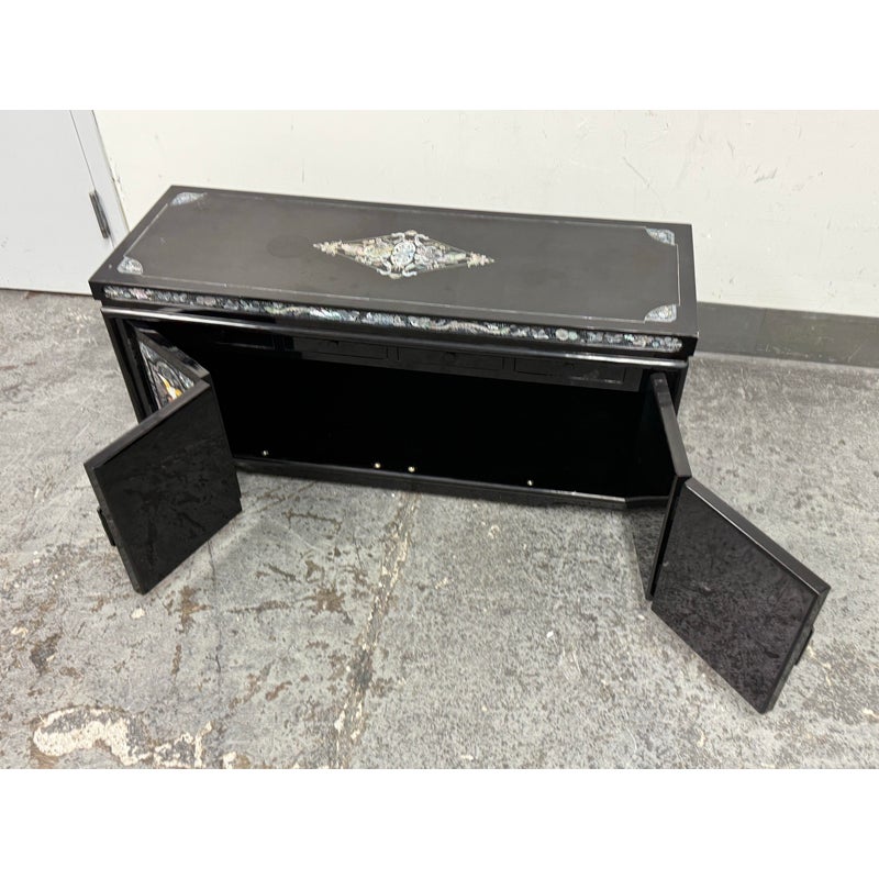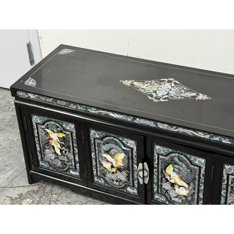 Design Plus Gallery presents a Black Lacquered with Mother of Pearl Detailed Inlaid Scholar Chest from 1970’s Korea. There are dual bi-foldable doors behind which is a spacious book storage area with four side by side drawers above. The drawers are decorated with florals and cranes, symbolizing marital harmony, longevity + wealth. Mother of Pearl over black lacquer create a micro-mosaic of inlay. The cabinet is in good condition for its vintage age + use.