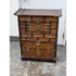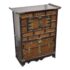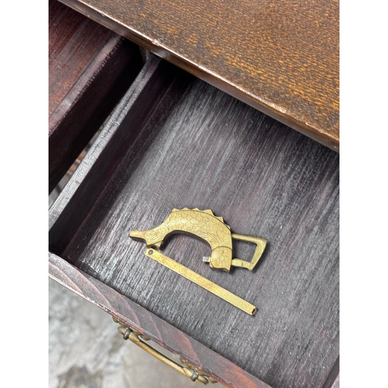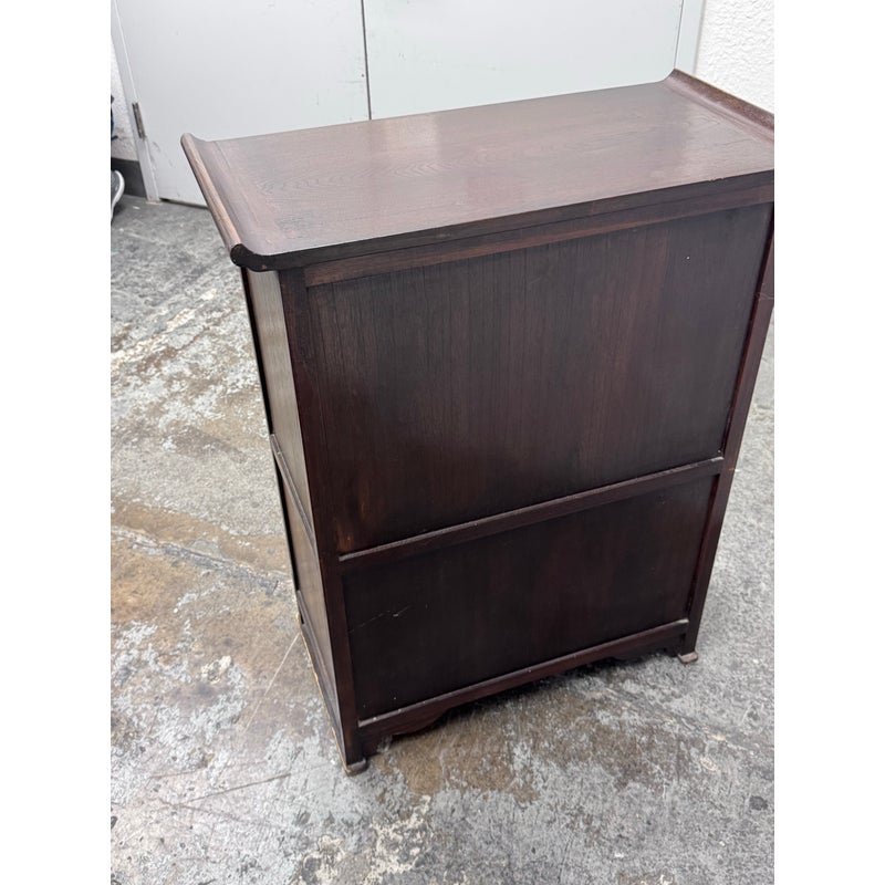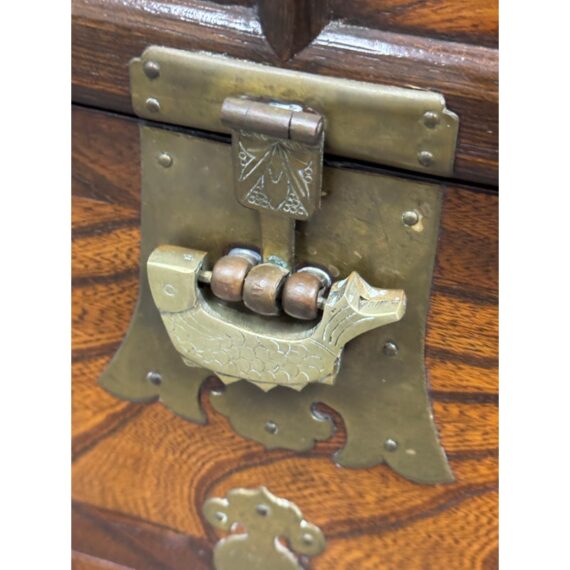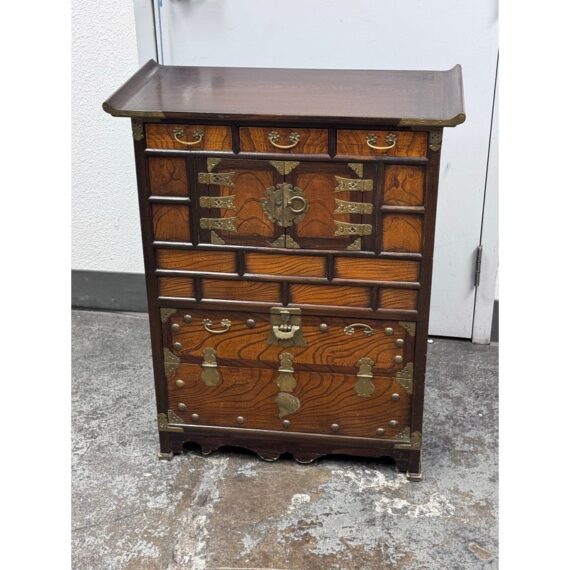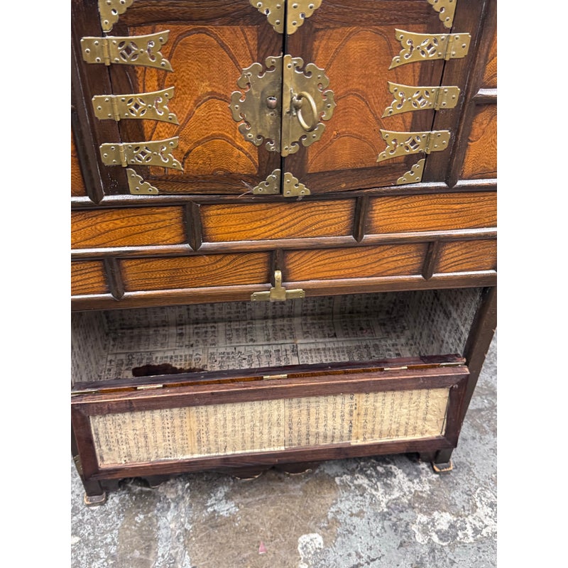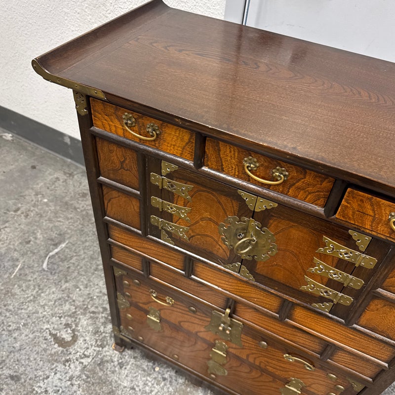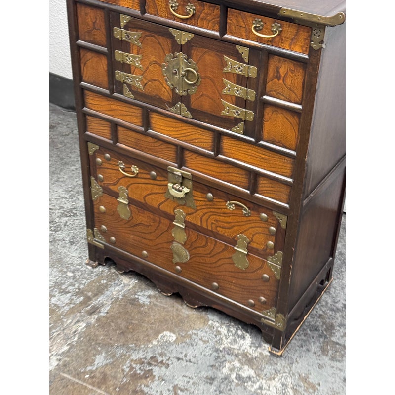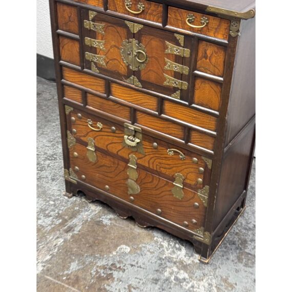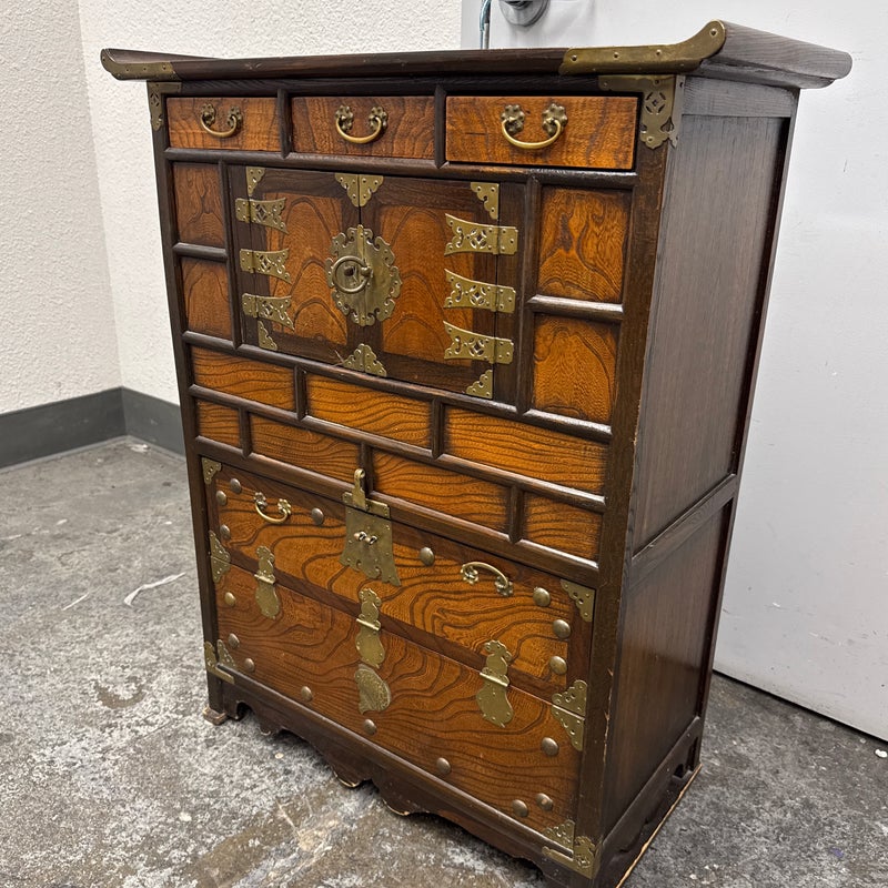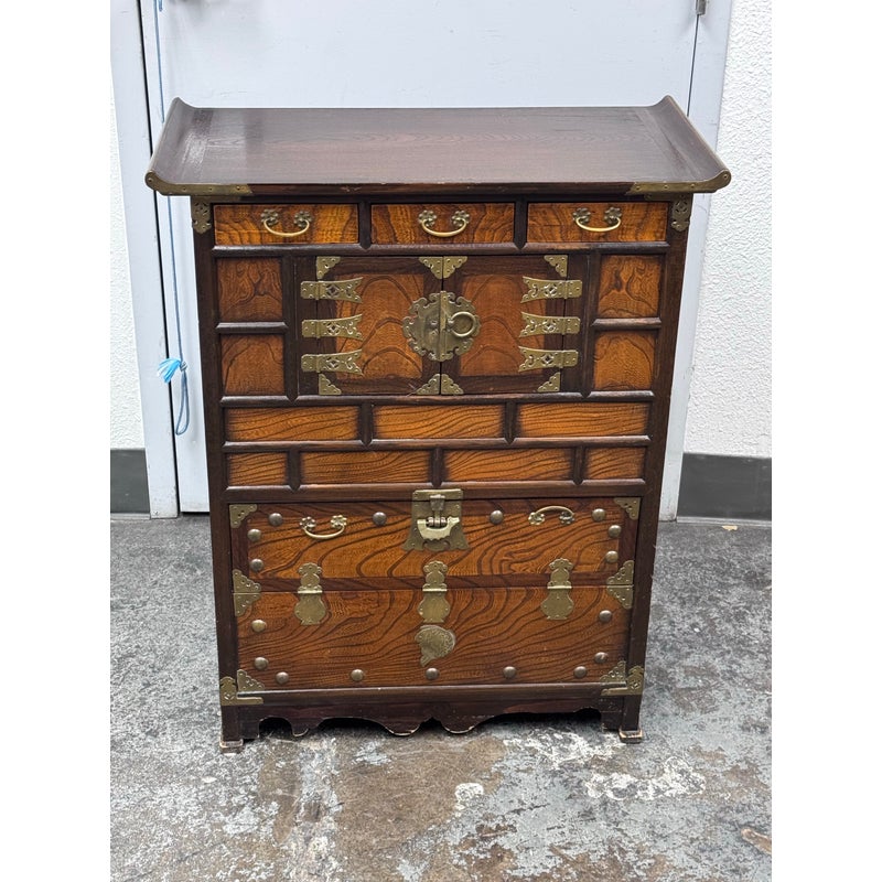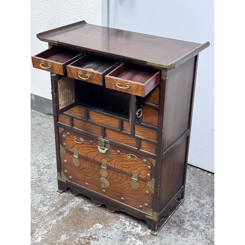 Design Plus Gallery presents a Vintage Korean Tansu with Original Hardware. The cabinet dates back to the early to mid 1900s. The surface has a raised lip and the top along with the sides and other frame work have a deeper tone of wood. The drawers and cupboards that are front facing are in a burl wood with a rich caramel tone. There are three top drawers, a center cabinet door area that opens to an inner cavity space. The lower cupboard door opens downward for lower cabinet storage space. There is Korean scripted rice paper inside both cupboard areas. Locking pin keys + brass hardware are all original. The tansu is splendid and in good condition for its decades old age.