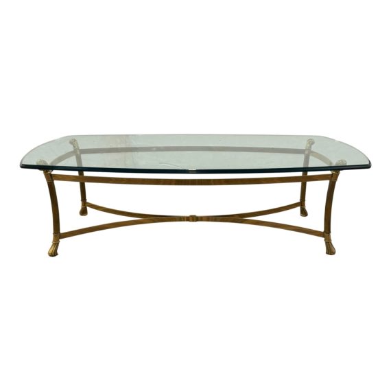 Design Plus Gallery presents a Vintage LaBarge Style Coffee Table. Nearly oval-shaped glass with deviated corners. Glass has beveled edges. The frame is a gold brass with hook feet, minimal engravings. Is in good condition with minimal signs of wear.