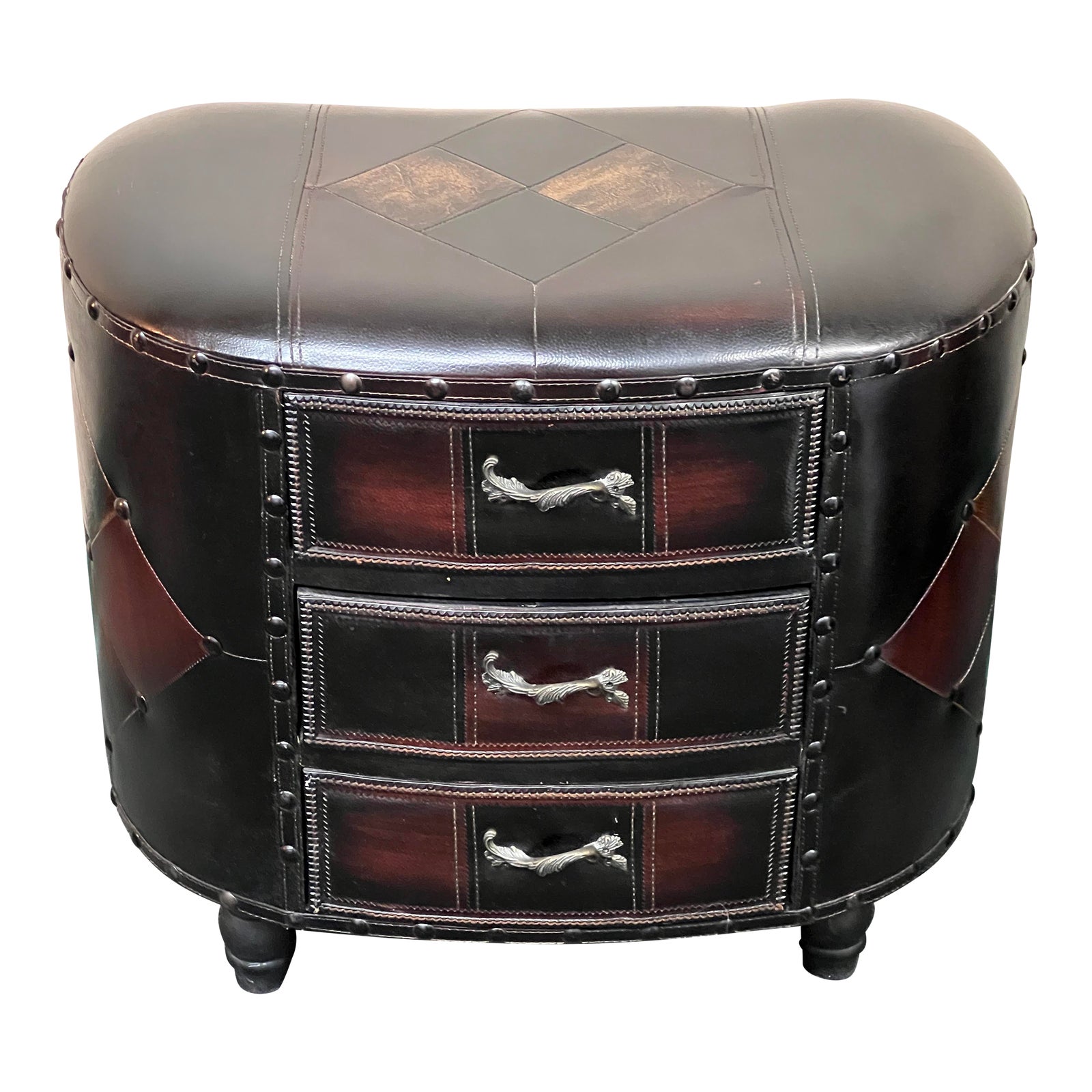 Design Plus Gallery presents a Vintage Leather Storage Stool. Seventies style leather patchwork wraps this charming stool. Three shallow drawers with brass handles are perfect for remotes, magazines etc. Light evidence of wear; overall good condition