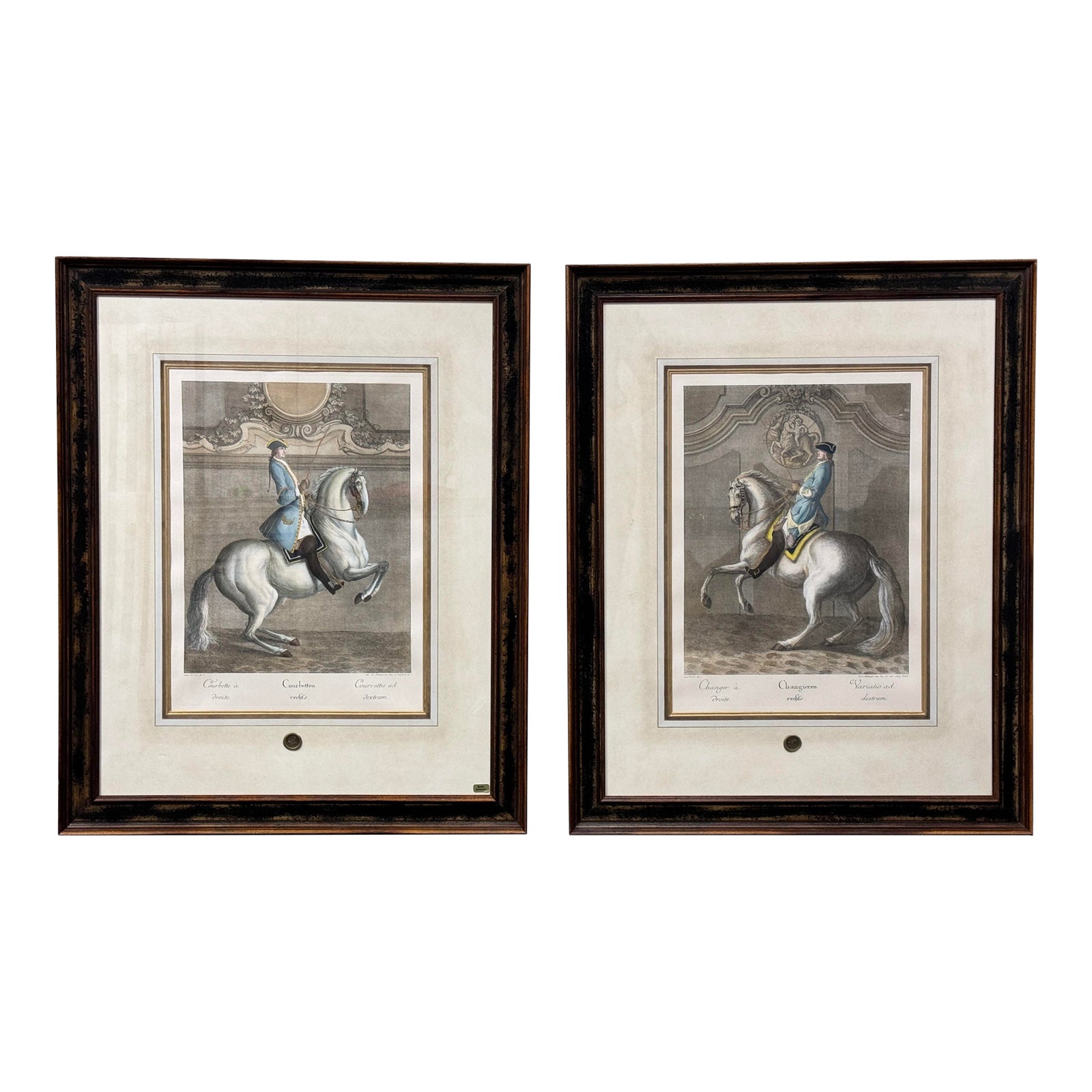 Design Plus Gallery presents a Pair of Artworks Depicting a Rare Breed of Horse, the Lipizzaner Stallions. The pair represent Courbette and Croupade, riding abilities that the horses are trained in. With the courbette, the horse raises its forehand off the ground, tucks up forelegs evenly, and then jumps forward, never allowing the forelegs to touch down, in a series of “hops”. Extremely strong and talented horses can perform five or more leaps forward before having to touch down with the forelegs, although it is more usual to see a series of three or four leaps. In the capriole (meaning leap of a goat), the horse jumps from a raised position of the forehand straight up into the air, kicks out with the hind legs, and lands more or less on all four legs at the same time. It requires an enormously powerful horse to perform correctly, and is considered the most difficult of all the airs above the ground. It is first introduced with the croupade, in which the horse does not kick out at the height of elevation, but keeps the hind legs tucked tightly under, and remains parallel to the ground. These drawings represent these tricks that the Lipizzaner are known to do and are accomplished with. Both the drawings have a seal crest under the drawing, within the first matte within the frame. Both are in good condition with minimal wear.
