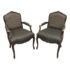 Design Plus Gallery presents a Pair of Striped Louis XV Style Chairs, Distressed. Carved accents at apron and feet with cabriole legs and a dark wood finish. The seat back is striped fabric with a striated gray seat rest. They show areas of use that are consistent with age. Would benefit with new upholstery.