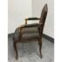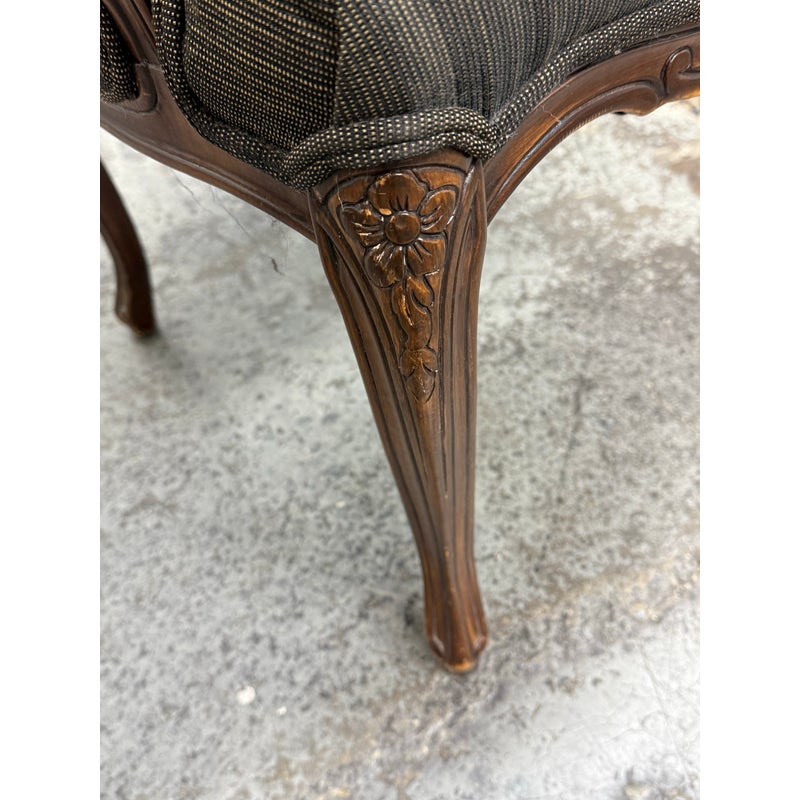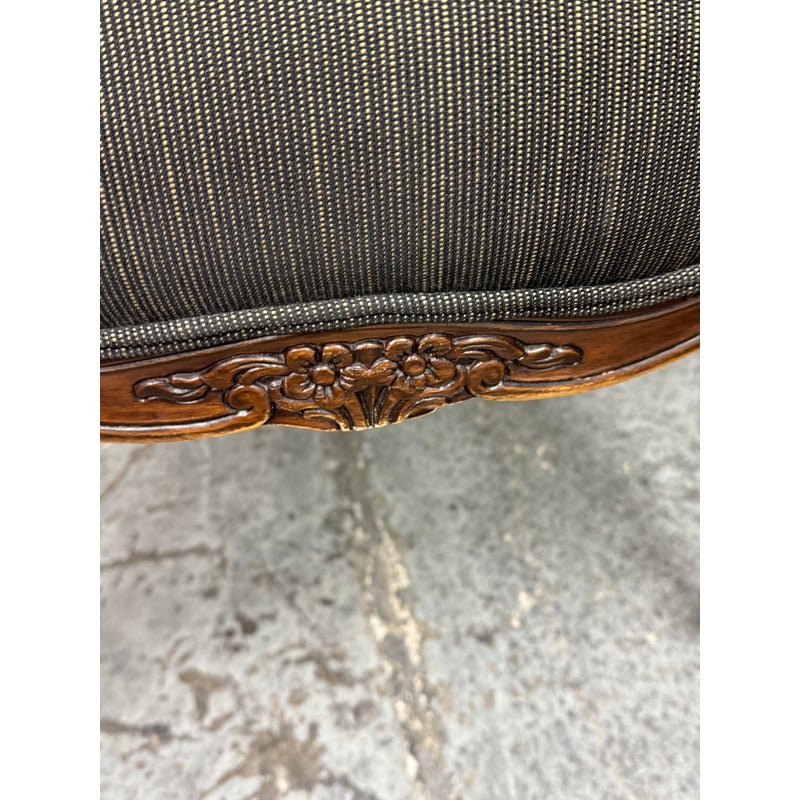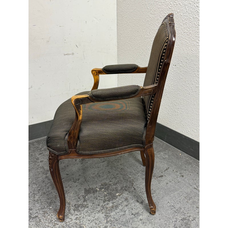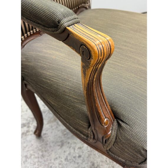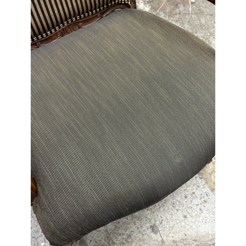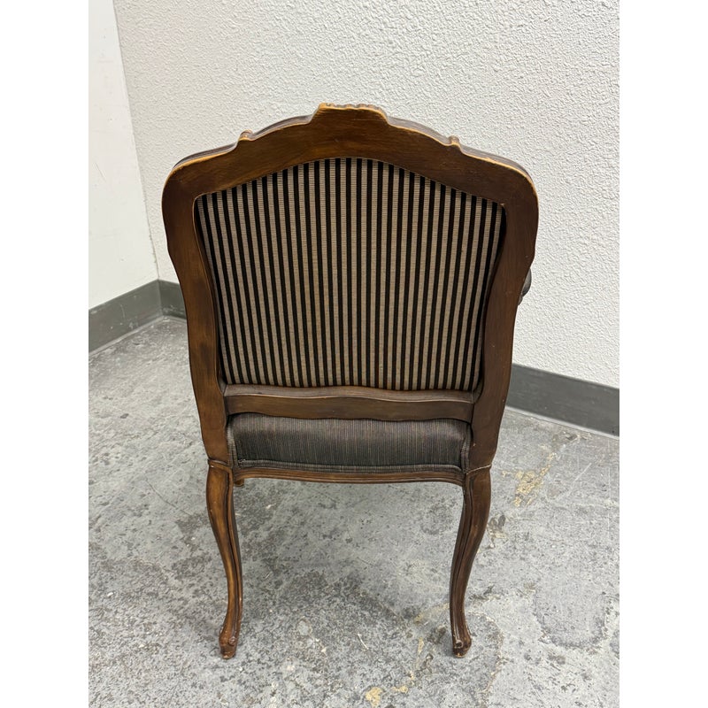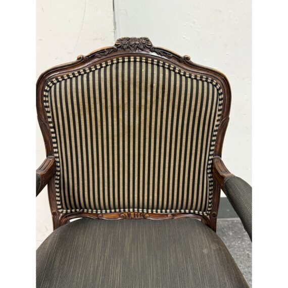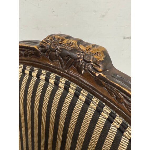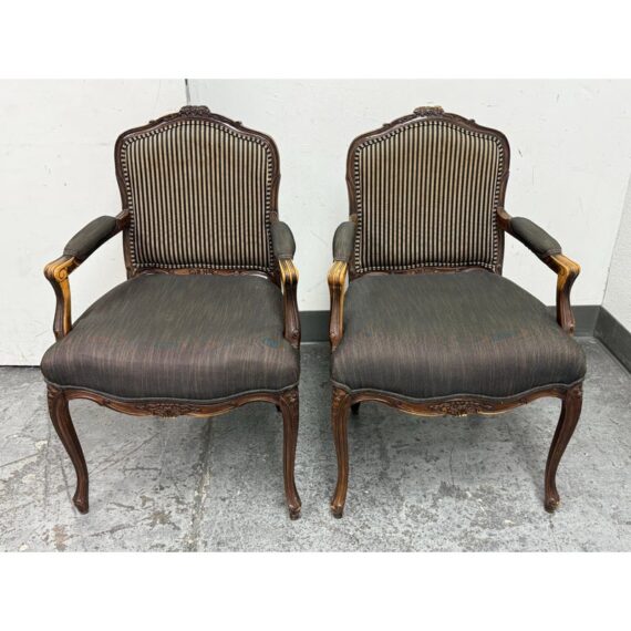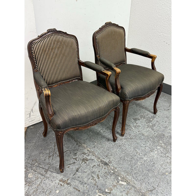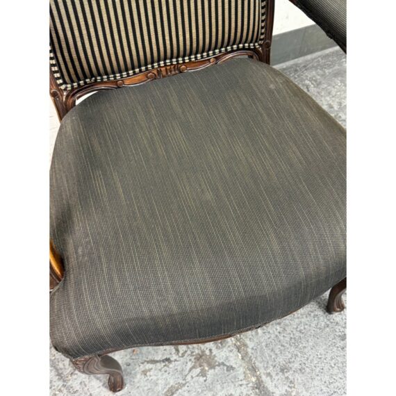Design Plus Gallery presents a Pair of Striped Louis XV Style Chairs, Distressed. Carved accents at apron and feet with cabriole legs and a dark wood finish. The seat back is striped fabric with a striated gray seat rest. They show areas of use that are consistent with age. Would benefit with new upholstery.