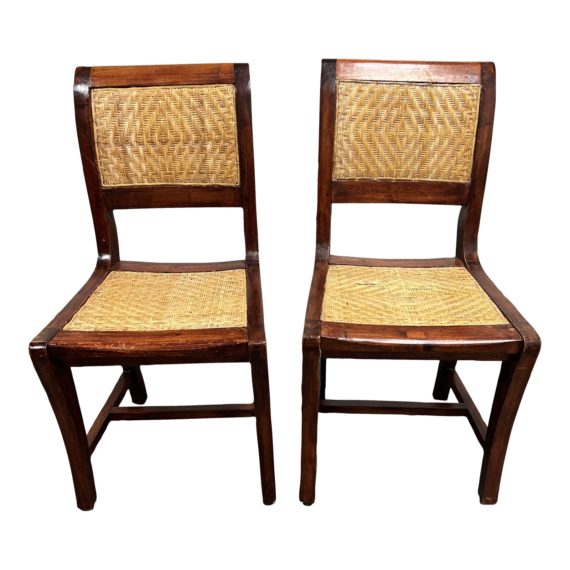 Design Plus Gallery presents a Pair of Vintage Side Chairs. Beautiful dark stained frames have subtle curves detailing the simple silhouette. Intricately woven natural rush patterns are inset in back and seat for contrast and organic support. Visible and minor evidence of surface wear, consistent with age and use.