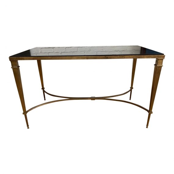 Design Plus Gallery presents a Vintage Marble Top + Brass Coffee Table. Minor wear on frame adds patina to vintage frame, good condition. Thin brass base anchors sleek & classic black marble top.