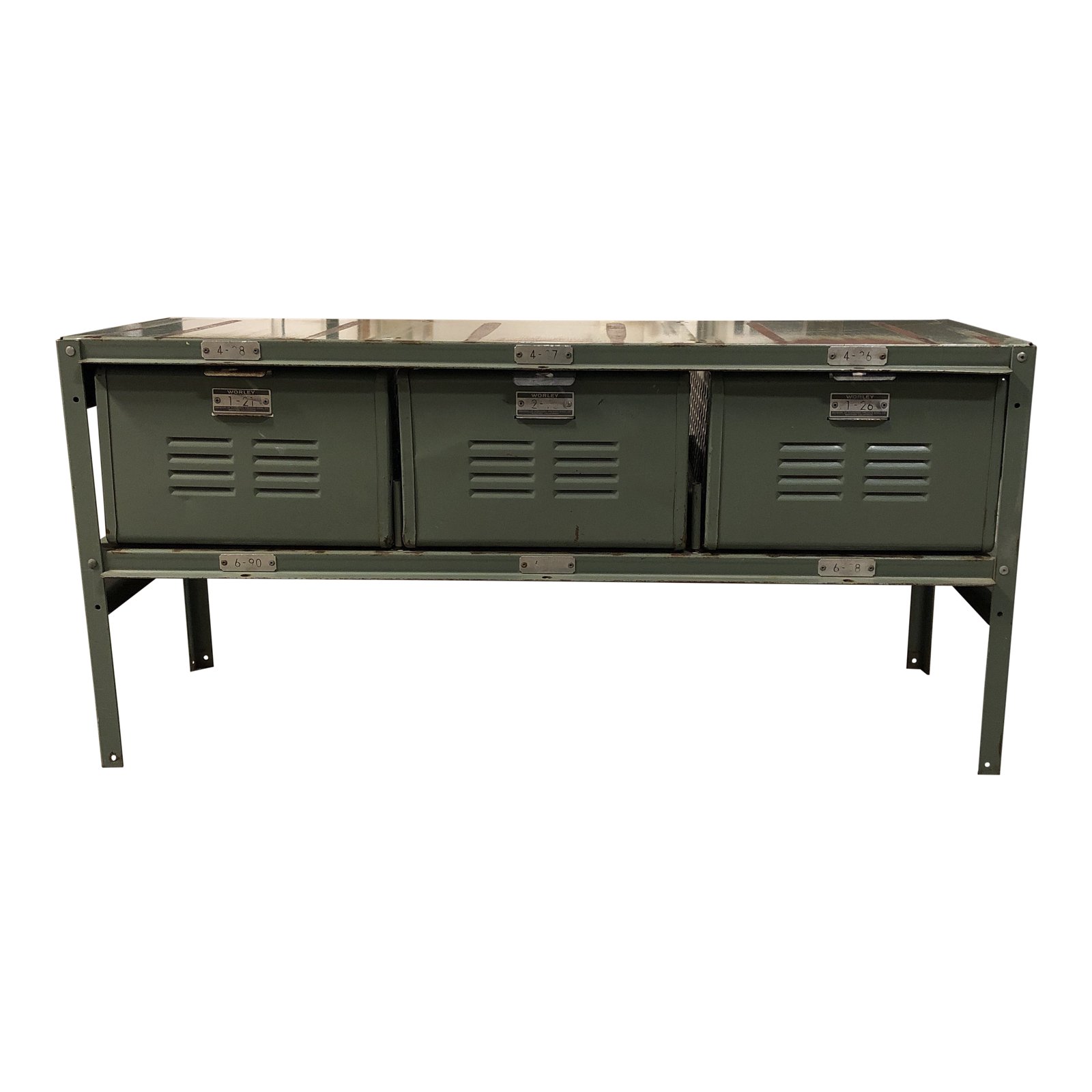 Design Plus Gallery presents a vintage three drawer storage. An Industrial beauty that is entirely constructed with metal in a mudded green finish. Three pullout drawers with circular cutouts. Once apart a two piece, and now a stand alone piece. Natural aging and distressed on frame and surface. Possibly once in a locker room or industrial factory.