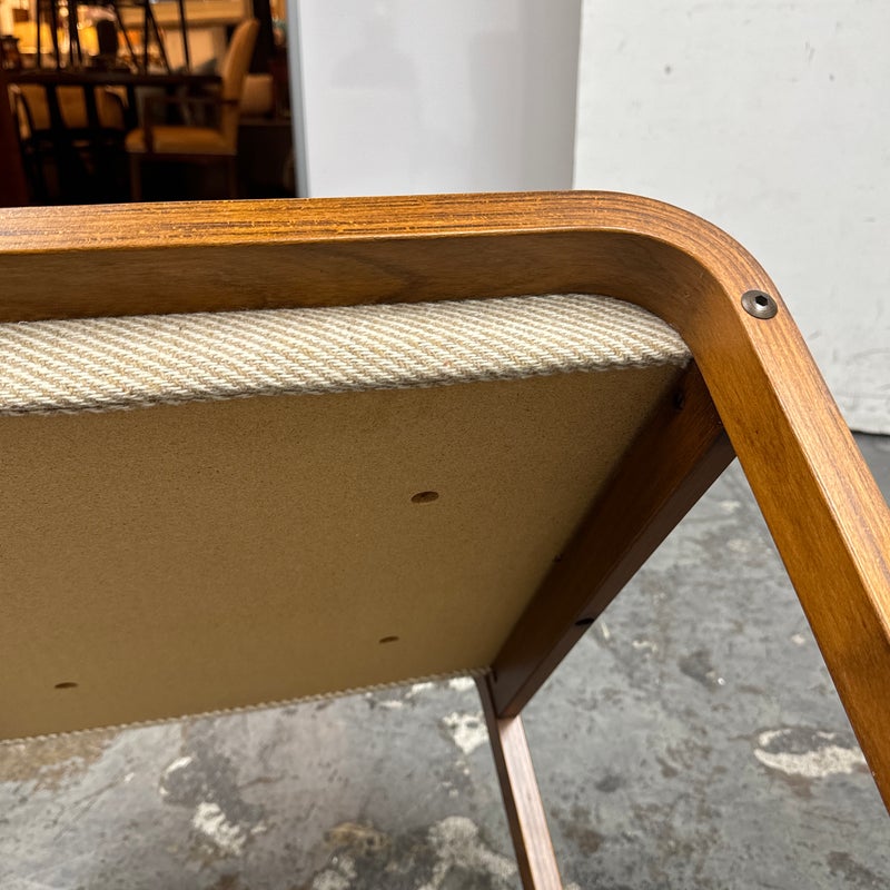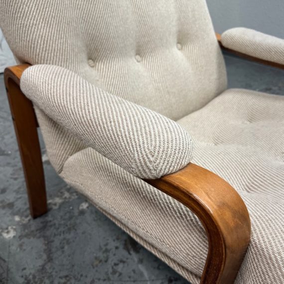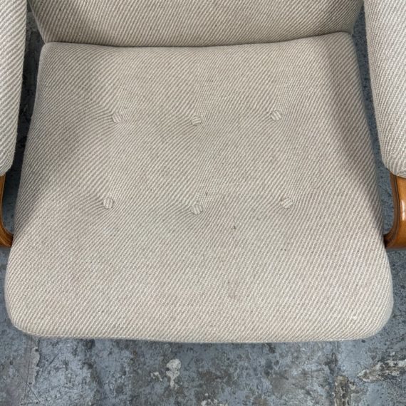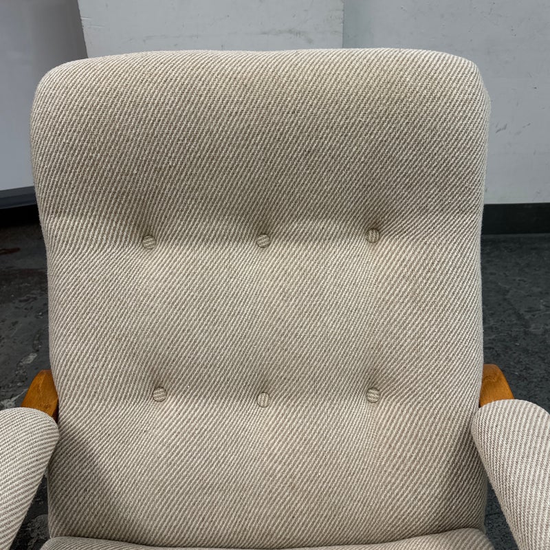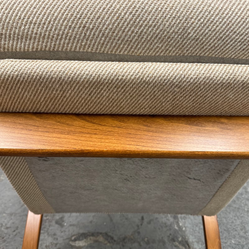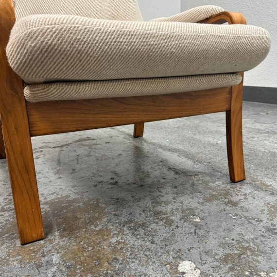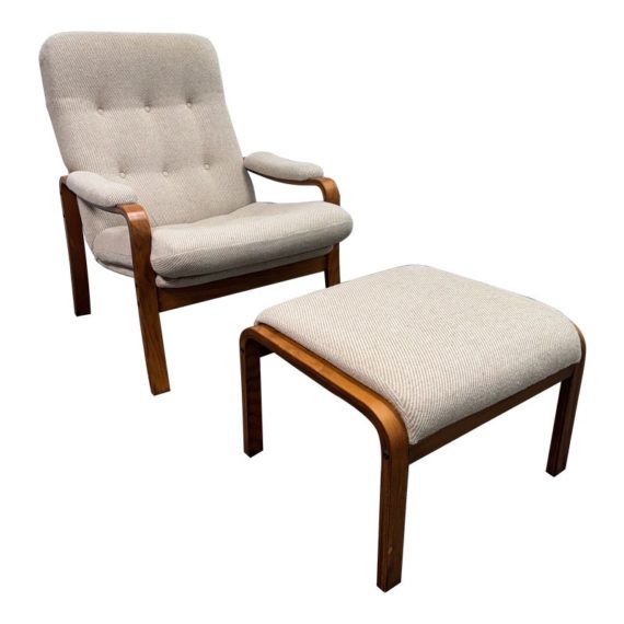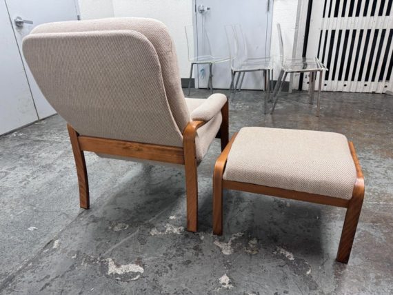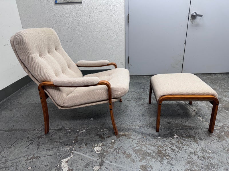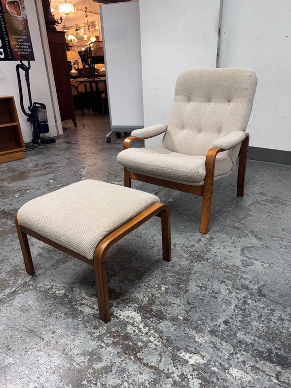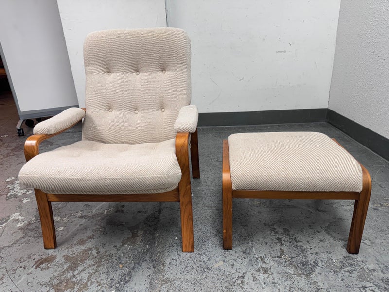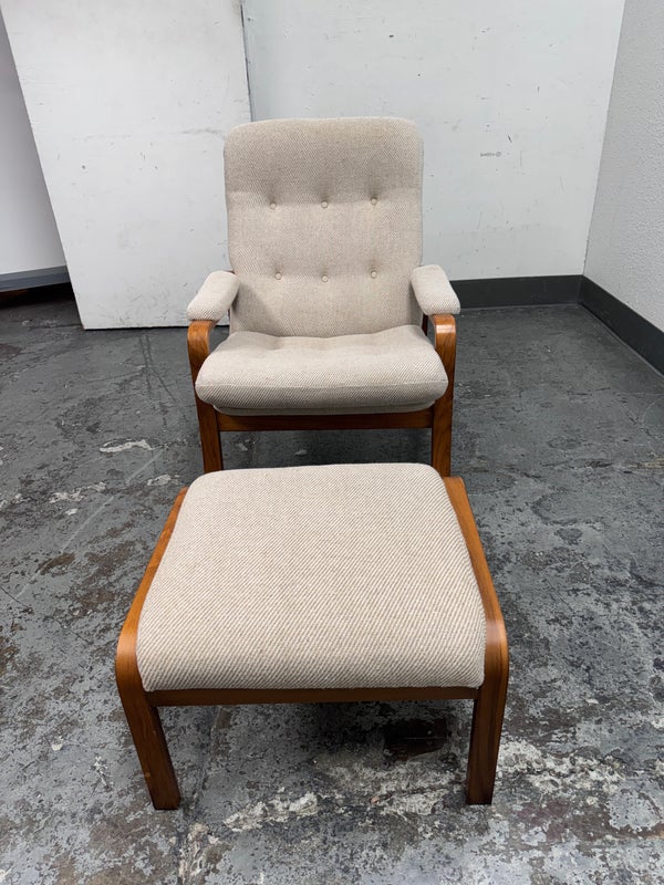 Design plus Gallery presents a Nice Mid Century Modern Danish Teak Wood Chair + Ottoman of Unknown Make. The chair has a solid teak wood frame with a woolen upholstery, both in neutral easy to add into any home where comfort and modern see eye to eye. Is in good condition with minimal signs of wear from age + use.