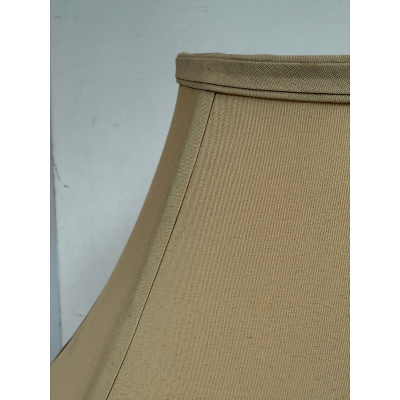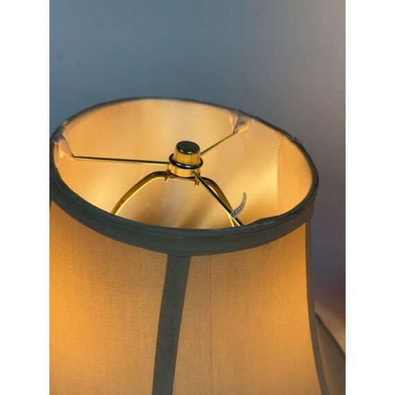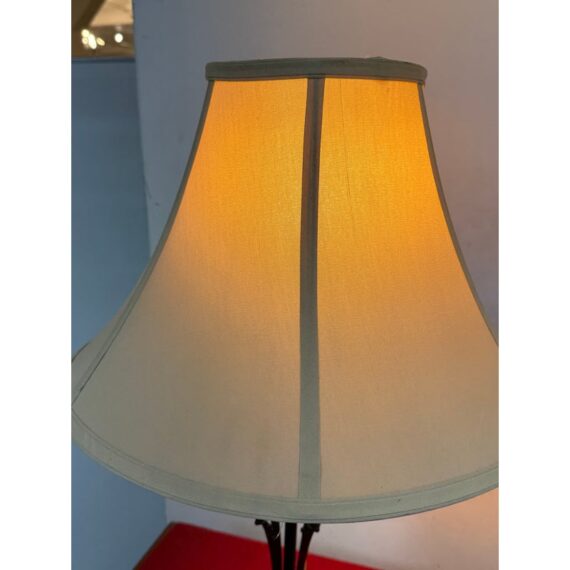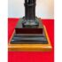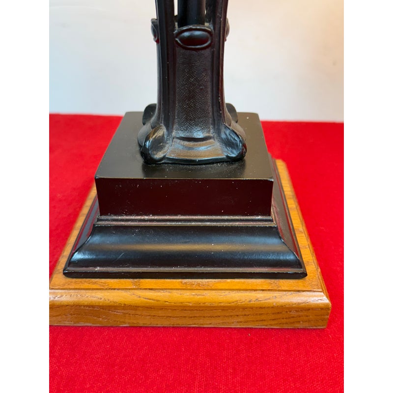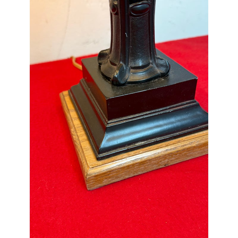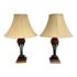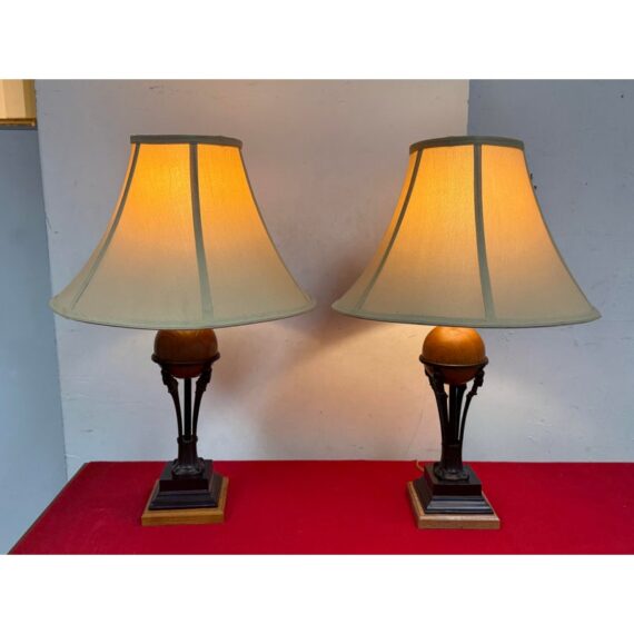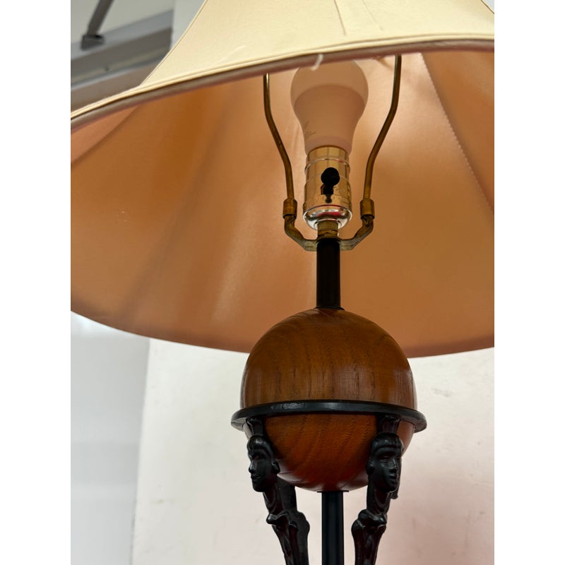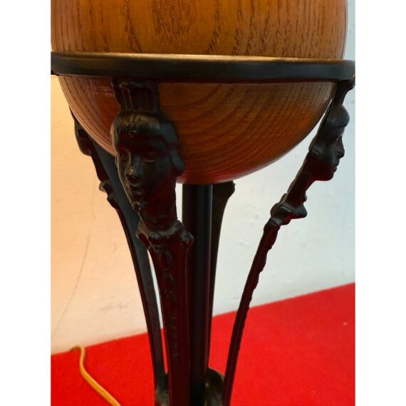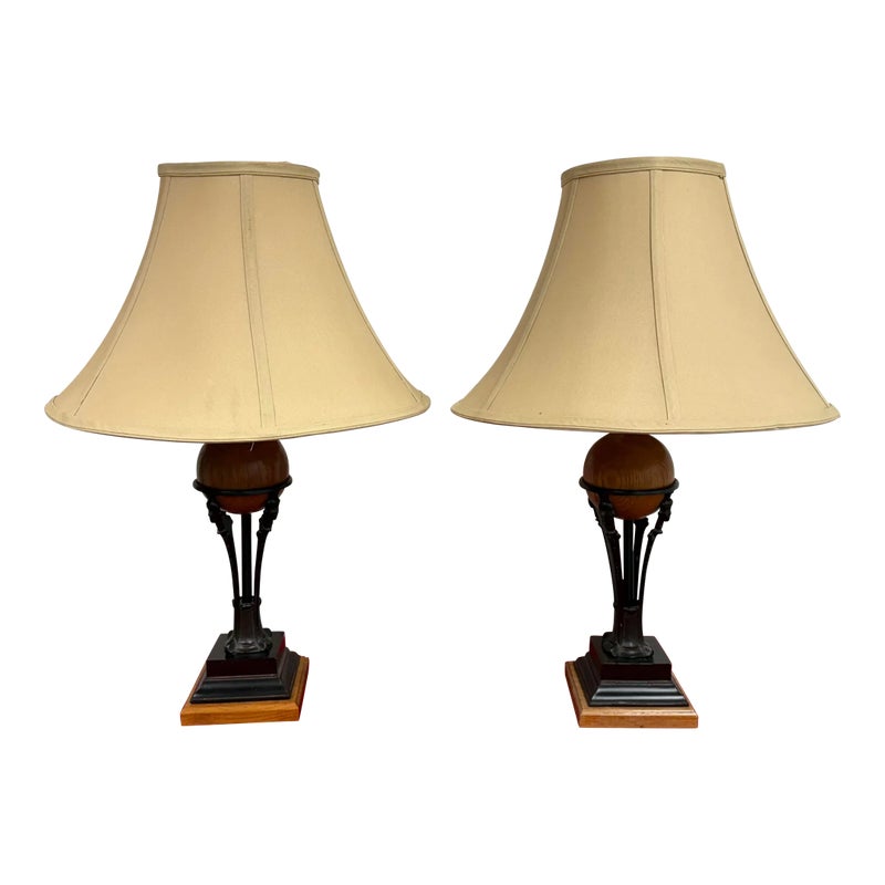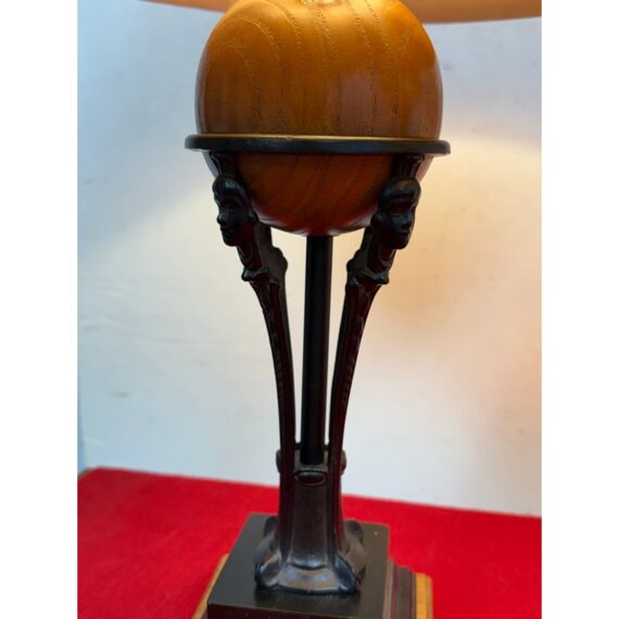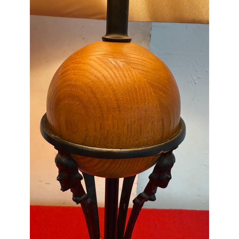 Desing Plus Gallery presents a Pair of Table Lamps from the Mid 20th Century by Robert Abbey. They have an Art Deco look and feel with their unusual plinth. A circular ring holds a smooth wooden ball with ladies faces on four points around the ring. The lamps are in a trophy shape with metal, wood and linen as their main components. They are in good condition with minimal wear for their usage.