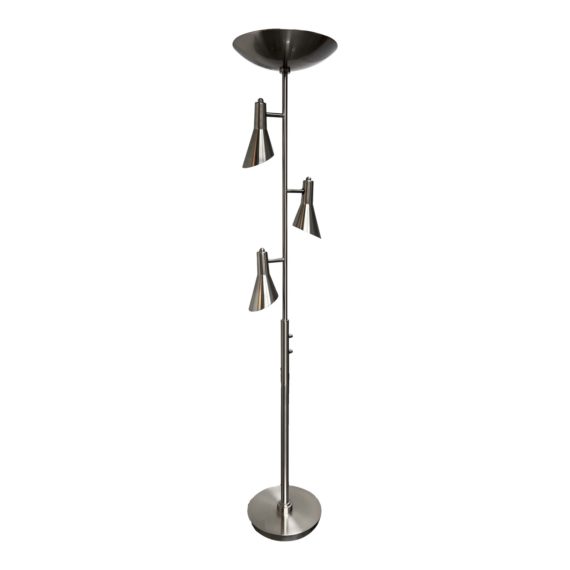 Design Plus Gallery presents a Vintage Mid Century Modern Chrome Adjustable Floor Lamp. This light has a total of four lights! One that sits at the very top that pushes out light from a bowl shape. The remaining three lights are resting on the stem of the light fixture and are adjustable in their directional output of light. Nobs on the stem turn the lights on and off plus there is a dimmer switch on the base. In good vintage condition with minor wear.