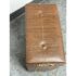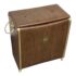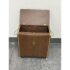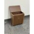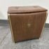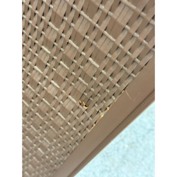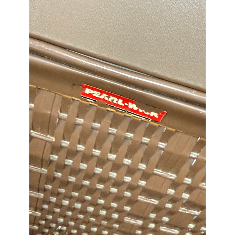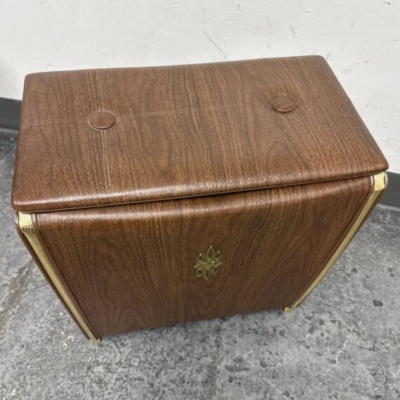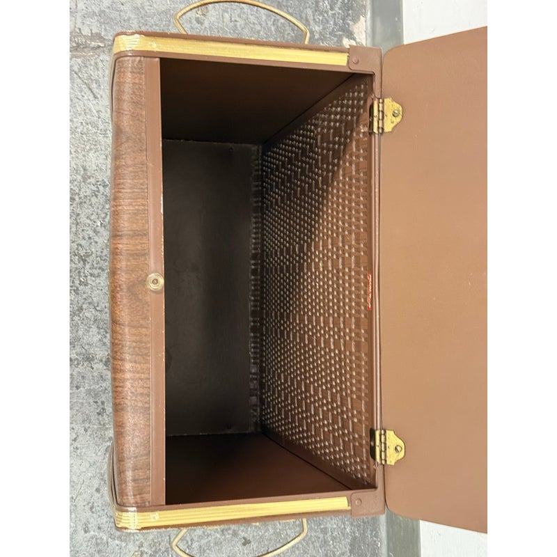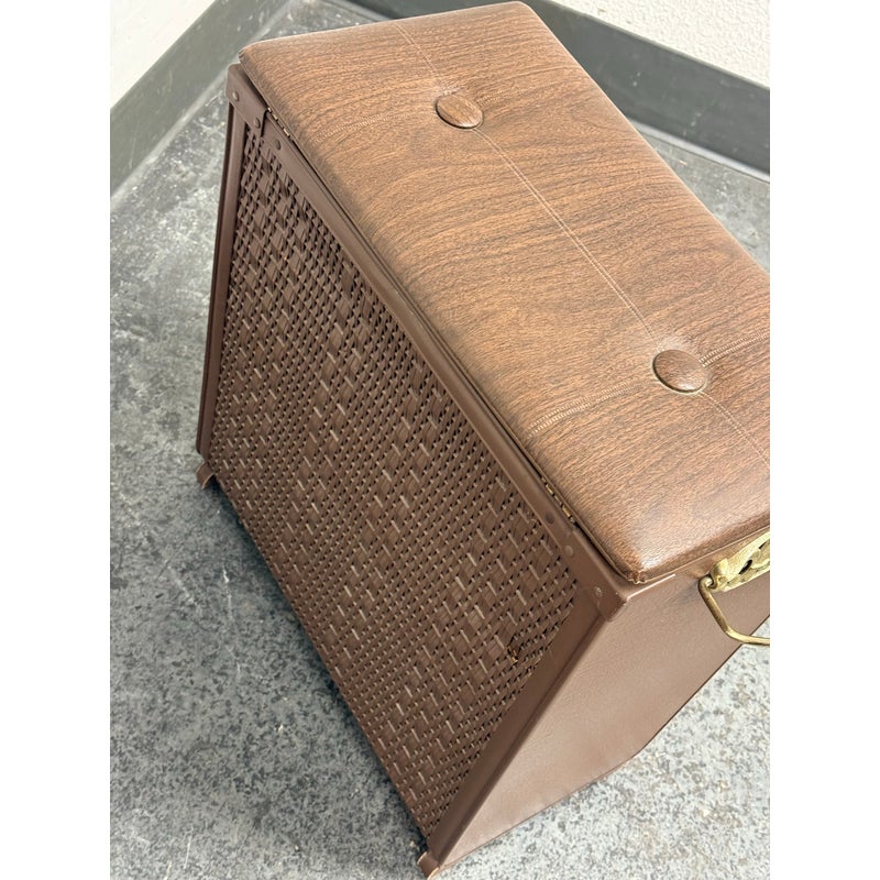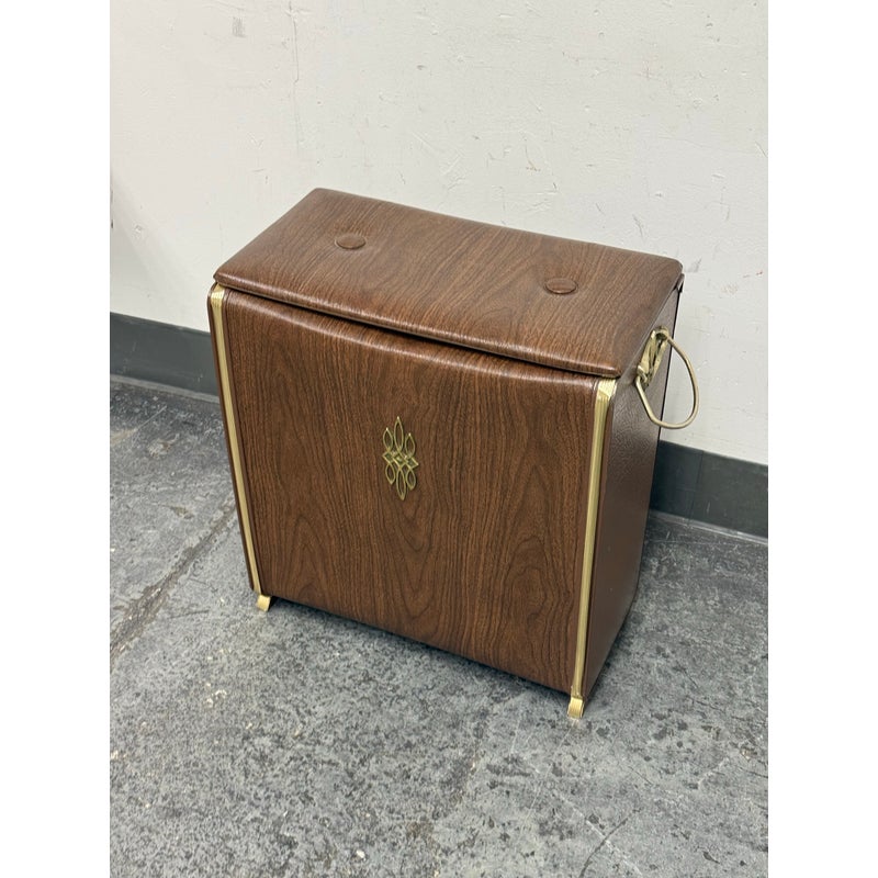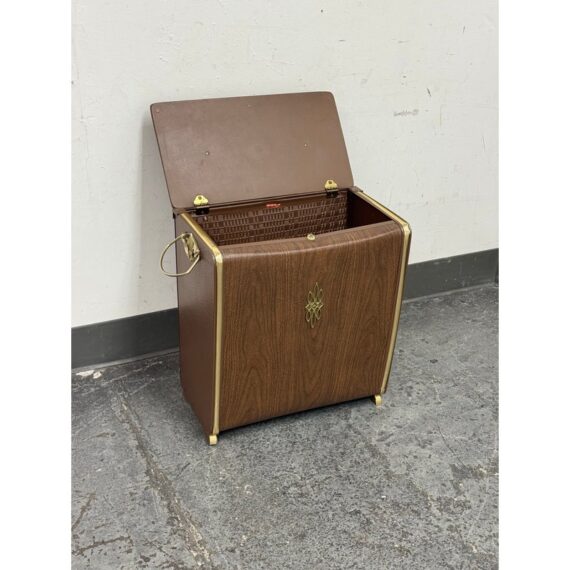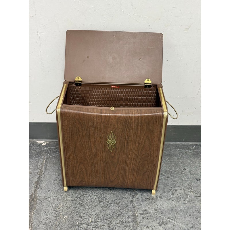 Design Plus Gallery presents a Wicker Mid Century Laundry Basket from the 1960s. The dark brown is vinyl and in the pattern of actual medium brown wood. Gold accents are found on the front and sides offering the look of a wooden treasure box. The back side is traditional for laundry baskets with a woven wicker in matching dark brown, allowing ventilation for the clothes to breathe. Has visible and minor breakage to the wicker but in good condition for its age + use.