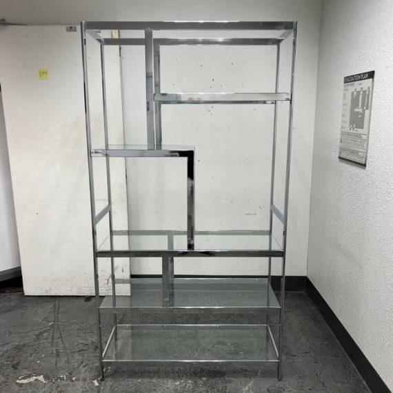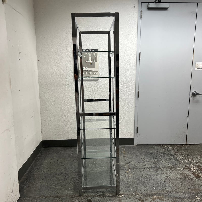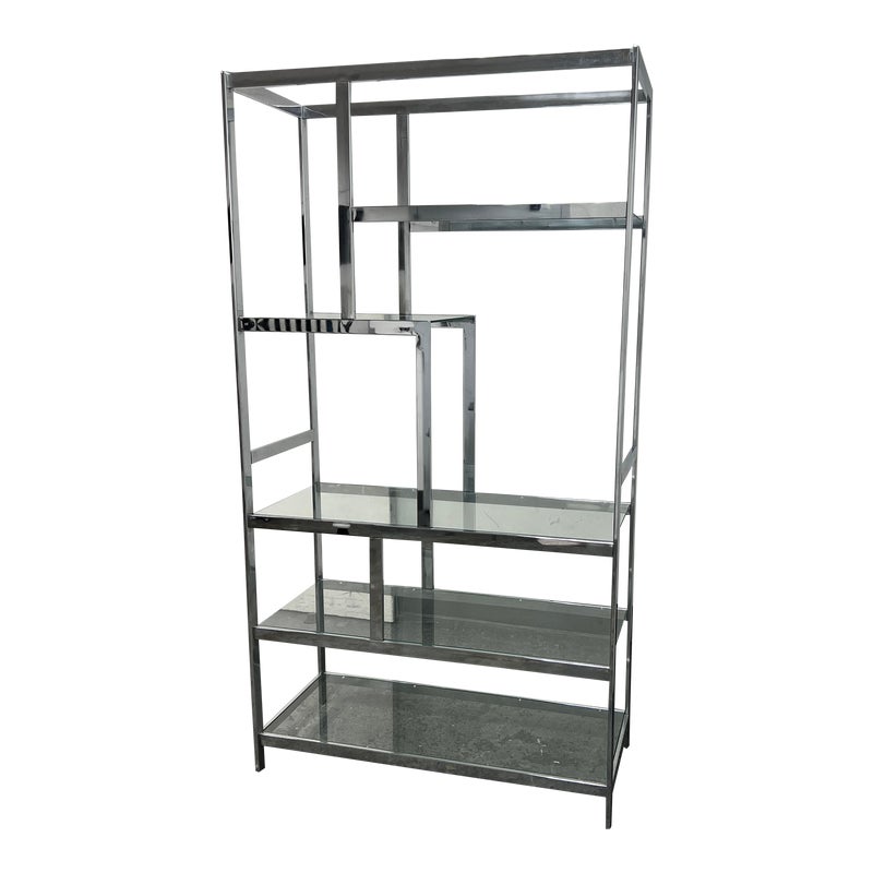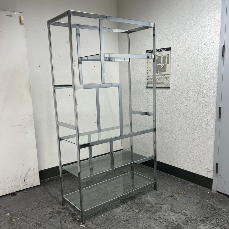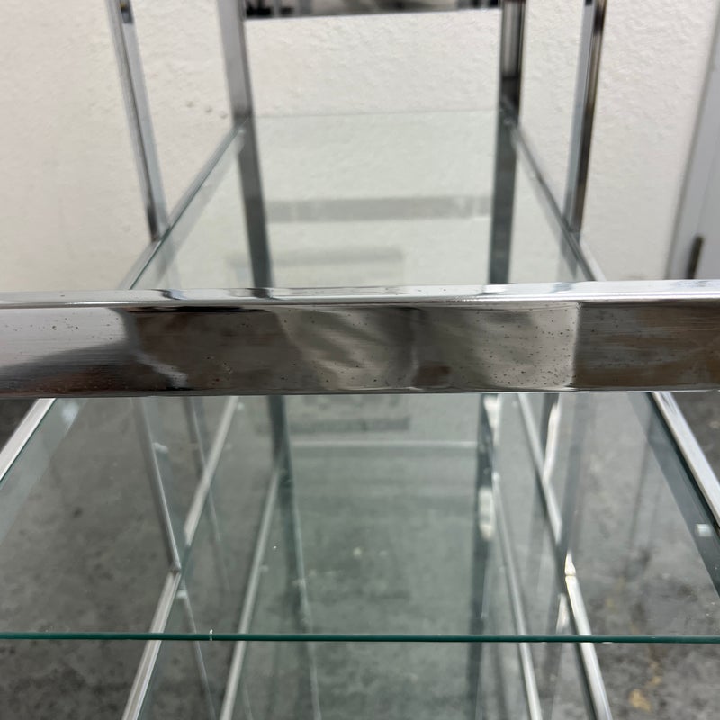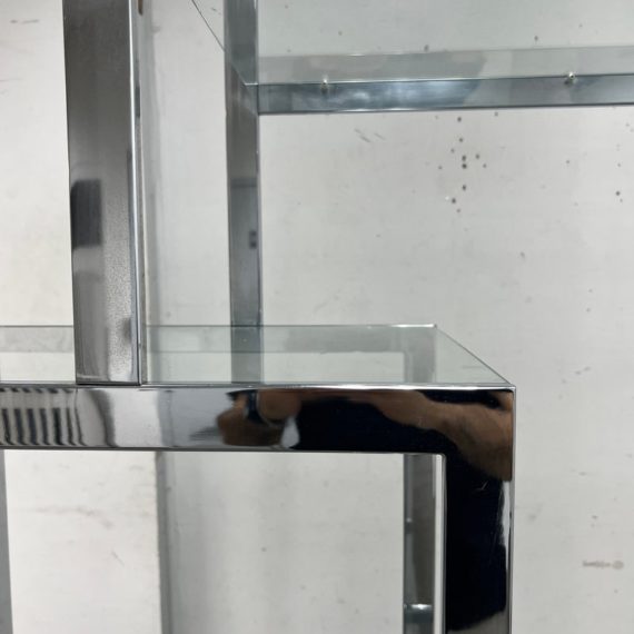 Design Plus Gallery presents a Vintage Etagere by Milo Baughman. A geometric metal frame with glass inserts. The frame has a chrome finish with natural patina. In good condition, visible and minimal wear from usage + age.