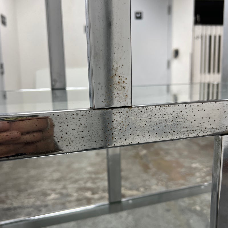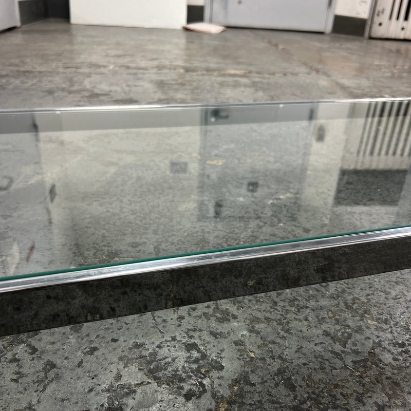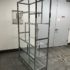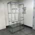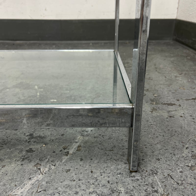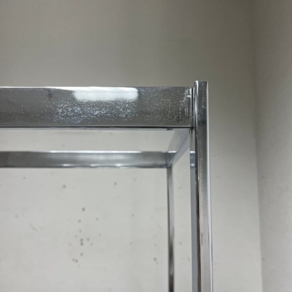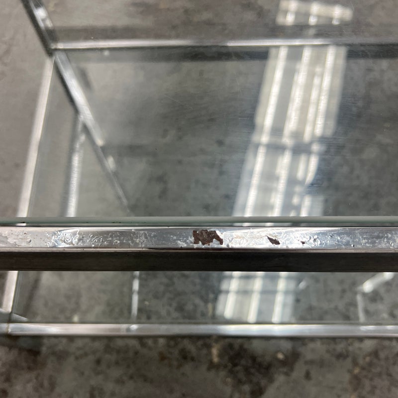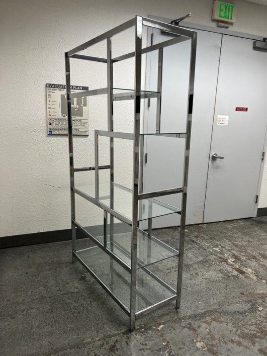 Design Plus Gallery presents a Vintage Etagere by Milo Baughman. A geometric metal frame with glass inserts. The frame has a chrome finish with natural patina. In good condition, visible and minimal wear from usage + age.